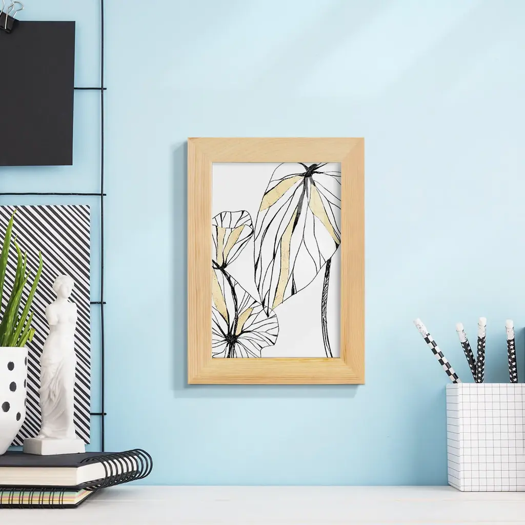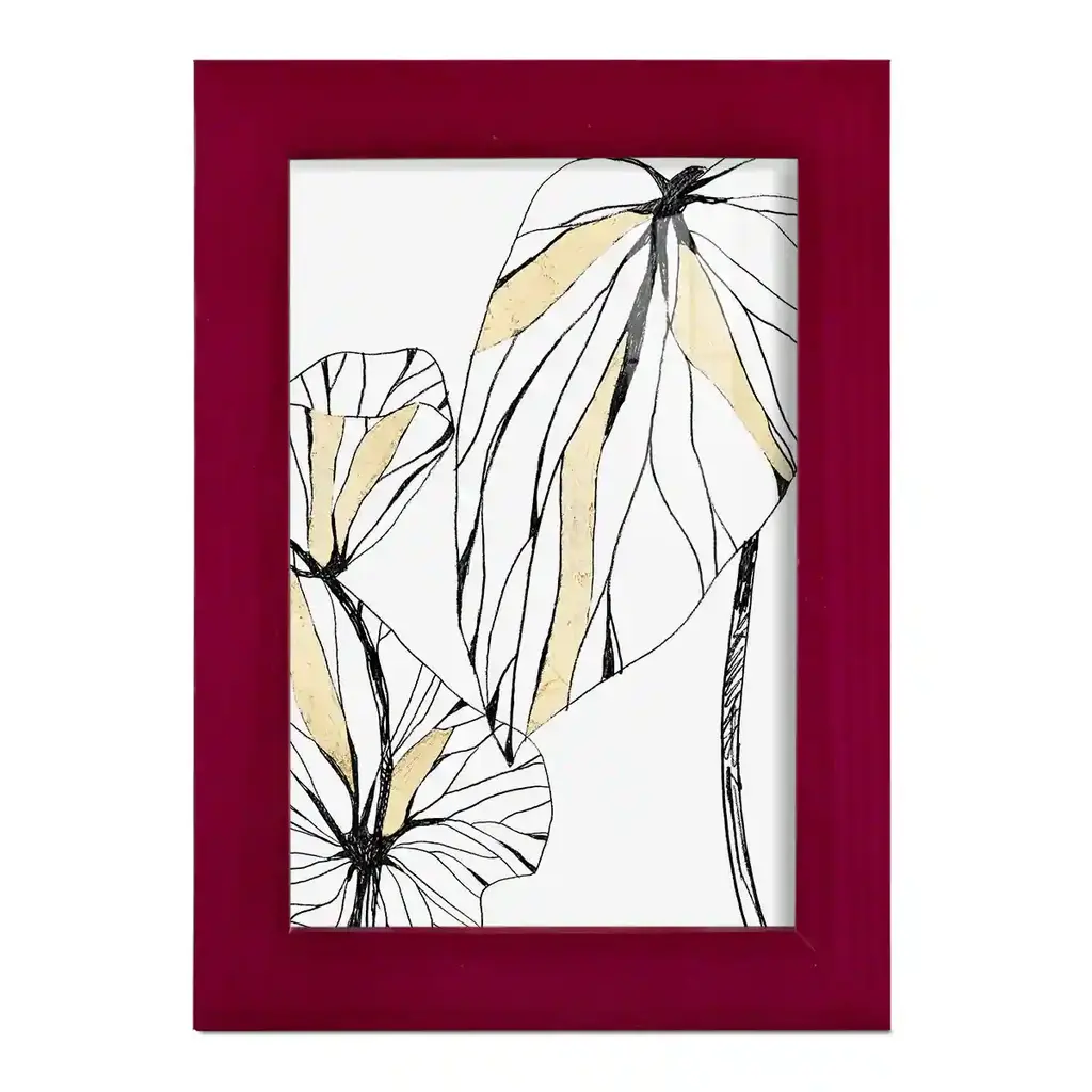 Linear Tropics with Gold II -EZ SWITCH Framed Print w/glass-Cherry Red A delightful, framed print. Featuring a solid wood frame with real wood glass. This premium print is giclee quality. In addition, every frame features a removable back and table top stand. This allows you to change your art in the future or to just stand the art on a table for a new look. We are sure you'll enjoy our new series of EZ SWITCH Framed Art. Solid Wood Frame Real Glass Removable / Replaceable Art Built in Tabletop Stand Sizes range from 4x6 up to 12x15 - buy just one or pair them up as sets as you see fit.