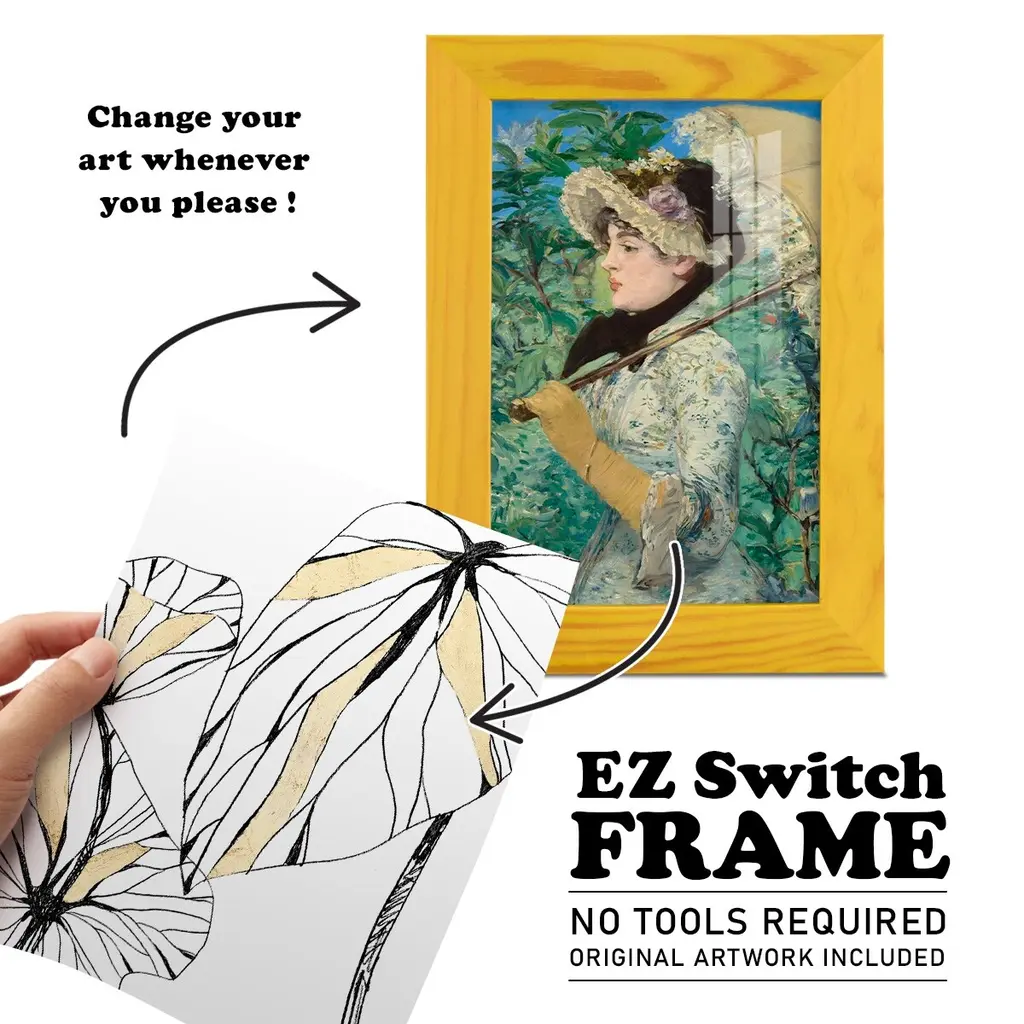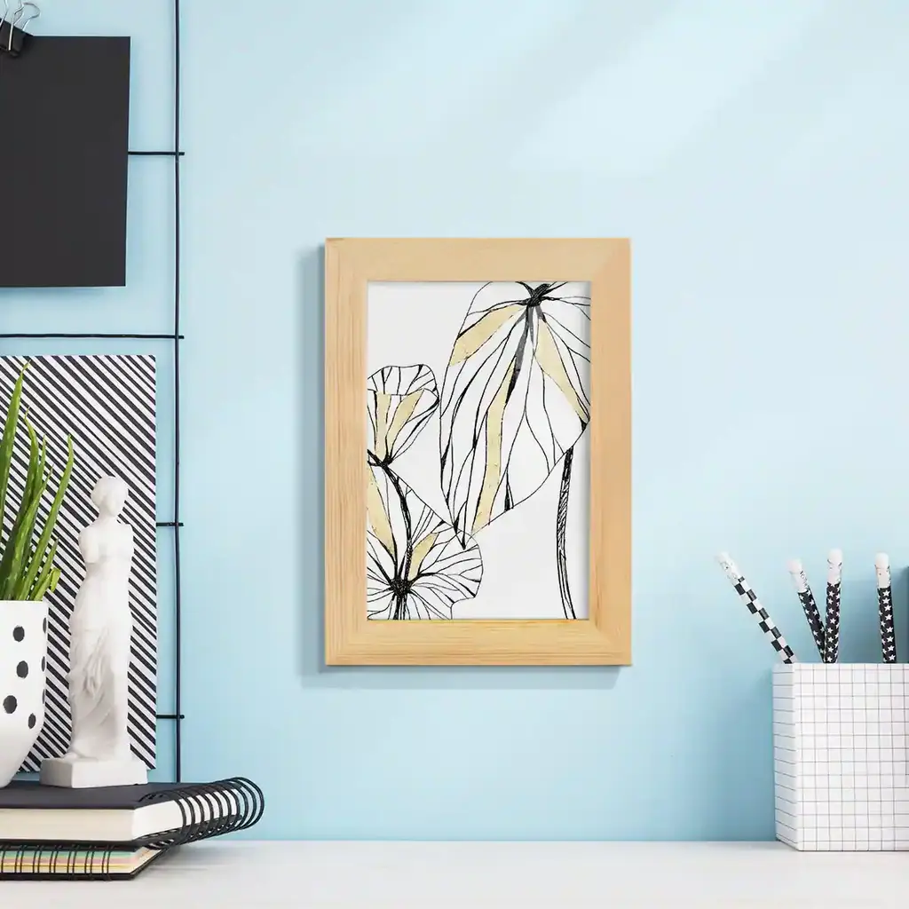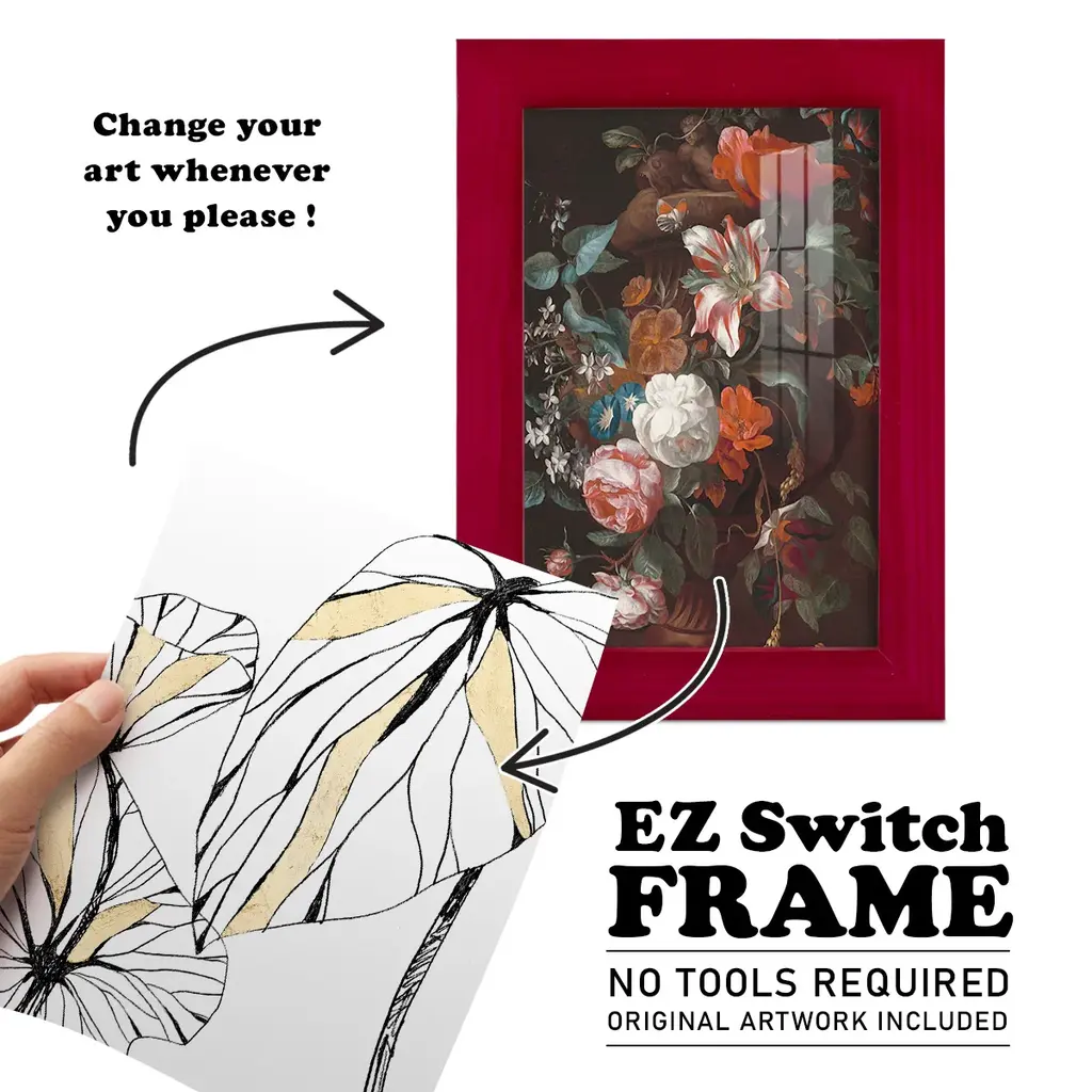 Linear Tropics with Gold II -EZ SWITCH Framed Print w/glass-Cherry Red A delightful, framed print. Featuring a solid wood frame with real wood glass. This premium print is giclee quality. In addition, every frame features a removable back and table top stand. This allows you to change your art in the future or to just stand the art on a table for a new look. We are sure you'll enjoy our new series of EZ SWITCH Framed Art. Solid Wood Frame Real Glass Removable / Replaceable Art Built in Tabletop Stand Sizes range from 4x6 up to 12x15 - buy just one or pair them up as sets as you see fit.