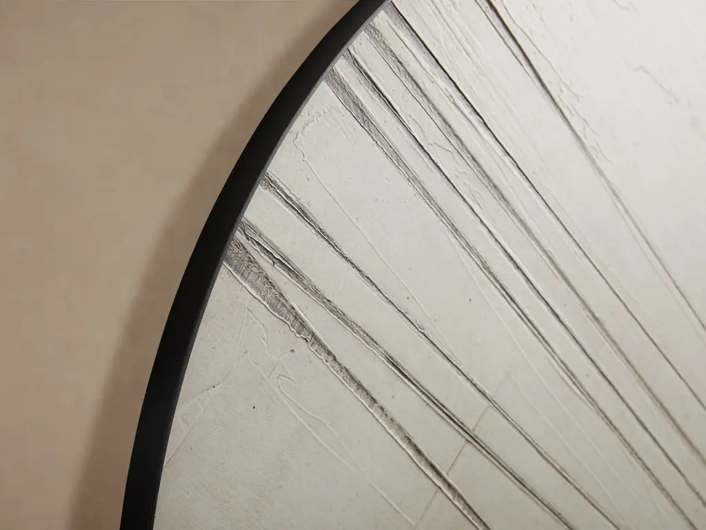 Linear is striking as it is unique. Bold, textural patterns are created on Italian resin cement, and then hand-finished in shades of parchment. Encased inside a circular, hand-welded iron frame, this truly one-of-a-kind piece adds energy and movement to any living space. Handcrafted on Italian resin cement. Encased inside a hand-welded iron frame. Hangs from back-mounted hardware. Artist Dawn Sweitzer.