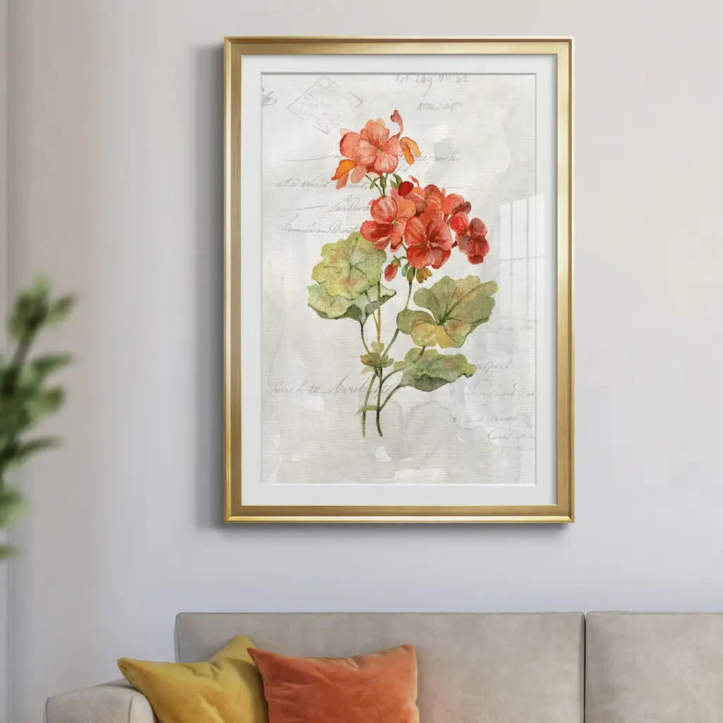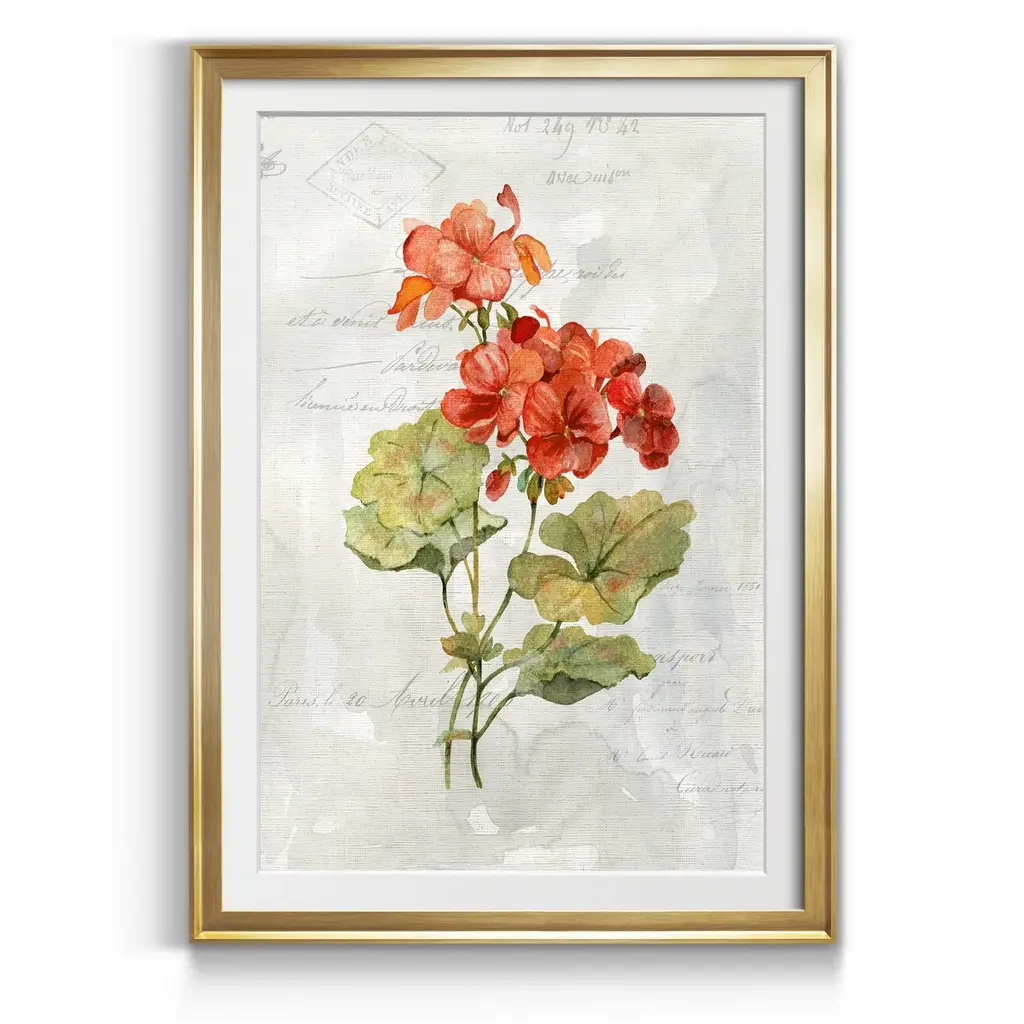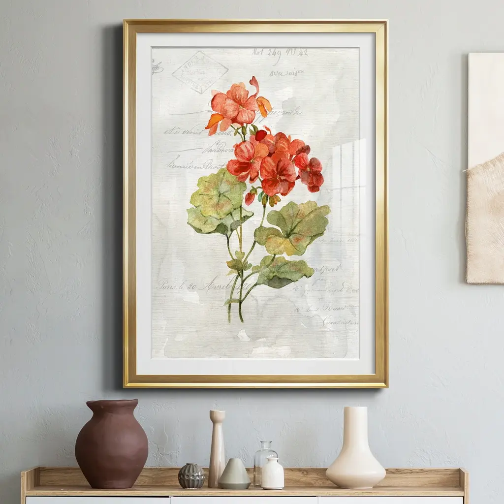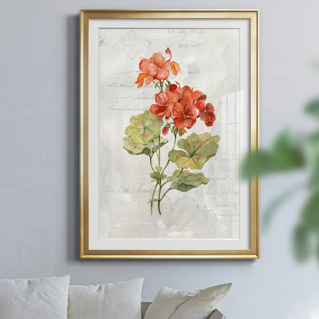 Linen Geranium Premium Framed Print - Ready to Hang created to last. Framed in distressed wood and available in an array of sizes and colors Featuring a beveled a solid wood stretcher bar, each piece comes ready to hand 4 SIZES AVAILABLE 30.5''X42.5'' - Overall Size 26.5'X36.5'' - Overall Size 22''x30'' - Overall Size 18''x24'' - Overall Size Each piece is made to order. Each piece comes with hanging hardware. Made in the USA Ready to Hang Giclee Paper Print Acrylic Glass Beveled Matt Board