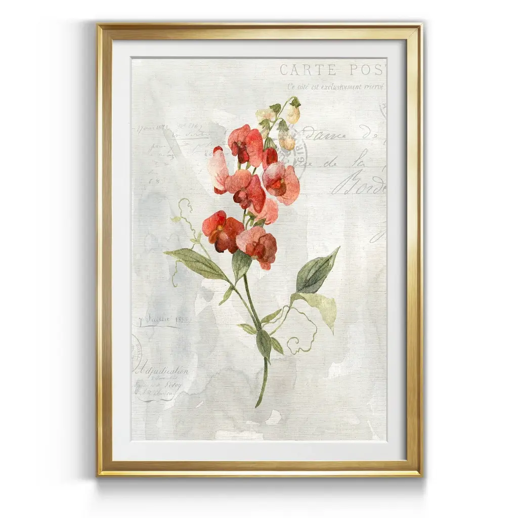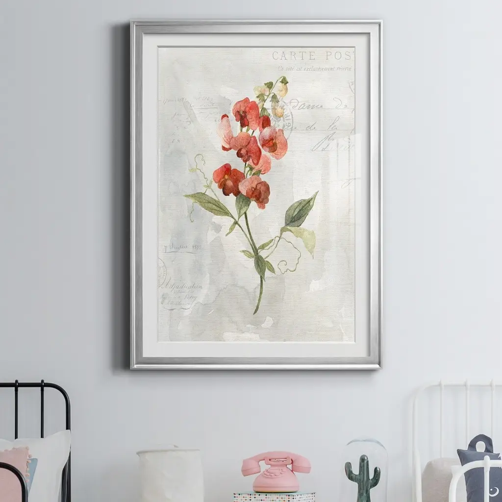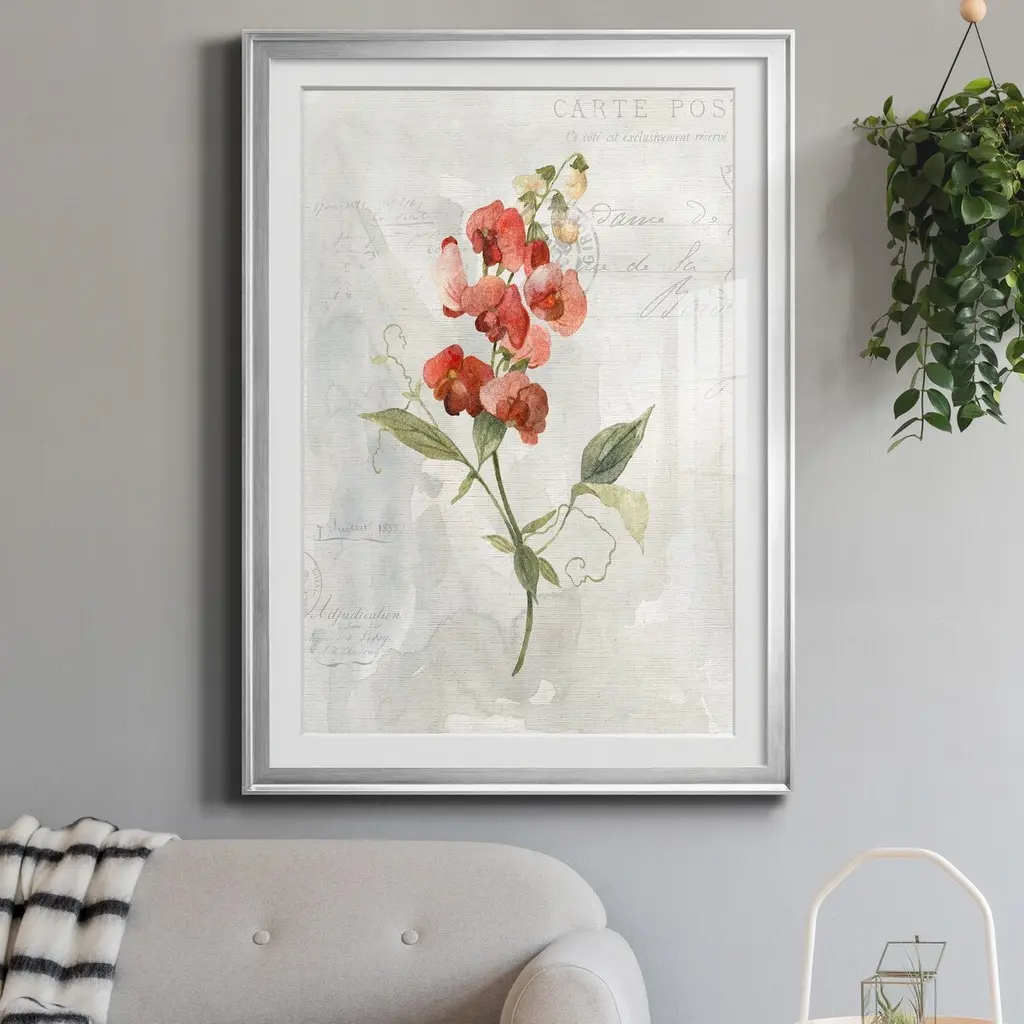 Linen Sweet Pea Premium Framed Print - Ready to Hang created to last. Framed in distressed wood and available in an array of sizes and colors Featuring a beveled a solid wood stretcher bar, each piece comes ready to hand 4 SIZES AVAILABLE 30.5''X42.5'' - Overall Size 26.5'X36.5'' - Overall Size 22''x30'' - Overall Size 18''x24'' - Overall Size Each piece is made to order. Each piece comes with hanging hardware. Made in the USA Ready to Hang Giclee Paper Print Acrylic Glass Beveled Matt Board
