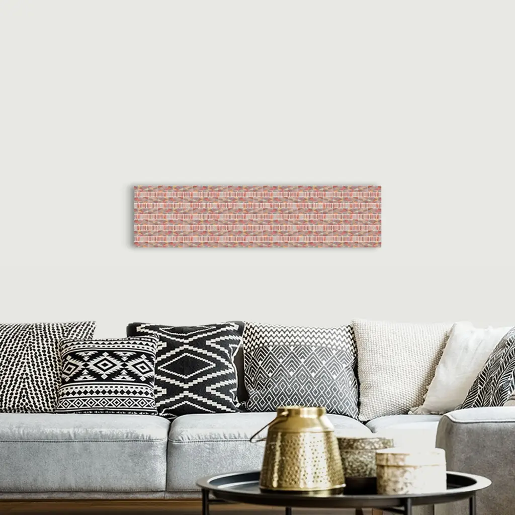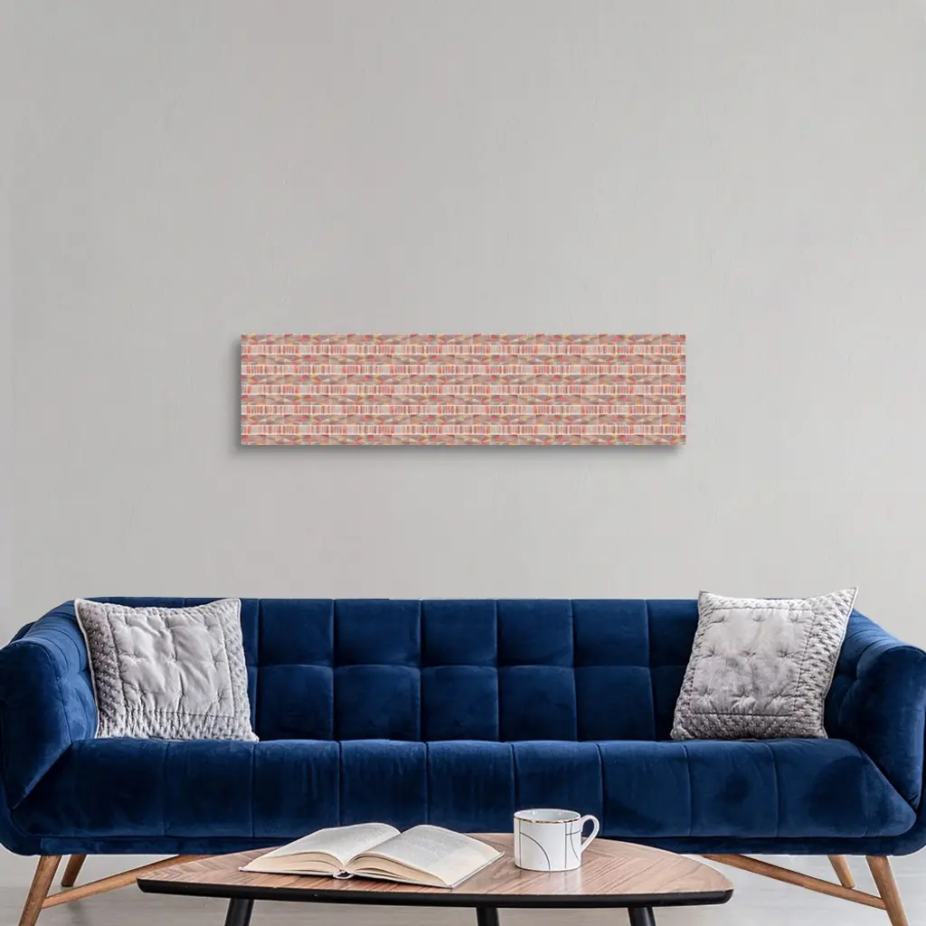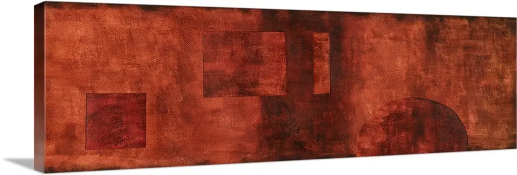Large panoramic abstract watercolor painting with geometric patterns in shades of red, orange, and grey.