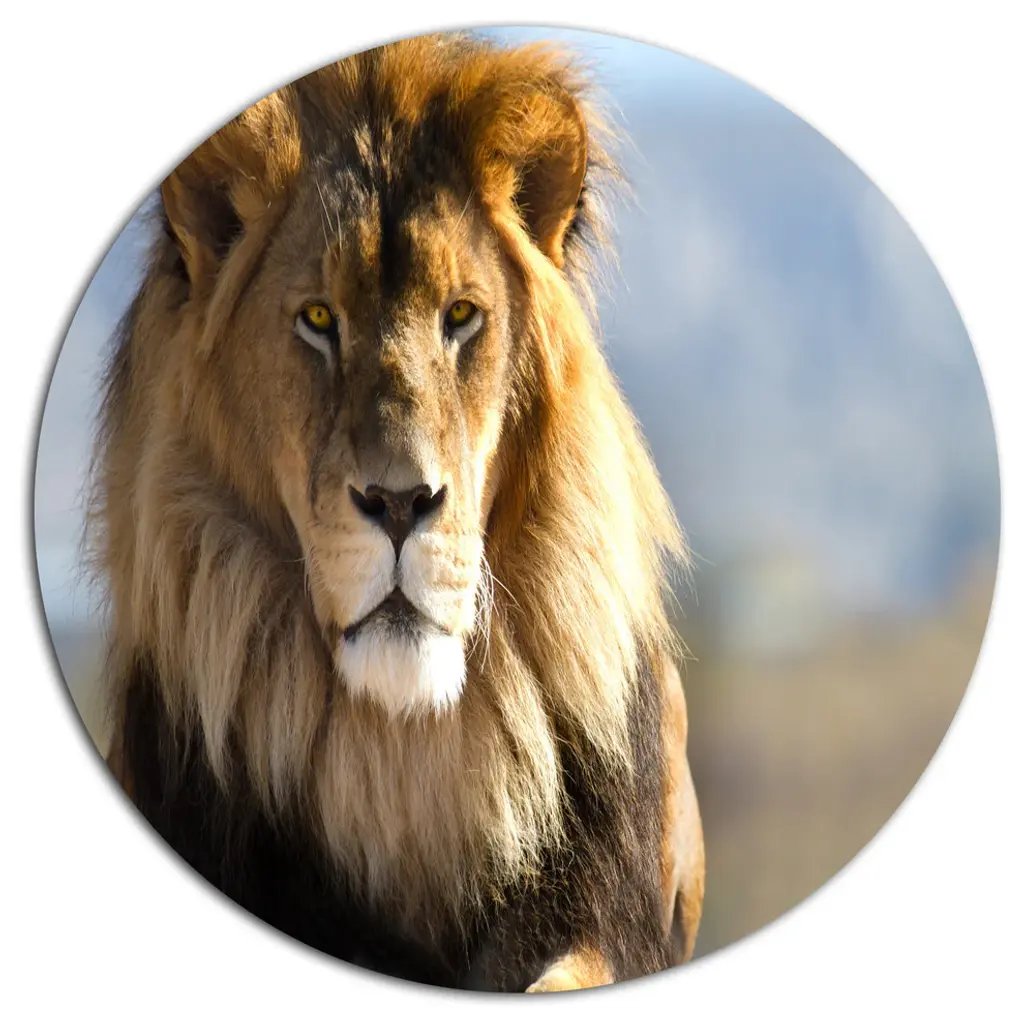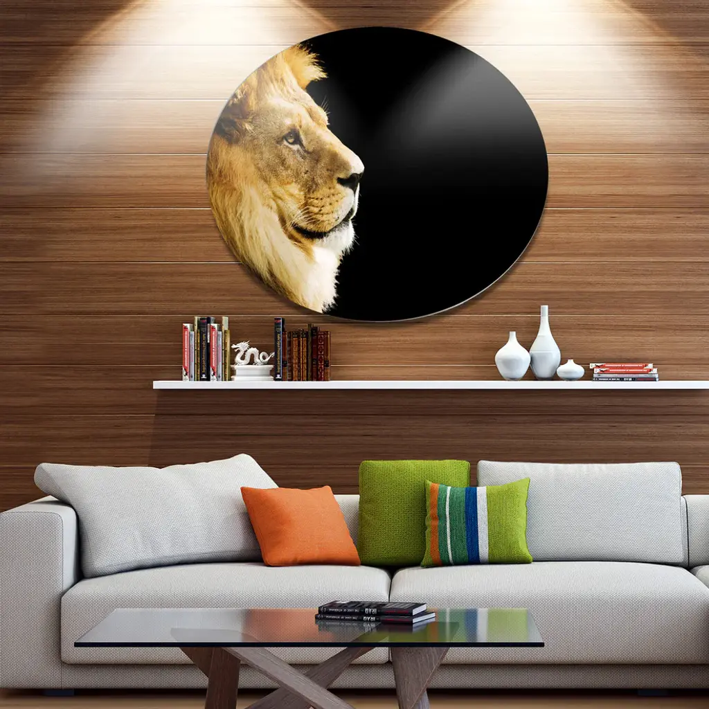 Bring Contemporary Abstraction to your home with this large Circle Metal wall art. This Large Lion Portrait on Black Metal Artwork makes it the focal point of any room or office. - White Gloss Coating ensures colors are extra vibrant with light reflection.- Aluminum grade Sheet Metal with 1 inch mounting frame on the back giving the illusion that the artwork is floating on the wall..- Mounting Brackets are included along with instructions.- High Quality Digital images are created directly into a glossy aluminum panel producing a stunning and captivating print into the glossy finish of the metal.- Water, Fire and Scratch resistant HD Aluminum panels.- Looks better than any photo paper and guaranteed to last at least 20 years- Easy to clean with a microfiber cloth. Colors are far superior to regular Canvas Art. - Easy to Hang