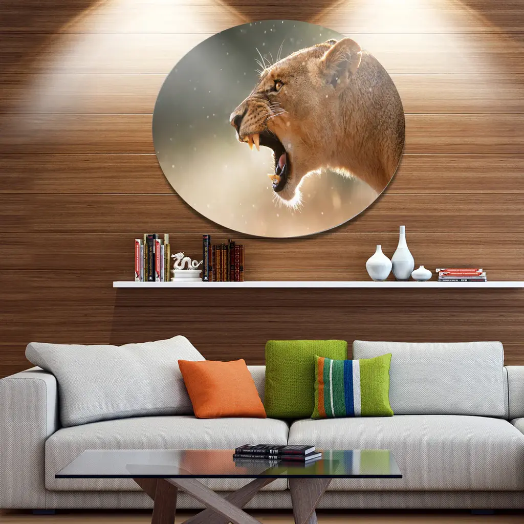 Bring Contemporary Abstraction to your home with this large Circle Metal wall art. This Lion Showing Dangerous Teeth Metal Artwork makes it the focal point of any room or office. - White Gloss Coating ensures colors are extra vibrant with light reflection.- Aluminum grade Sheet Metal with 1 inch mounting frame on the back giving the illusion that the artwork is floating on the wall..- Mounting Brackets are included along with instructions.- High Quality Digital images are created directly into a glossy aluminum panel producing a stunning and captivating print into the glossy finish of the metal.- Water, Fire and Scratch resistant HD Aluminum panels.- Looks better than any photo paper and guaranteed to last at least 20 years- Easy to clean with a microfiber cloth. Colors are far superior to regular Canvas Art. - Easy to Hang
