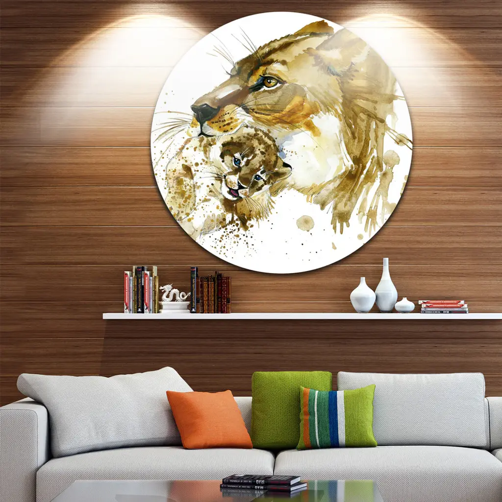 Bring Contemporary Abstraction to your home with this large Circle Metal wall art. This Lioness and Cub Illustration Metal Artwork makes it the focal point of any room or office. - White Gloss Coating ensures colors are extra vibrant with light reflection.- Aluminum grade Sheet Metal with 1 inch mounting frame on the back giving the illusion that the artwork is floating on the wall..- Mounting Brackets are included along with instructions.- High Quality Digital images are created directly into a glossy aluminum panel producing a stunning and captivating print into the glossy finish of the metal.- Water, Fire and Scratch resistant HD Aluminum panels.- Looks better than any photo paper and guaranteed to last at least 20 years- Easy to clean with a microfiber cloth. Colors are far superior to regular Canvas Art. - Easy to Hang
