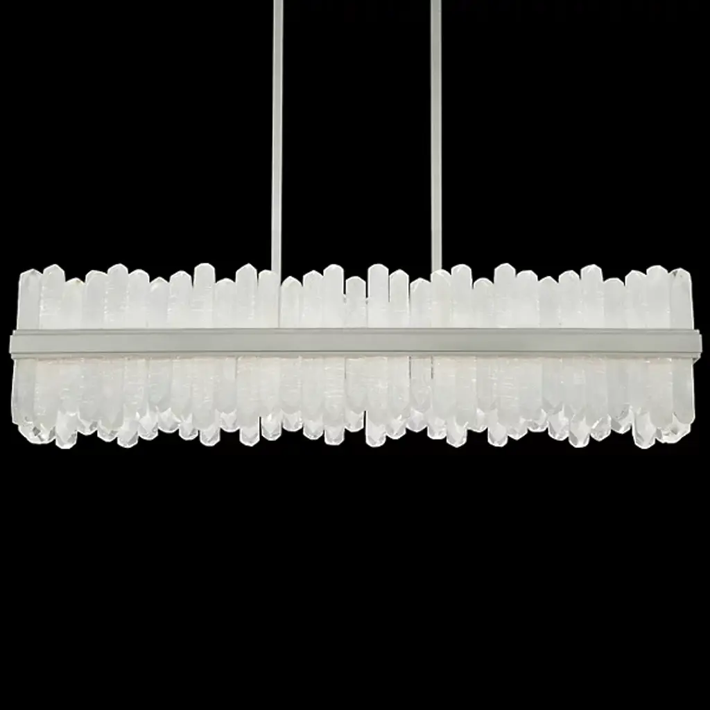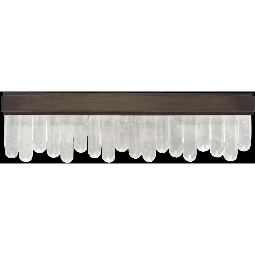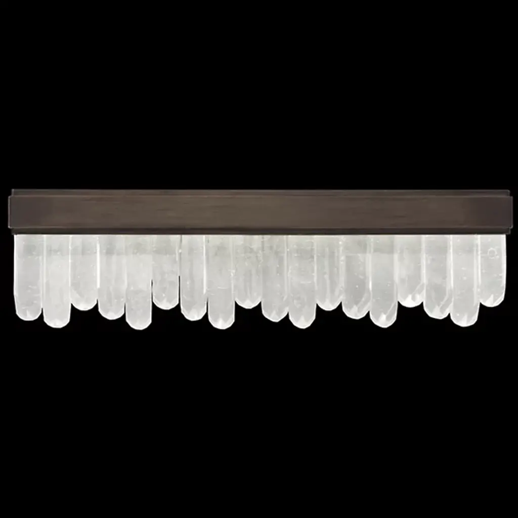 Luxury LED bath fixture influenced by the ephemeral appearance of illuminated rock crystal, which has been interpreted into handmade glassworks with the collaboration of the Fine Art studio glass master craftsmen. Formed of glass spires that mimic natural crystal formations as much as they do rays of sunlight, and clean metal lines in unadorned but precious finishes. Available in silver leaf, gold leaf or patinated bronze.