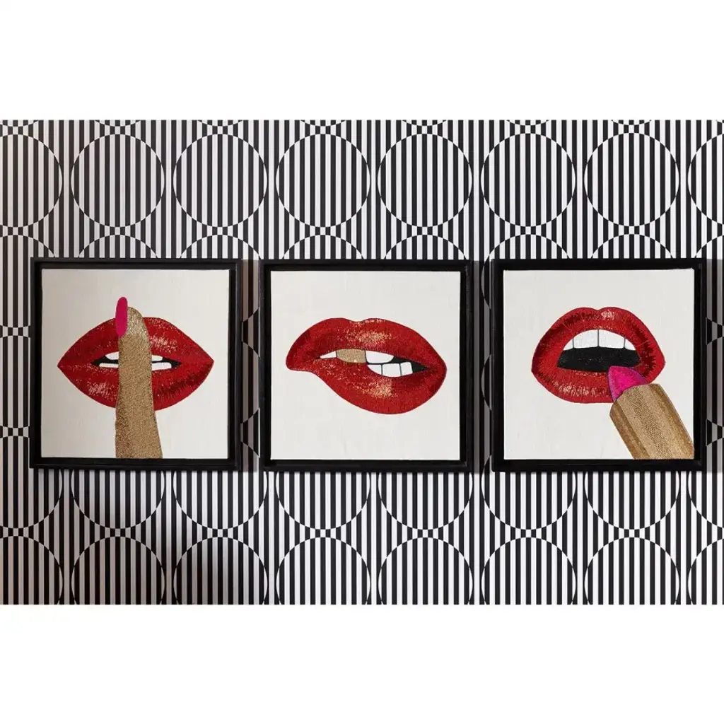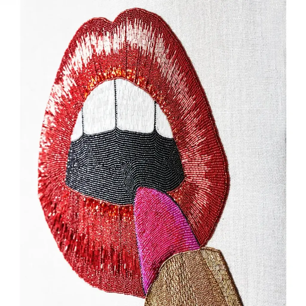Sexy, seductive, saucy. Every wall loves a kiss of glamour. We collaborated with an artisanal workshop in India where a master beader imbued our clean graphic designs with craftsmanship and soul. Each artwork is hand-beaded on linen ground and takes nearly 100 hours to create. Beads of varying heights and patterns within patterns create a sense of depth and dimension. The result is part pop art, part textile triumph. Stretched on a linen ground, which floats in a gallery-quality wire-brushed black frame.