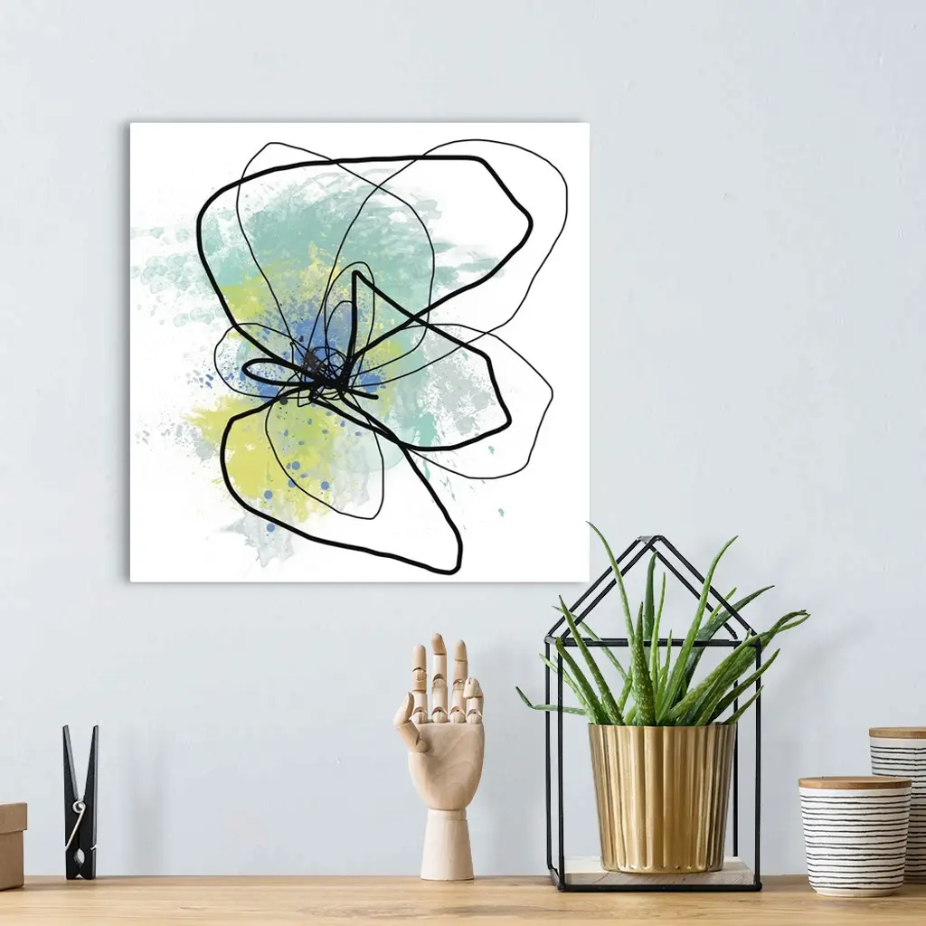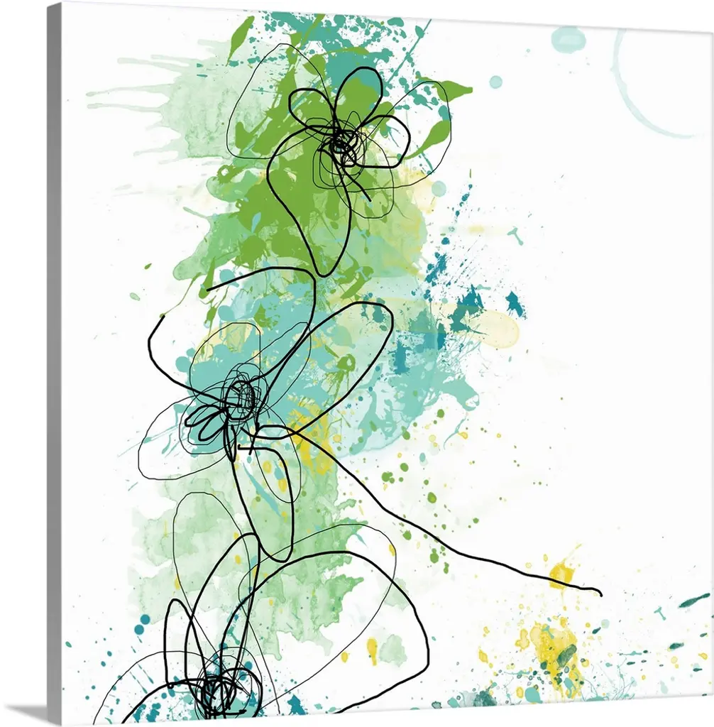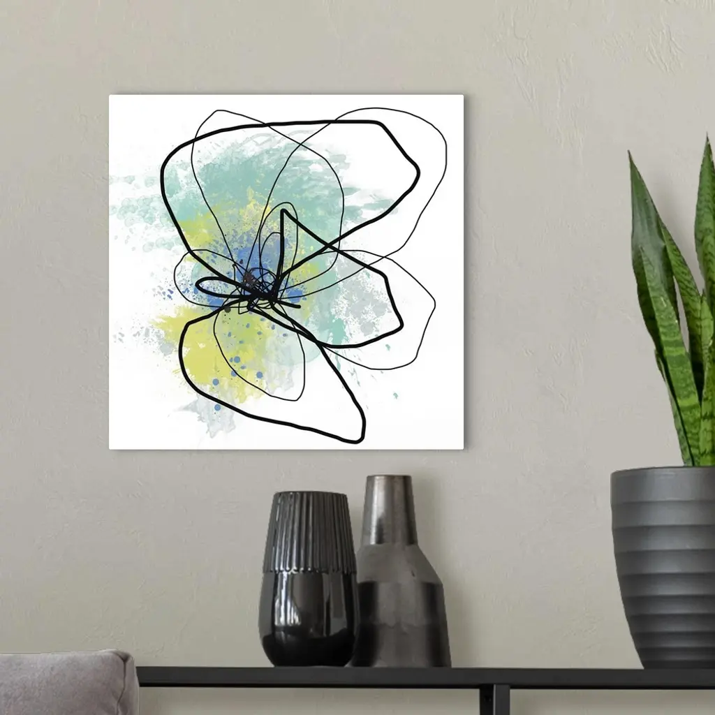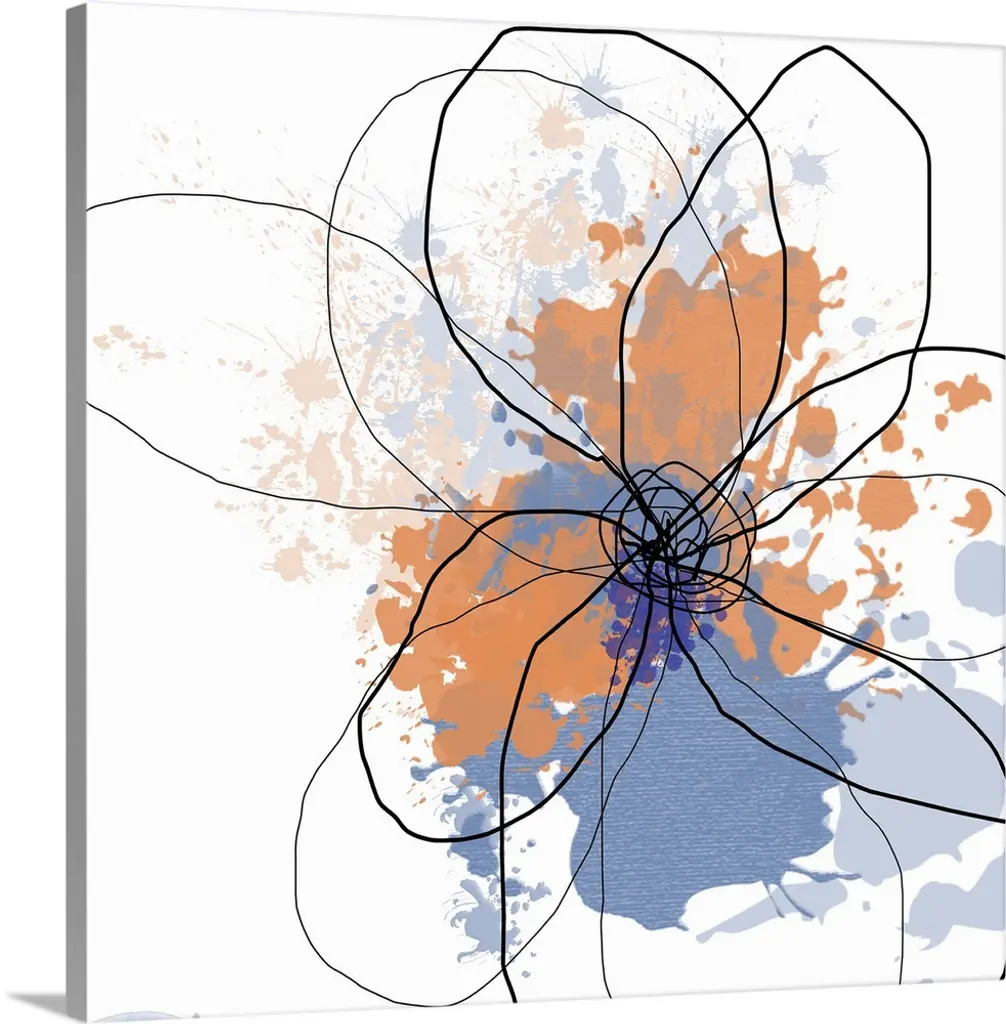 Mixed digital art piece of and outline of a flower head with cool color paint splashes representing the flowers color.