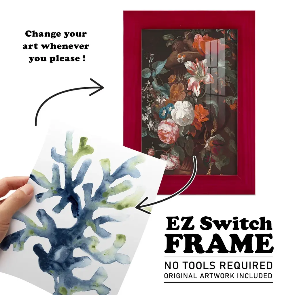 Liquid Coral I -EZ SWITCH Framed Print w/glass-Cherry Red A delightful, framed print. Featuring a solid wood frame with real wood glass. This premium print is giclee quality. In addition, every frame features a removable back and table top stand. This allows you to change your art in the future or to just stand the art on a table for a new look. We are sure you'll enjoy our new series of EZ SWITCH Framed Art. Solid Wood Frame Real Glass Removable / Replaceable Art Built in Tabletop Stand Sizes range from 4x6 up to 12x15 - buy just one or pair them up as sets as you see fit.