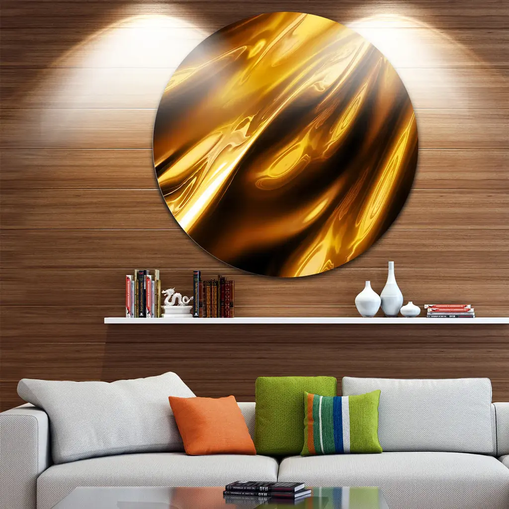 Bring Contemporary Abstraction to your home with this large Circle Metal wall art. This Liquid Gold Texture Pattern Metal Artwork makes it the focal point of any room or office. - White Gloss Coating ensures colors are extra vibrant with light reflection.- Aluminum grade Sheet Metal with 1 inch mounting frame on the back giving the illusion that the artwork is floating on the wall..- Mounting Brackets are included along with instructions.- High Quality Digital images are created directly into a glossy aluminum panel producing a stunning and captivating print into the glossy finish of the metal.- Water, Fire and Scratch resistant HD Aluminum panels.- Looks better than any photo paper and guaranteed to last at least 20 years- Easy to clean with a microfiber cloth. Colors are far superior to regular Canvas Art. - Easy to Hang