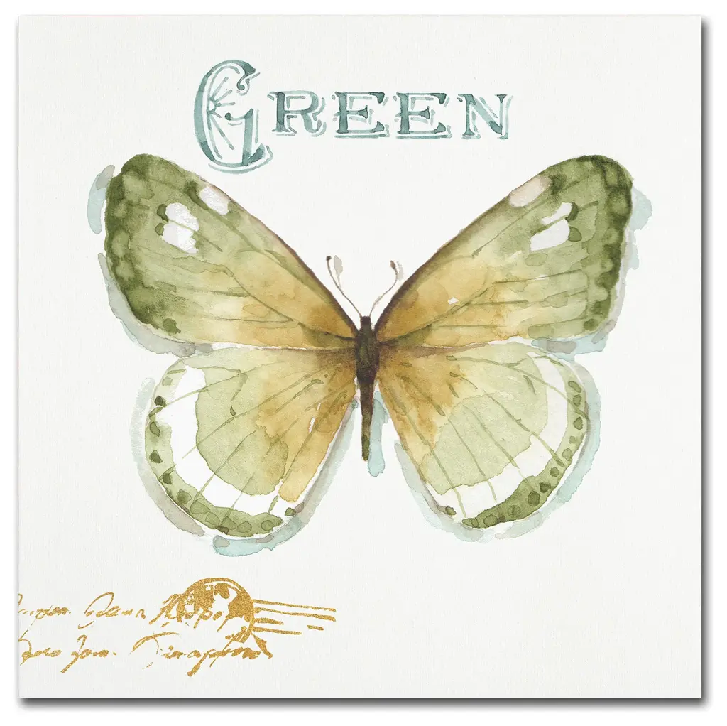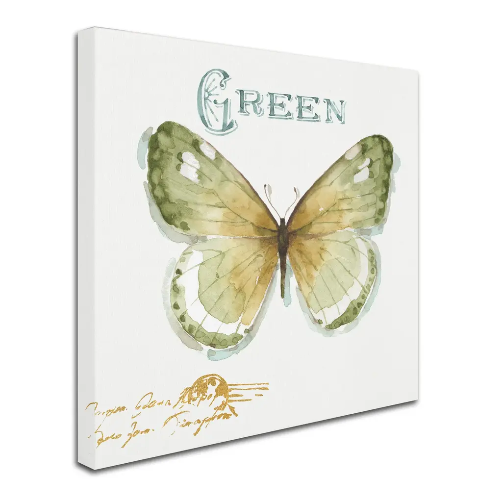 Artist: Lisa AuditSubject: AnimalsStyle: ContemporaryProduct Type: Gallery-Wrapped Canvas ArtMade in USAThis ready to hang, gallery-wrapped art piece features the word "Green" painted above a green watercolor butterfly.Lisa Audit loves the art of decoration, and she uses oil paints, acrylics, and pen and ink to create beautiful pieces of art. She finds inspiration from fine art masters such as Picasso, Manet, Rubens and Cezanne. Lisa lives in Canada with her two teenage daughters, and she creates much of her artwork in a spacious studio inside her home.Giclee (jee-clay) is an advanced printmaking process for creating high quality fine art reproductions. The attainable excellence that Giclee printmaking affords makes the reproduction virtually indistinguishable from the original piece. The result is wide acceptance of Giclee by galleries, museums, and private collectors. Gallery wrap is a method of stretching an artist's canvas so that the canvas wraps around the sides and is secured a hidden, wooden frame. This method of stretching and preparing a canvas allows for a frameless presentation of the finished painting.