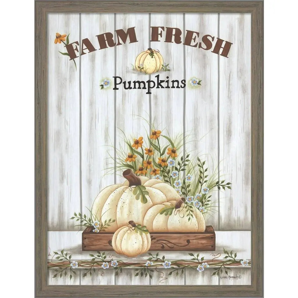 Farm Fresh Pumpkin by Lisa Kennedy is a high quality piece of framed artwork. The finished size of this piece is 13" X 17". It has a Distressed Grey Knotty Wood frame and is finished with high quality Acrylic Plexiglass. 100% Satisfaction Guaranteed.