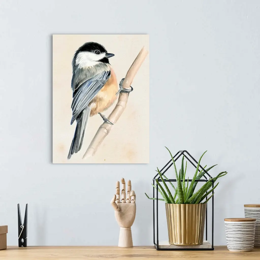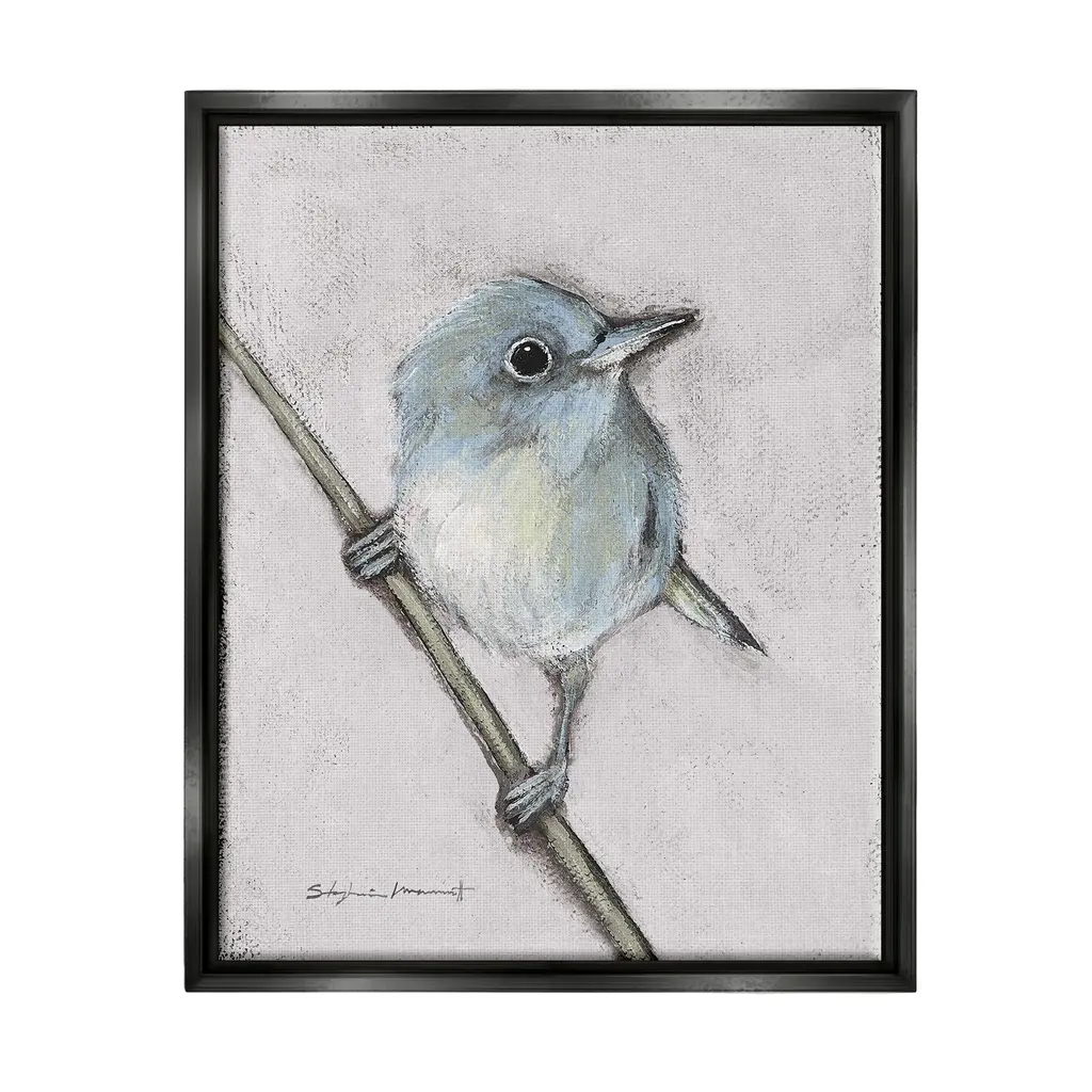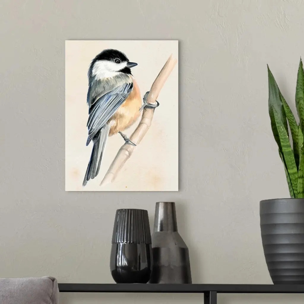 Contemporary artwork of a garden bird perched on a branch against a neutral background.