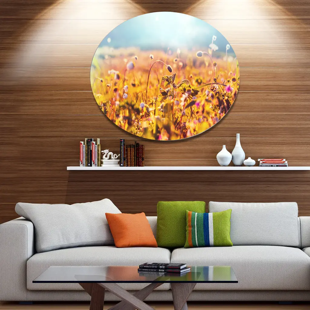 Bring Contemporary Abstraction to your home with this large Circle Metal wall art. This Little Mountain Flowers on Sunny Day Metal Artwork makes it the focal point of any room or office. - White Gloss Coating ensures colors are extra vibrant with light reflection.- Aluminum grade Sheet Metal with 1 inch mounting frame on the back giving the illusion that the artwork is floating on the wall..- Mounting Brackets are included along with instructions.- High Quality Digital images are created directly into a glossy aluminum panel producing a stunning and captivating print into the glossy finish of the metal.- Water, Fire and Scratch resistant HD Aluminum panels.- Looks better than any photo paper and guaranteed to last at least 20 years- Easy to clean with a microfiber cloth. Colors are far superior to regular Canvas Art. - Easy to Hang