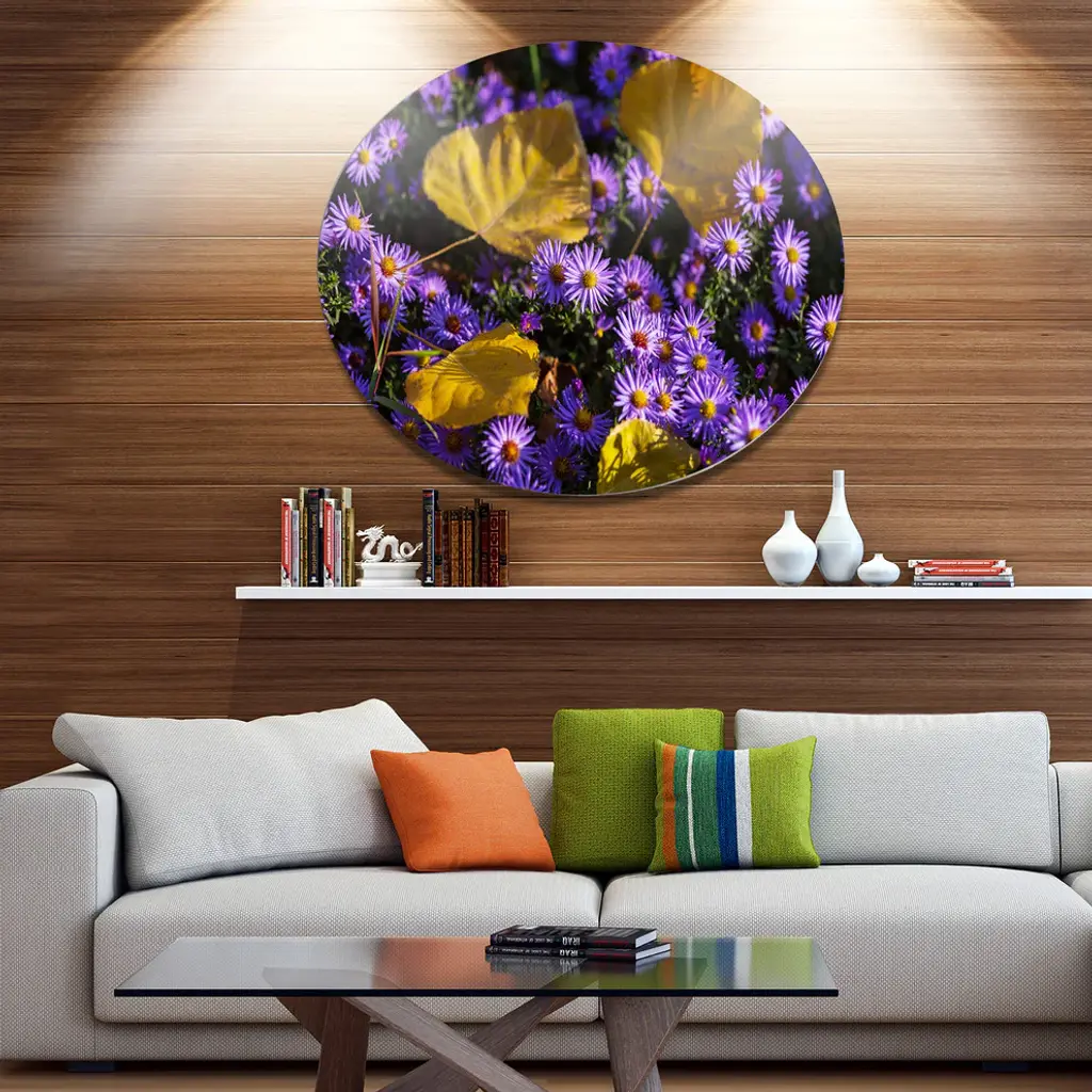 Bring Contemporary Abstraction to your home with this large Circle Metal wall art. This Little Purple Flowers and Yellow Leaves Metal Artwork makes it the focal point of any room or office. - White Gloss Coating ensures colors are extra vibrant with light reflection.- Aluminum grade Sheet Metal with 1 inch mounting frame on the back giving the illusion that the artwork is floating on the wall..- Mounting Brackets are included along with instructions.- High Quality Digital images are created directly into a glossy aluminum panel producing a stunning and captivating print into the glossy finish of the metal.- Water, Fire and Scratch resistant HD Aluminum panels.- Looks better than any photo paper and guaranteed to last at least 20 years- Easy to clean with a microfiber cloth. Colors are far superior to regular Canvas Art. - Easy to Hang