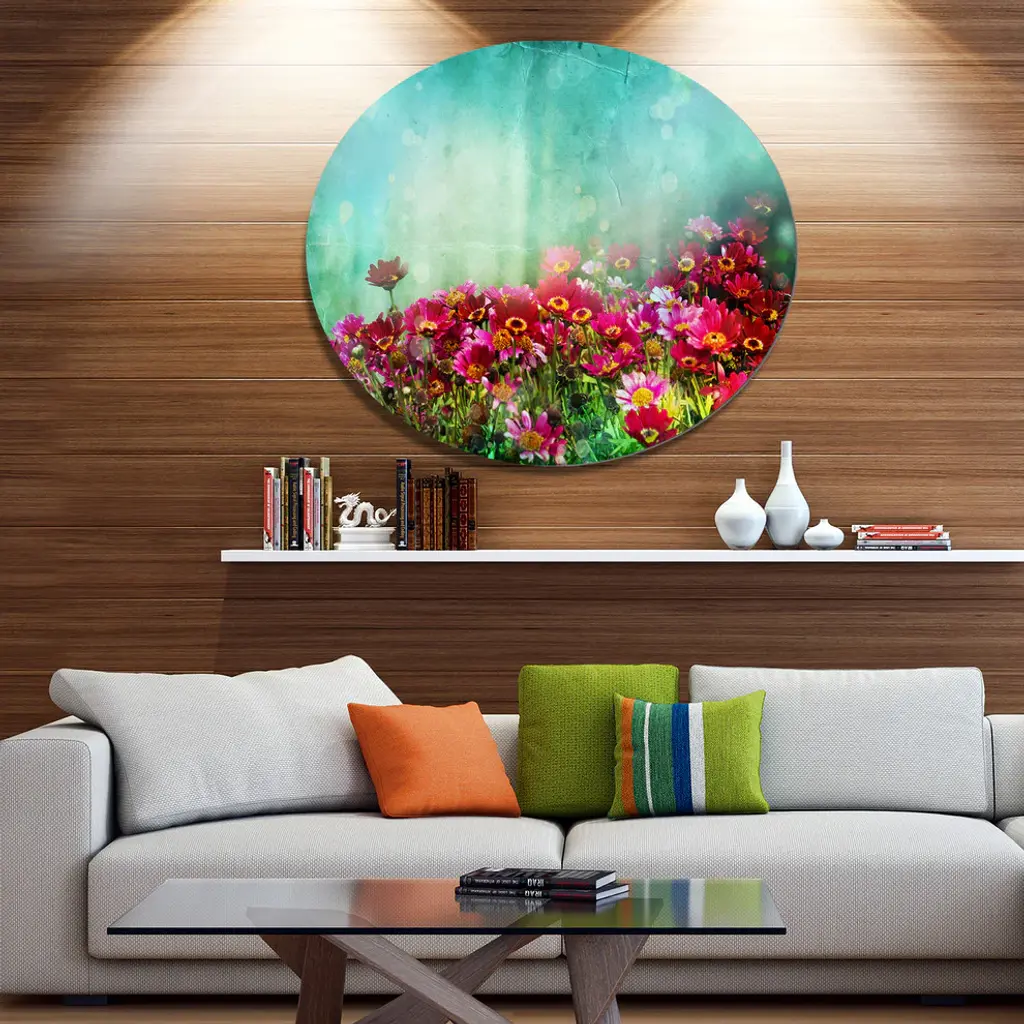 Little Red And Pink Flowers On Blue, Floral Round Metal Wall Art, 23"