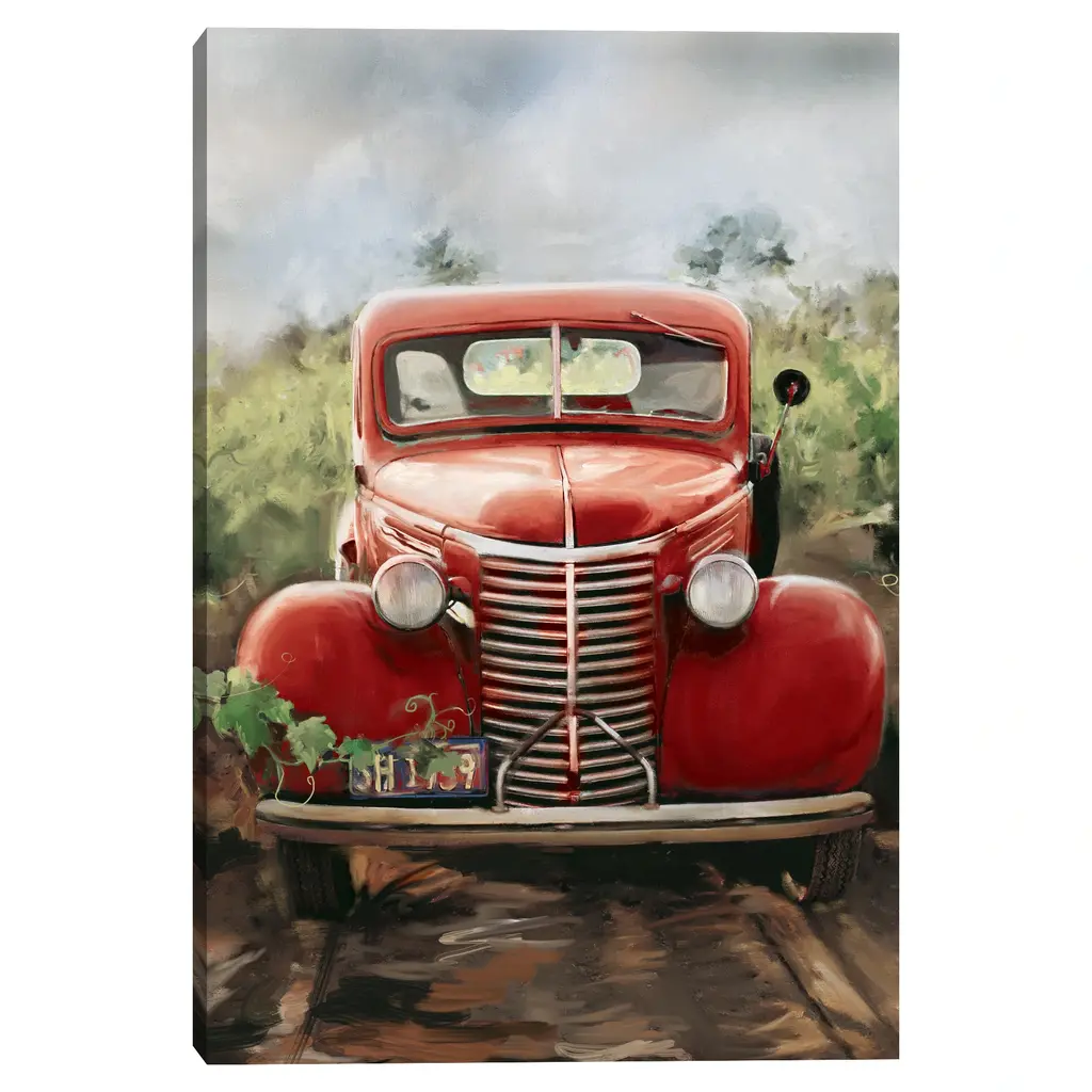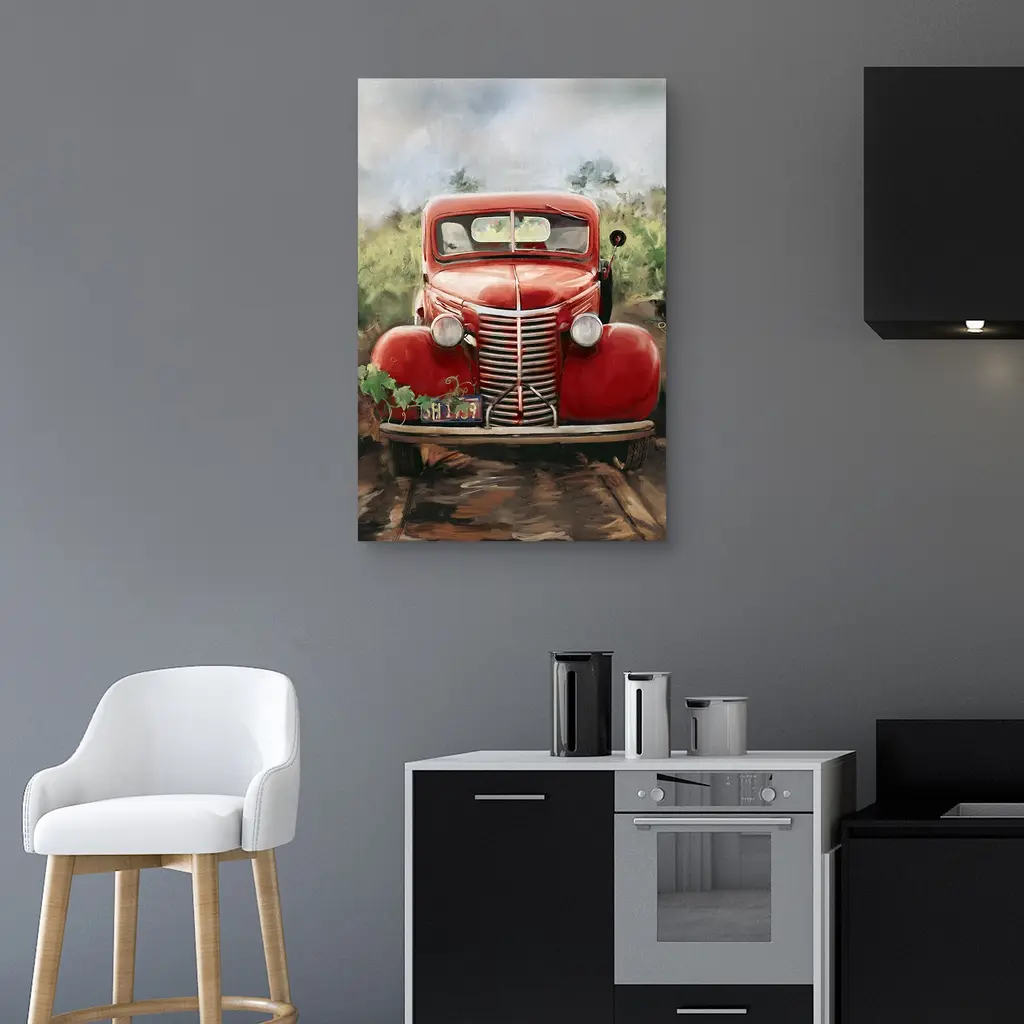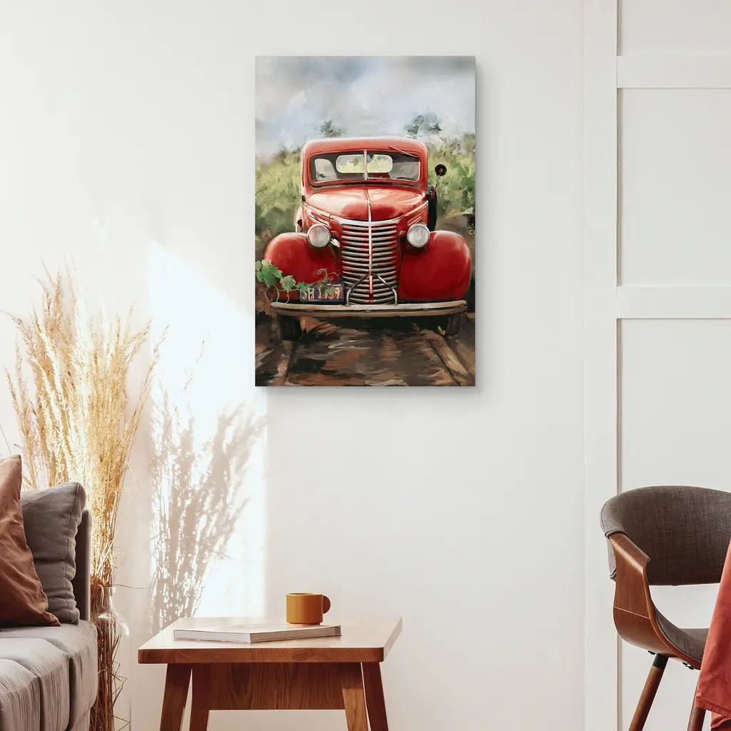 A vintage red truck sits idle parked on a quiet farm awaiting crop harvest. Studio Arts Little Red Truck vintage style canvas print takes us back to simpler times.