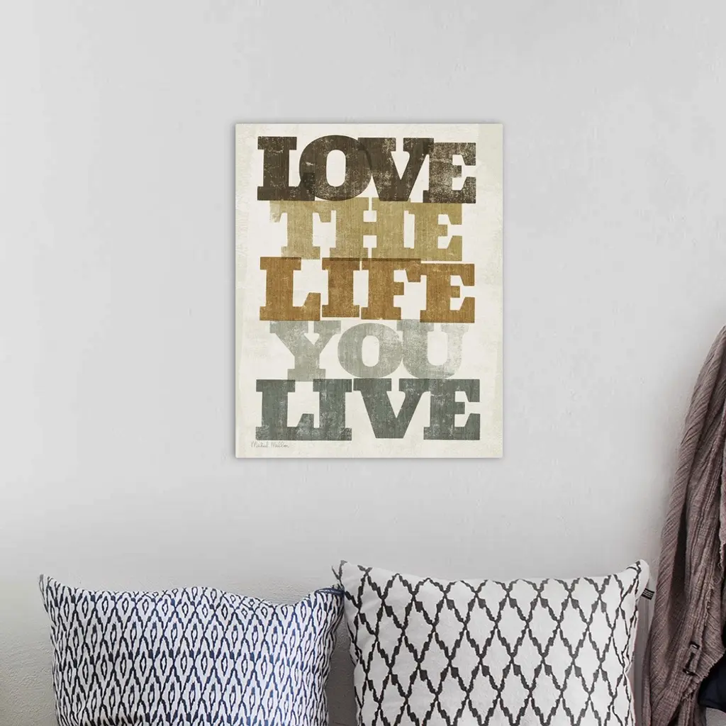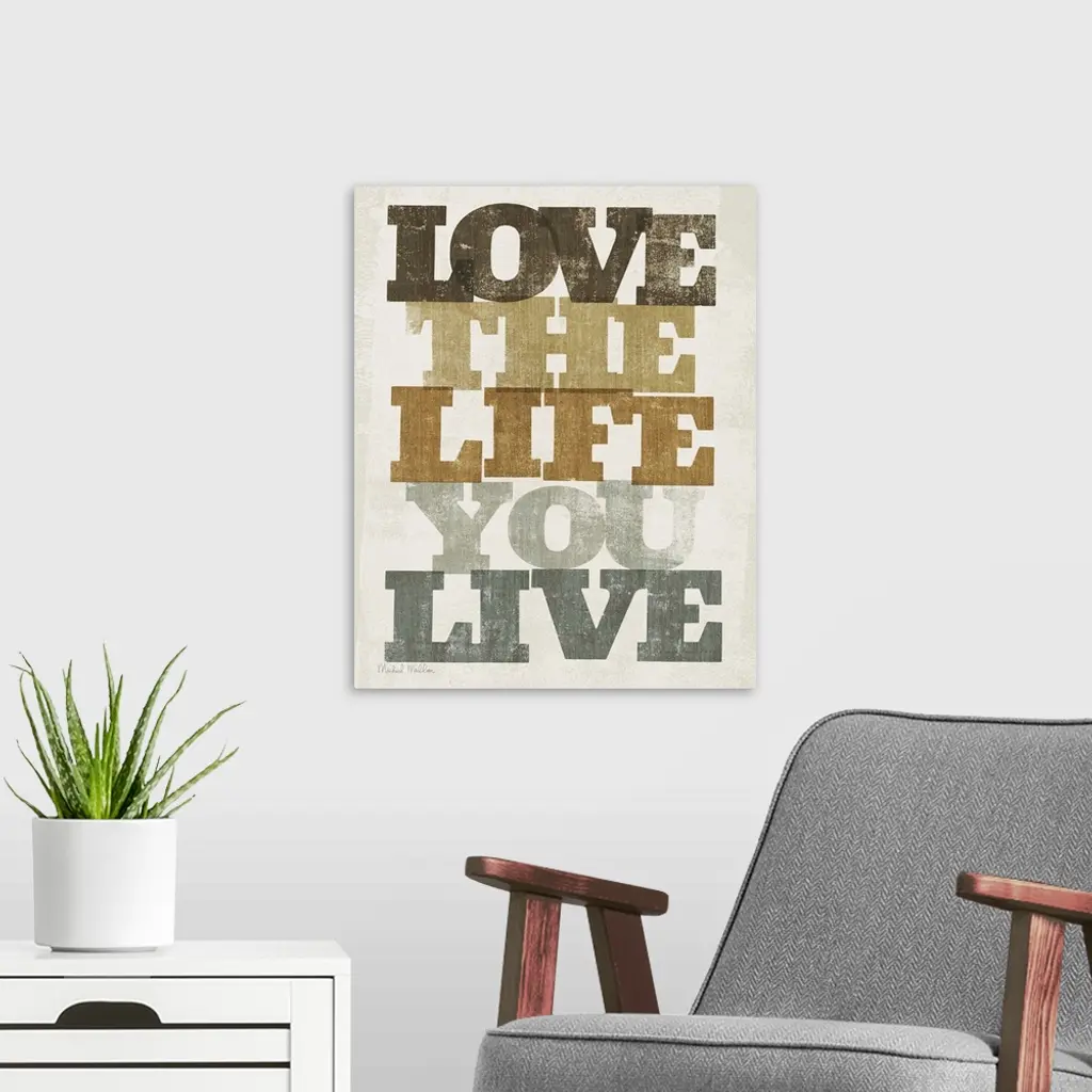 Contemporary artwork of large different colored text filling the image, against a beige background.