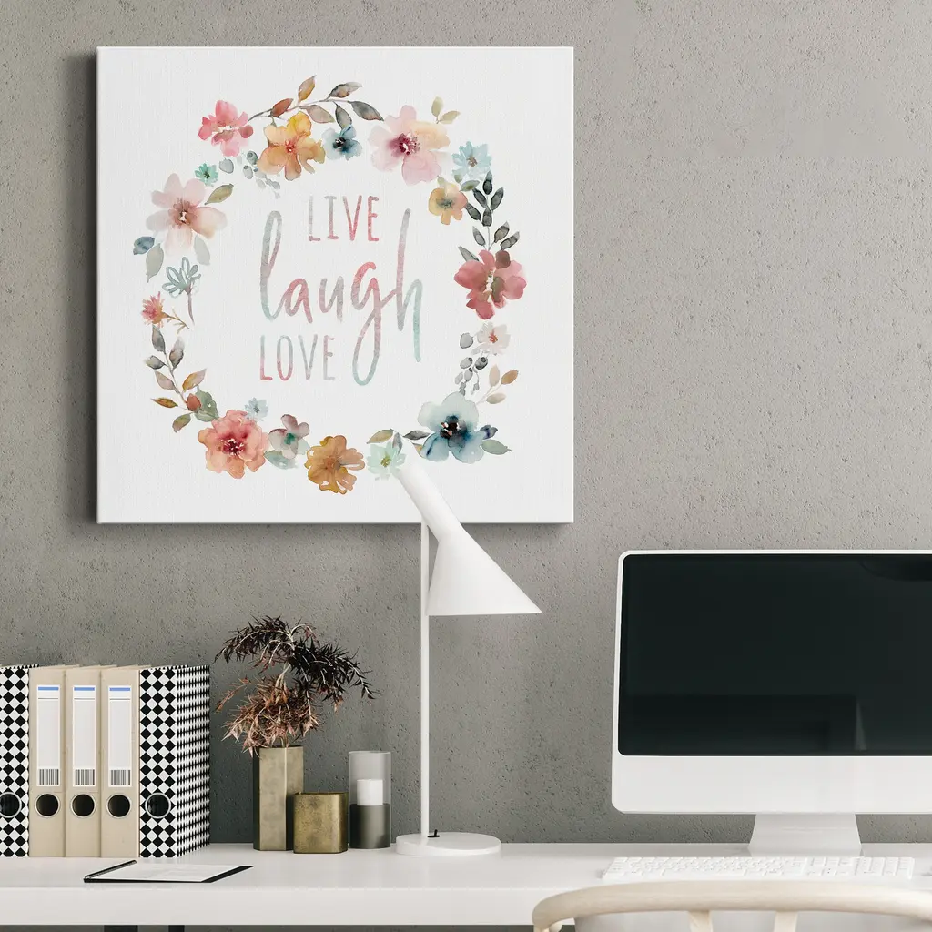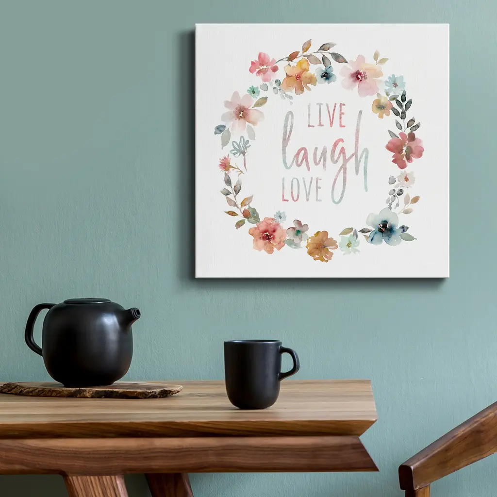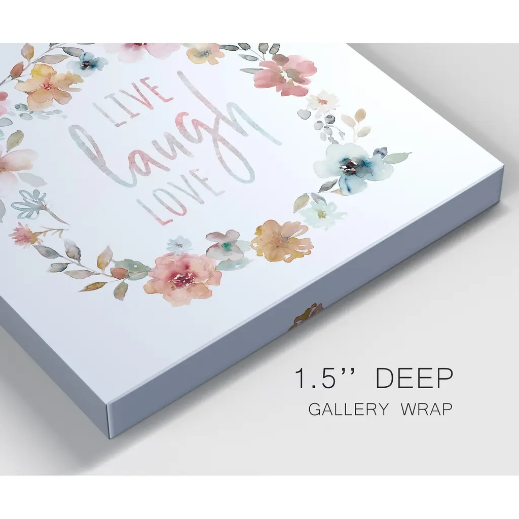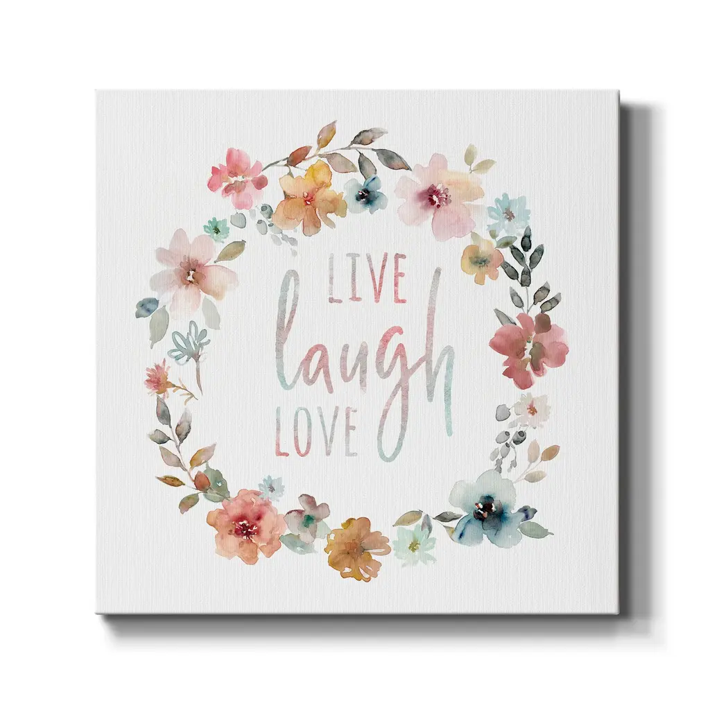 Live Laugh Love-Premium Gallery Wrapped Canvas - Ready to Hang A premium hand stretched gallery wrapped canvas print created to last. Featuring a beveled a solid wood stretcher bar, each piece comes ready to hand 5 SIZES AVAILABLE 10''X10'' - Overall Size 16''x16'' - Overall Size 24''x24'' - Overall Size 32''x32'' - Overall Size 40''x40'' - Overall Size Each piece is made to order. Built to Last Each piece comes ready to hang Solid wood stretcher Fade and Water resistant Made domestically