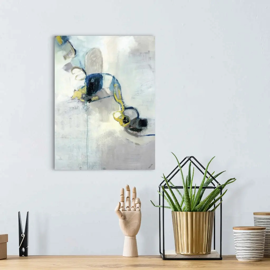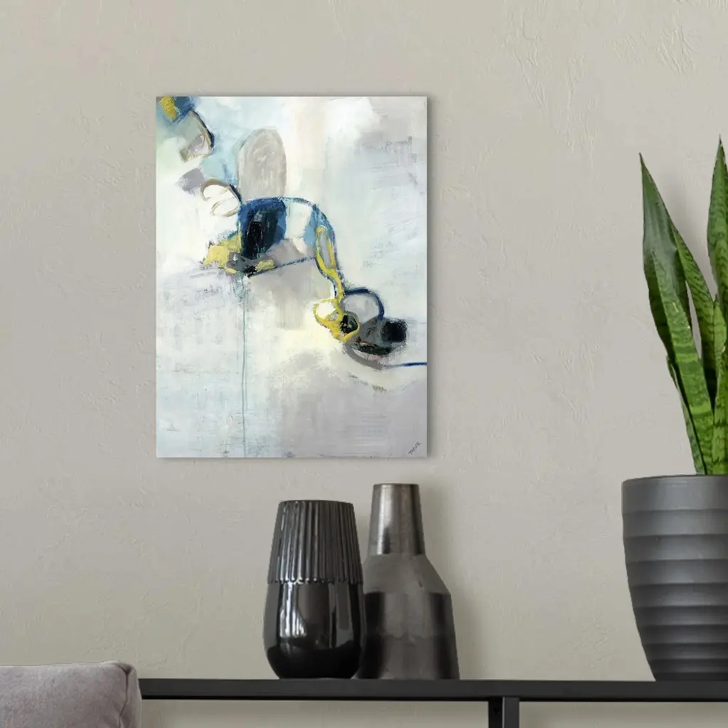 Contemporary abstract painting using pale gray and blue tones with cascading organic shapes in vibrant colors.