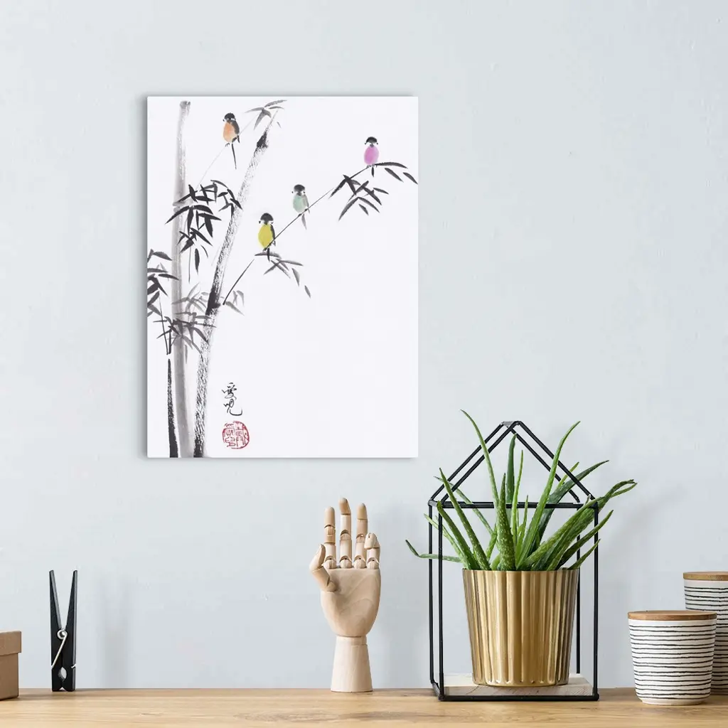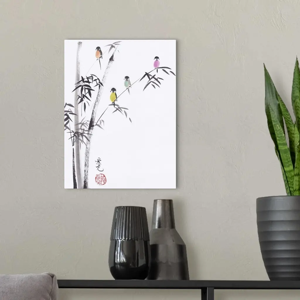 Chinese ink and watercolor painting of colorful birds sitting in a tree.