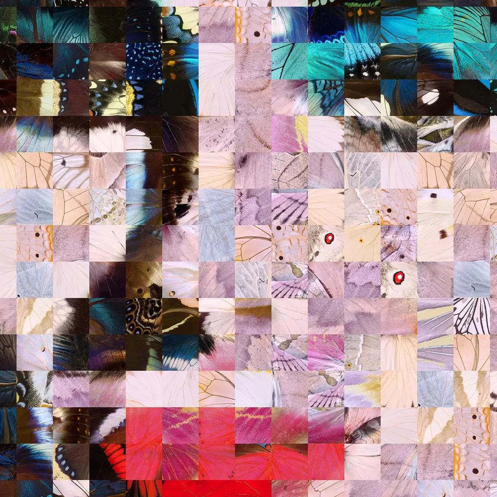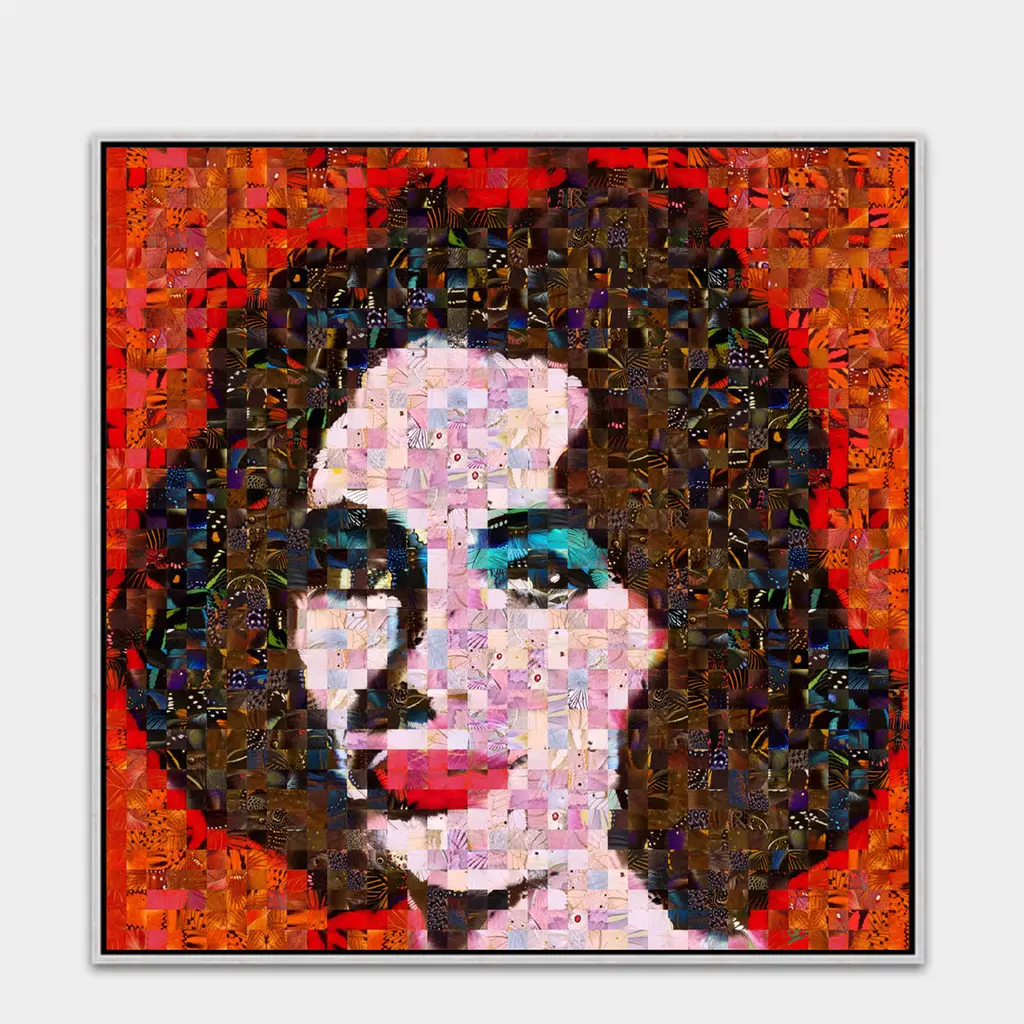 Lis is composed of 1600 photographic tiles of butterfly wings details that have been used to elaborate this work provided with a double certificate of authenticity and uniqueness countersigned by the artist and blockchain registered. The work can be ordered with a handcrafted wood frame. Revisiting Andy Warhol’s Liz Taylor, 2023, metal sublimation print, chromaluxe HD aluminium, 100×100 cm, ed. of 3. Please ask the Concierge service for further information.