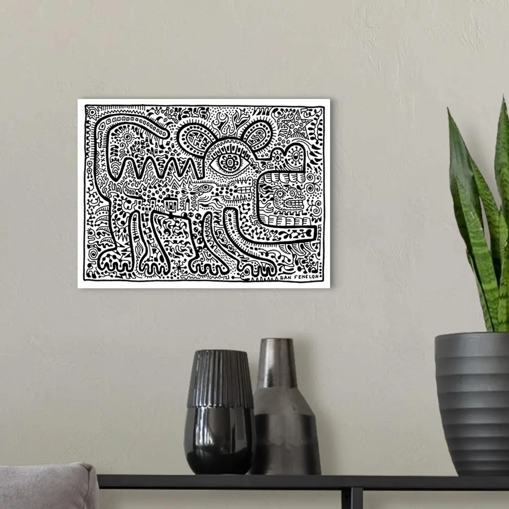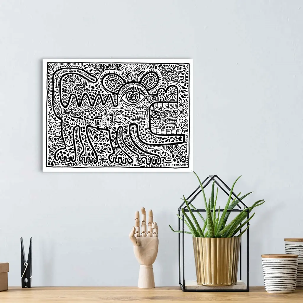 Contemporary abstract artwork in an urban art style of a lizard filled in with tons of intricate detail in blue against a background of equal detail in yellow.