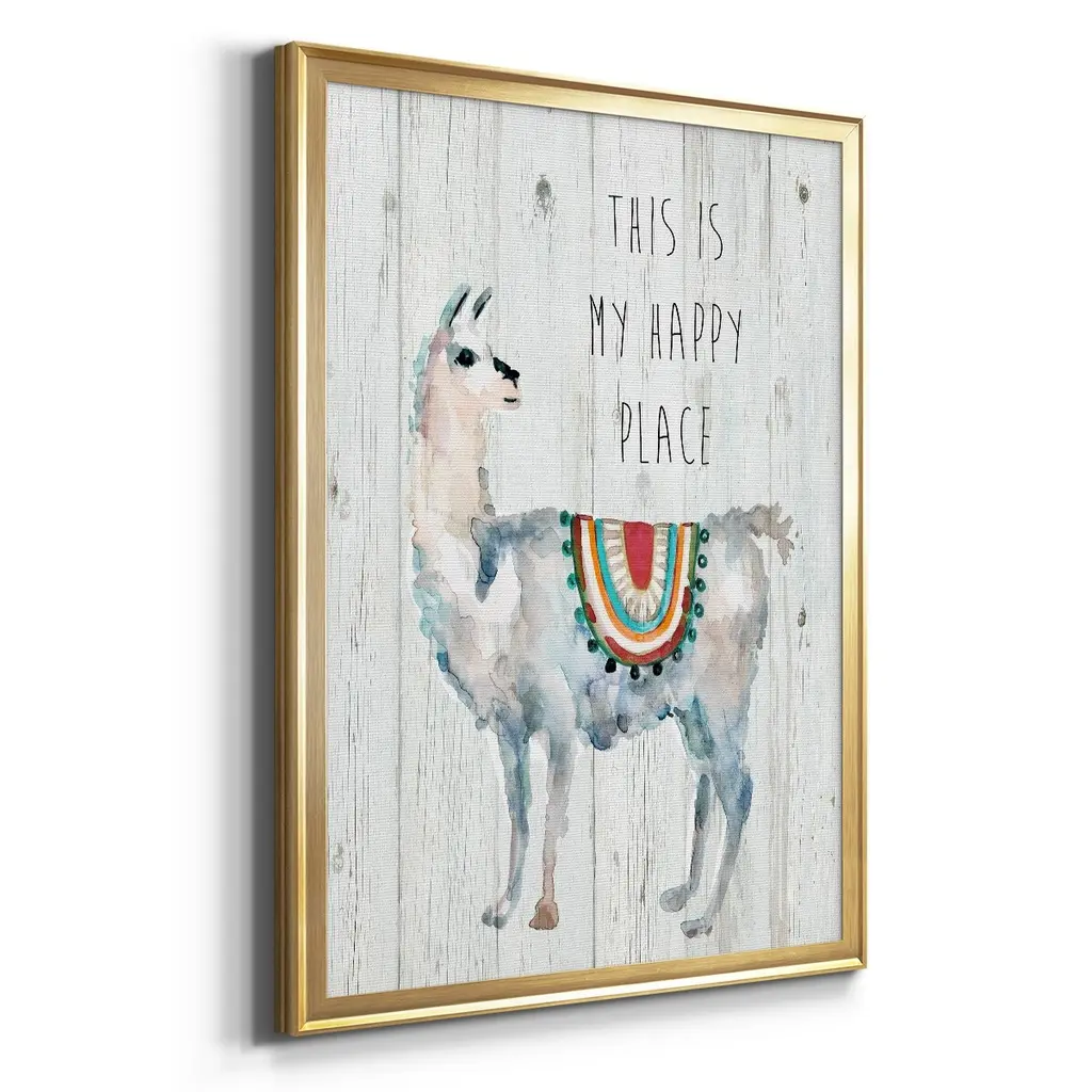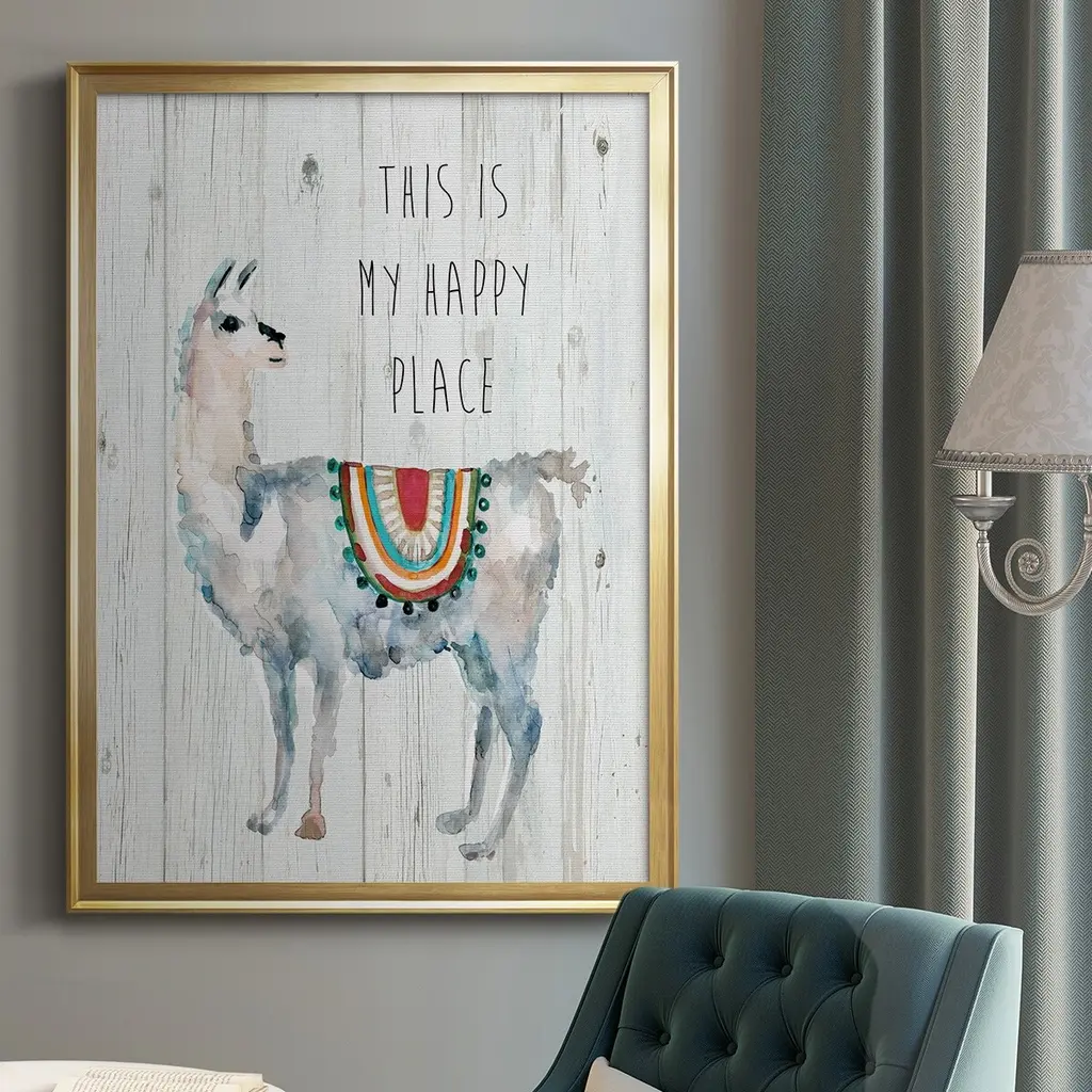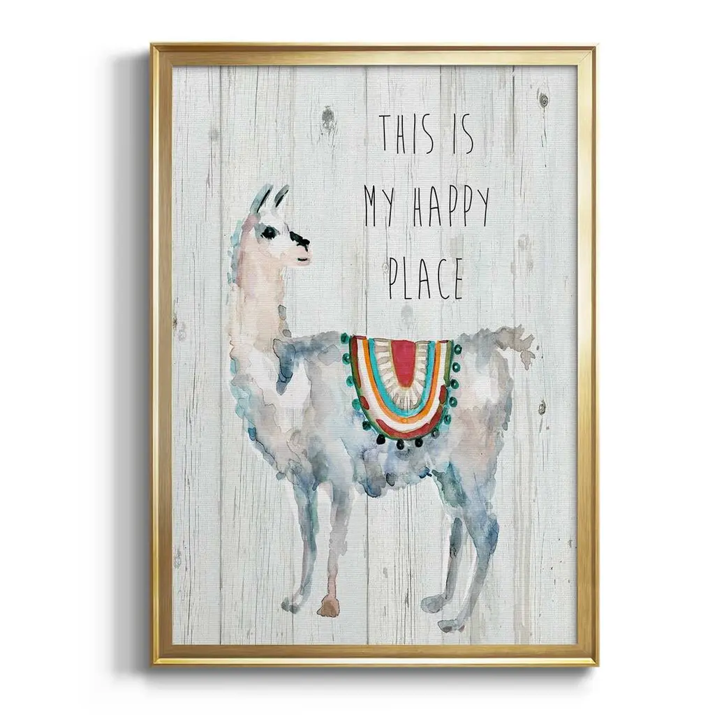 Llama Happy Place Premium Framed Print - Ready to Hang A Premium Framed Print created to last. Framed in distressed wood and available in an array of sizes and colors Featuring a beveled a solid wood stretcher bar, each piece comes ready to hand 4 SIZES AVAILABLE 30.5''X42.5'' - Overall Size 26.5'X36.5'' - Overall Size 22.5''x30.5'' - Overall Size 18.5''x24.5'' - Overall Size Each piece is made to order. Each piece comes with hanging hardware. Made in the USA Ready to Hang