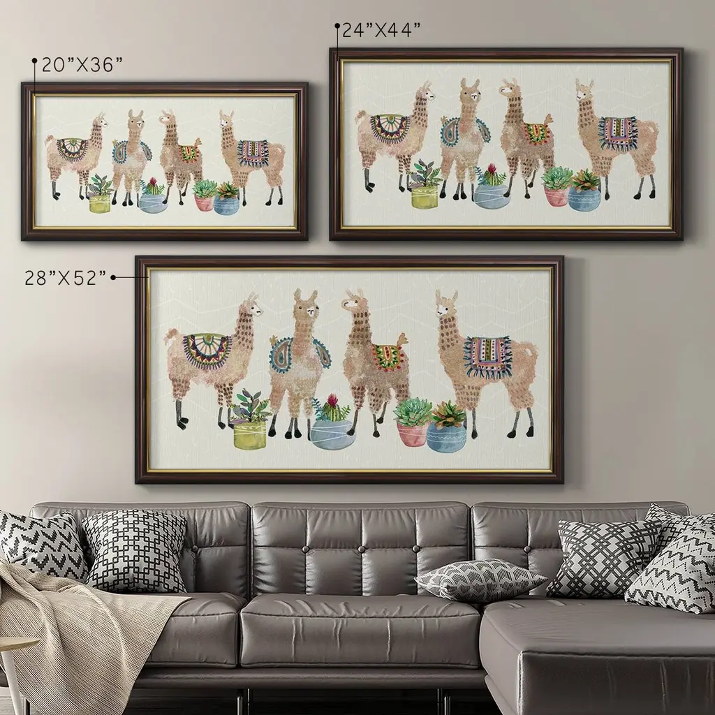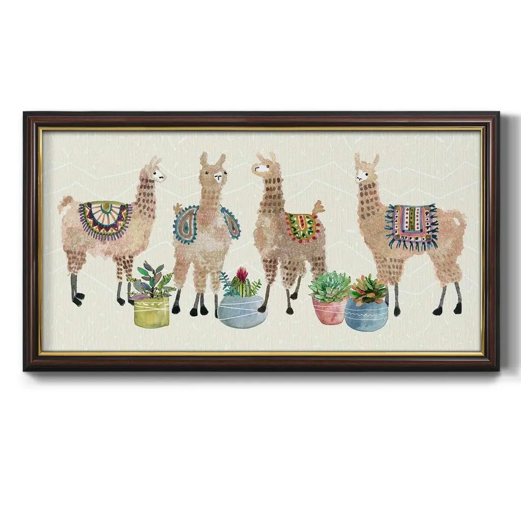 Llama Party Premium Framed Canvas- Ready to Hang A Premium Framed Canvas created to last. Framed in distressed wood and available in an array of sizes and colors Featuring a beveled a solid wood stretcher bar, each piece comes ready to hand 3 SIZES AVAILABLE 21''X37'' - Overall Size 25''X45'' - Overall Size 29''x53'' - Overall Size Each piece is made to order. Each piece comes with hanging hardware. Made in the USA Ready to Hang Giclee Paper Print Acrylic Glass Beveled Matt Board