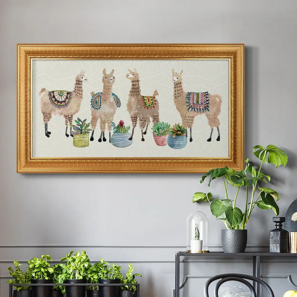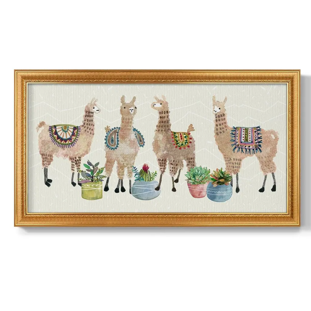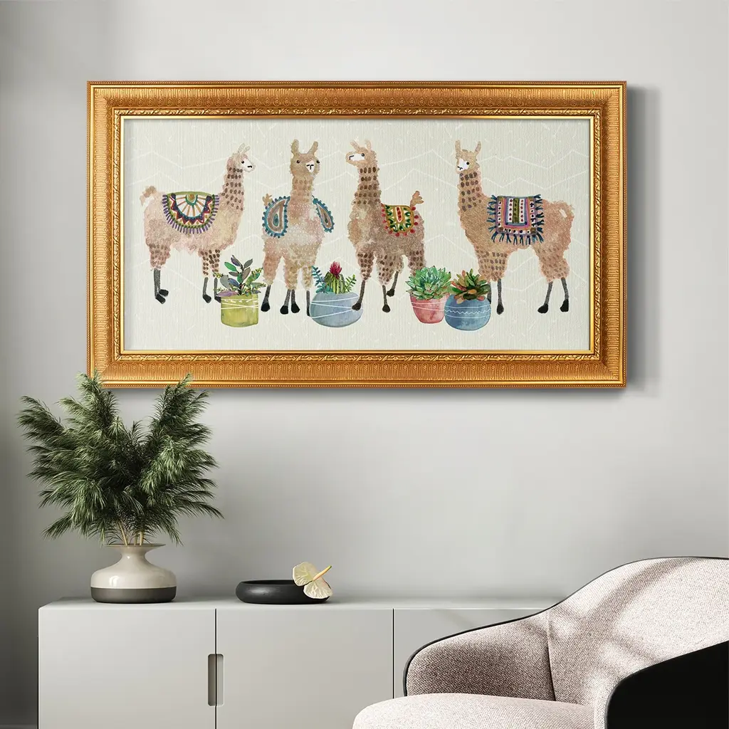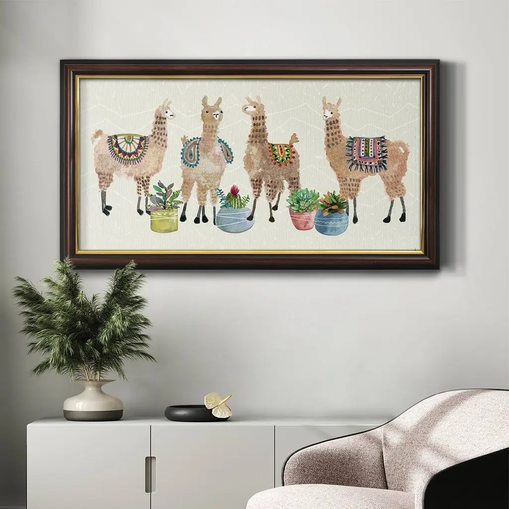Llama Party Premium Framed Canvas- Ready to Hang A Premium Framed Canvas created to last. Framed in distressed wood and available in an array of sizes and colors Featuring a beveled a solid wood stretcher bar, each piece comes ready to hand 3 SIZES AVAILABLE 21''X37'' - Overall Size 25''X45'' - Overall Size 29''x53'' - Overall Size Each piece is made to order. Each piece comes with hanging hardware. Made in the USA Ready to Hang Giclee Paper Print Acrylic Glass Beveled Matt Board