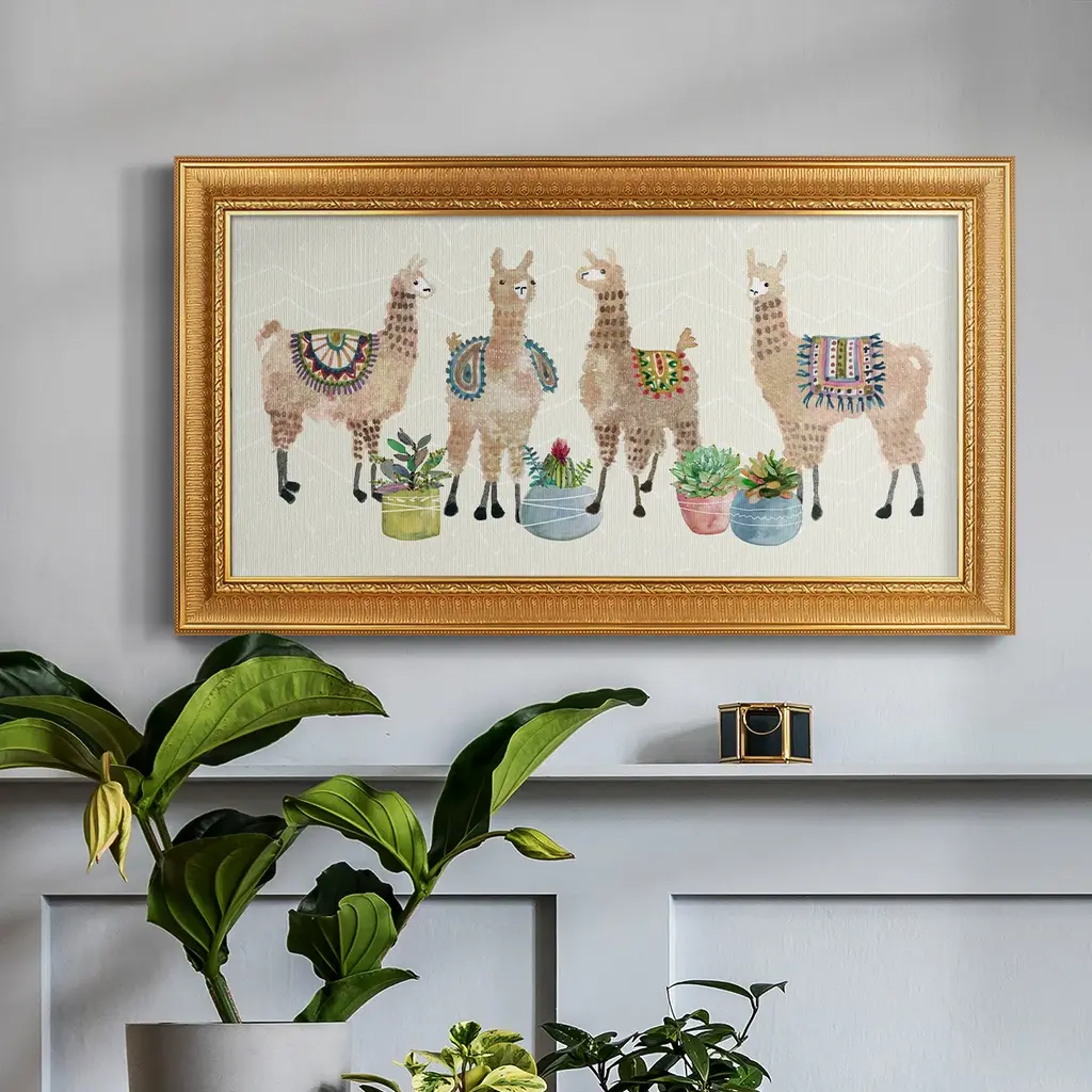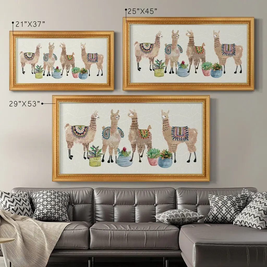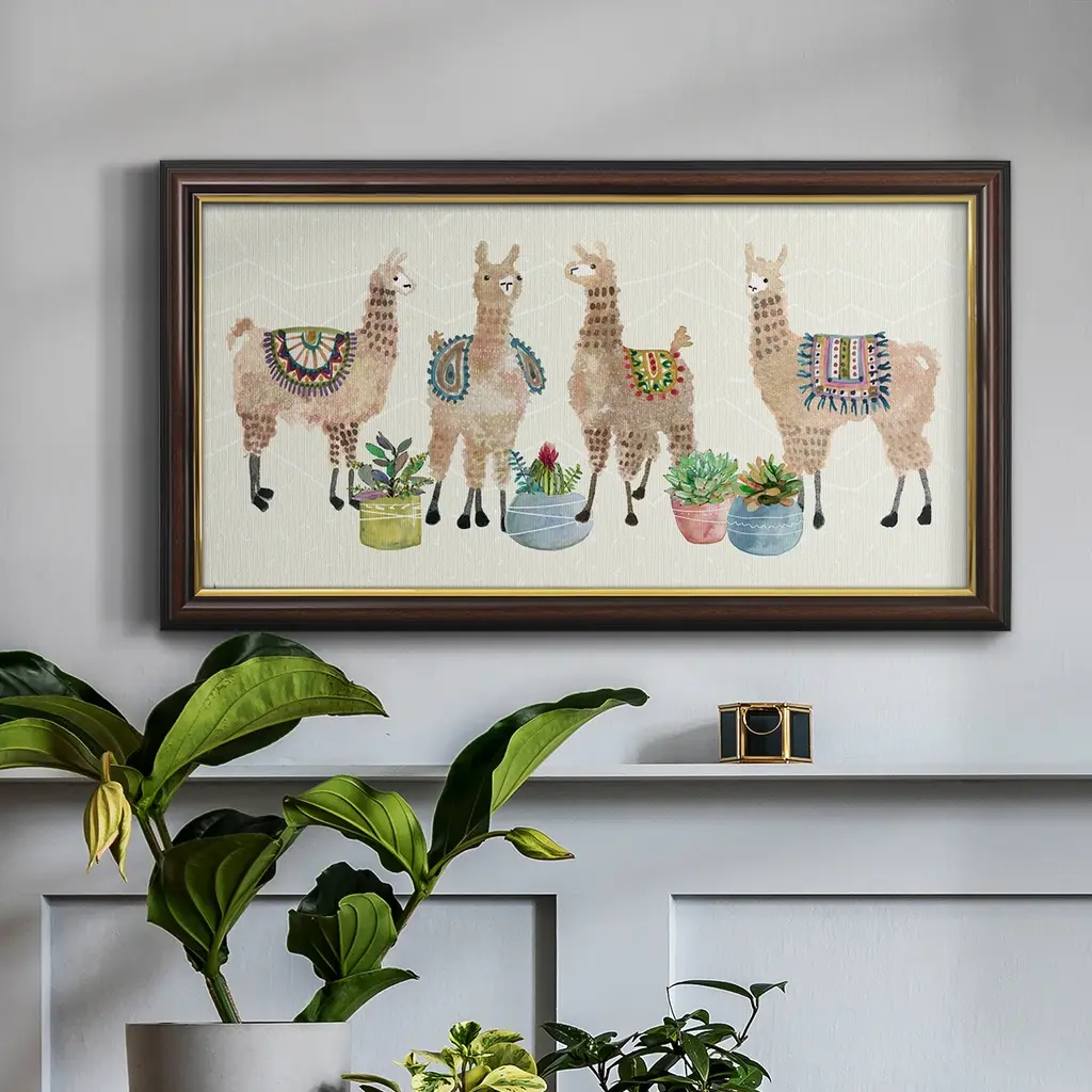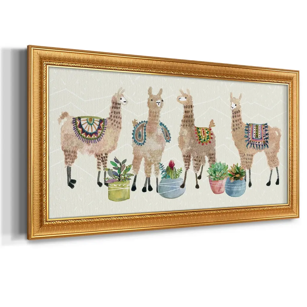 Llama Party Premium Framed Canvas- Ready to Hang A Premium Framed Canvas created to last. Framed in distressed wood and available in an array of sizes and colors Featuring a beveled a solid wood stretcher bar, each piece comes ready to hand 3 SIZES AVAILABLE 21''X37'' - Overall Size 25''X45'' - Overall Size 29''x53'' - Overall Size Each piece is made to order. Each piece comes with hanging hardware. Made in the USA Ready to Hang Giclee Paper Print Acrylic Glass Beveled Matt Board