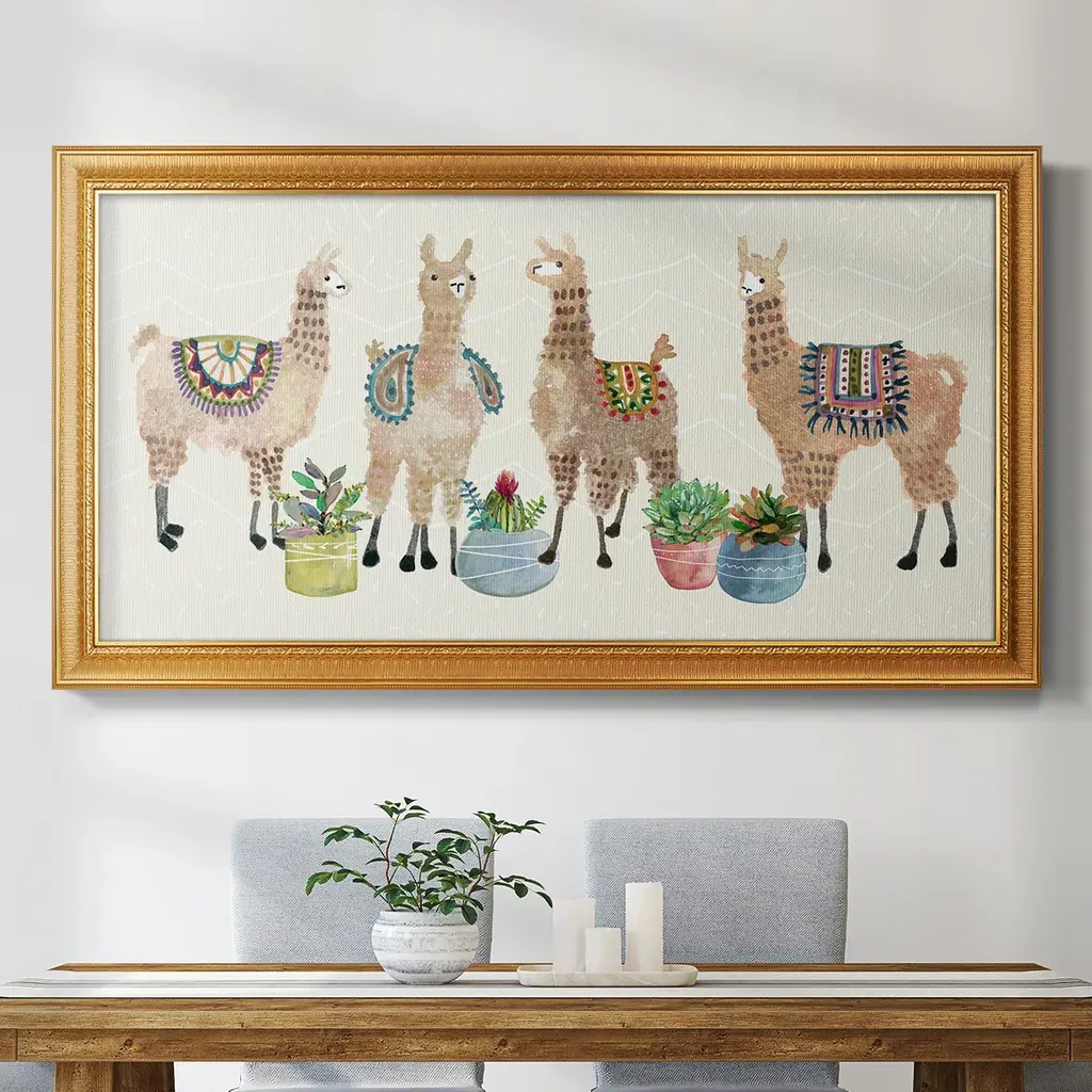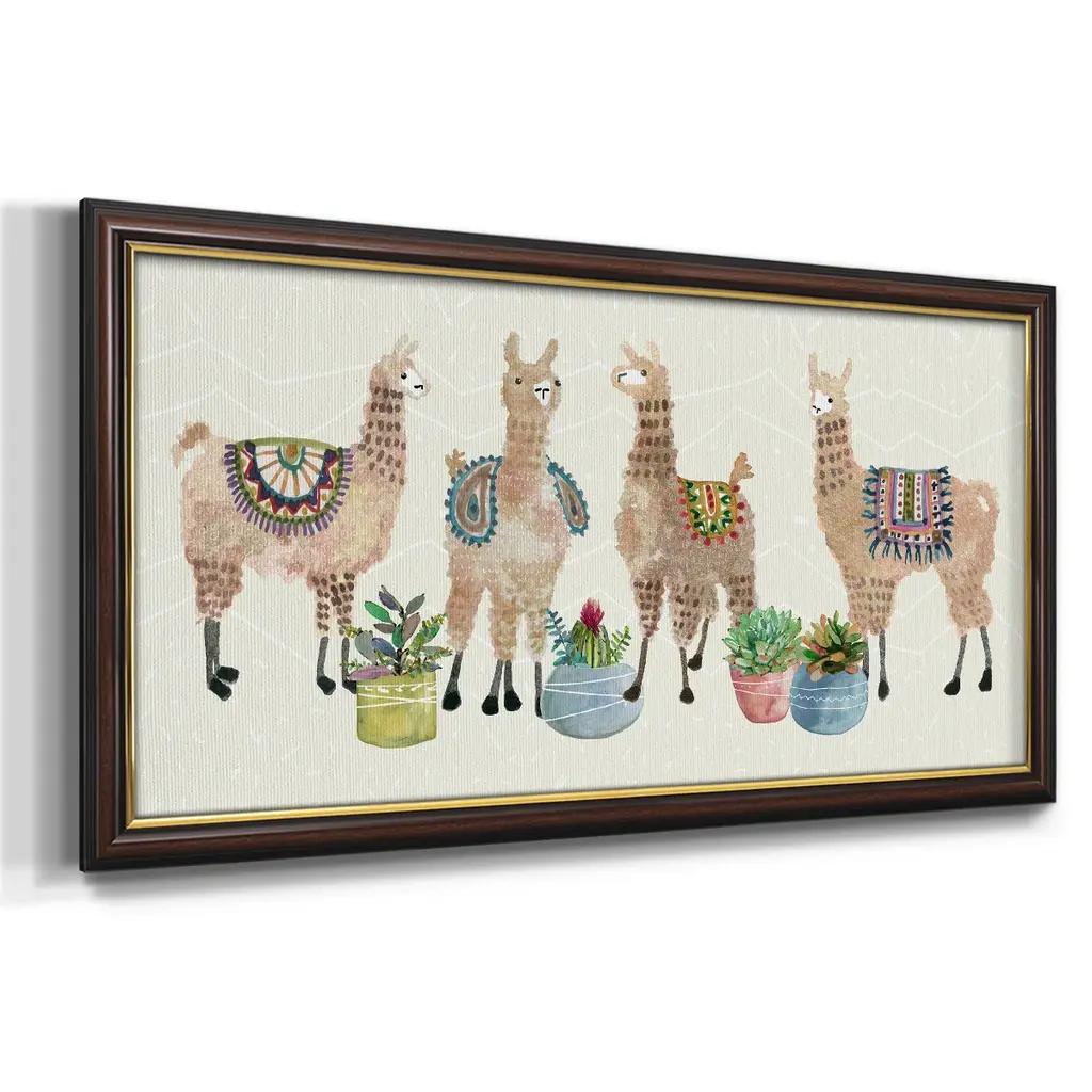 Llama Party Premium Framed Canvas- Ready to Hang A Premium Framed Canvas created to last. Framed in distressed wood and available in an array of sizes and colors Featuring a beveled a solid wood stretcher bar, each piece comes ready to hand 3 SIZES AVAILABLE 21''X37'' - Overall Size 25''X45'' - Overall Size 29''x53'' - Overall Size Each piece is made to order. Each piece comes with hanging hardware. Made in the USA Ready to Hang Giclee Paper Print Acrylic Glass Beveled Matt Board