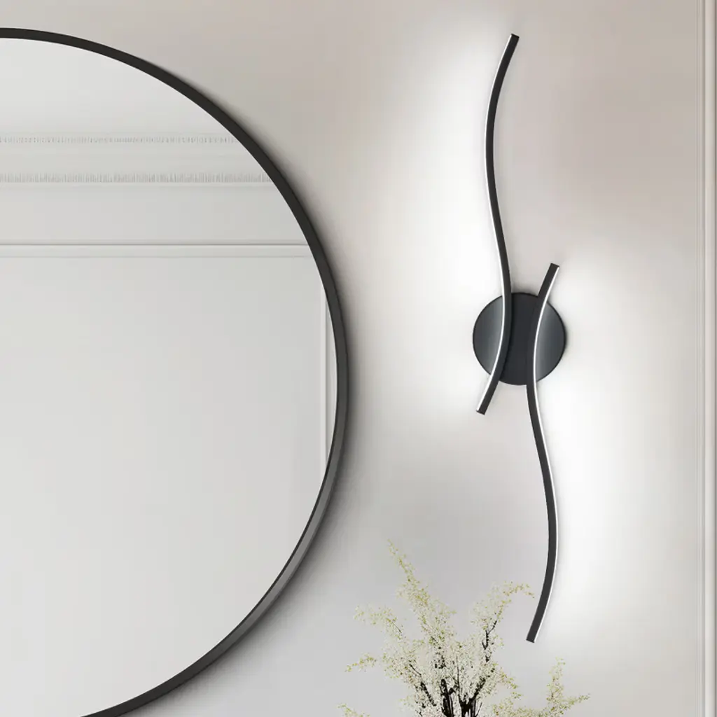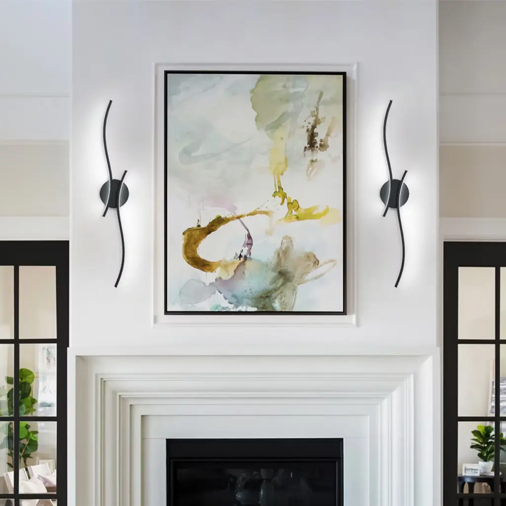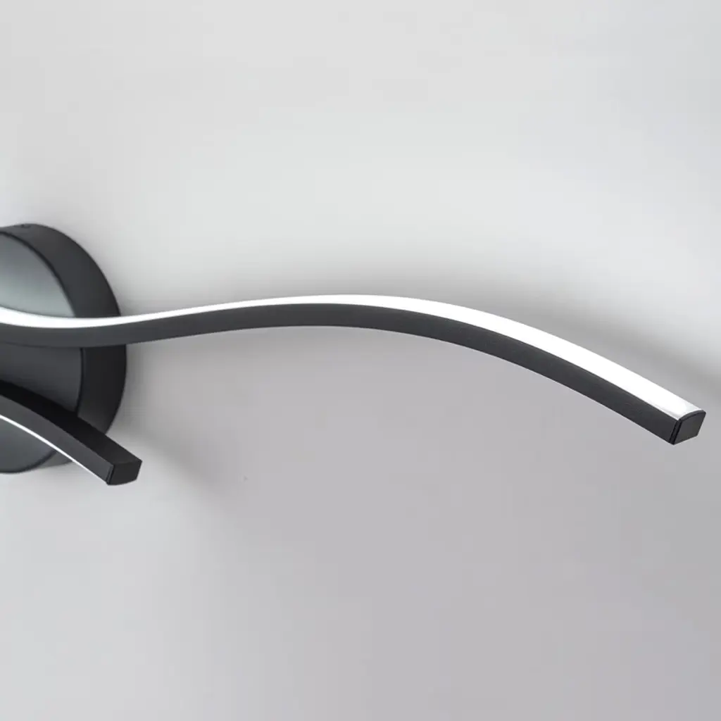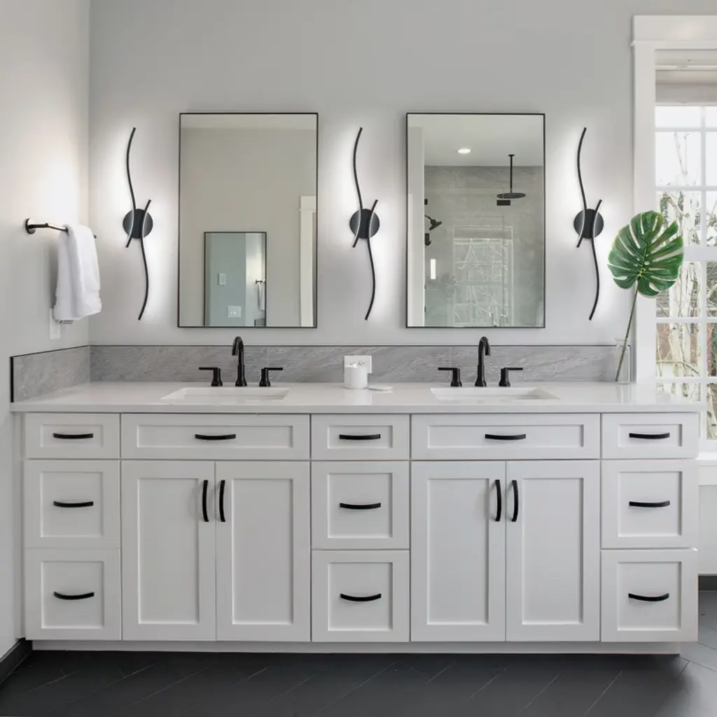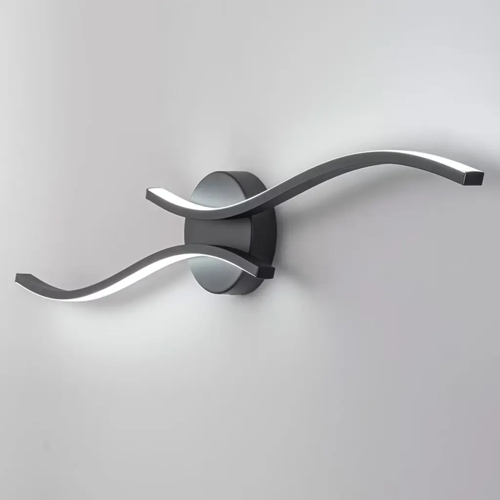 This modern 2-light LED vanity fixture in matte black features a unique wave design and aluminum construction for durability and style.it offers 6000K cool white lighting from built-in 23W LEDs, ideal for bathrooms, bedrooms, hallways, or offices. Mount it vertically or horizontally to suit your space and design needs.