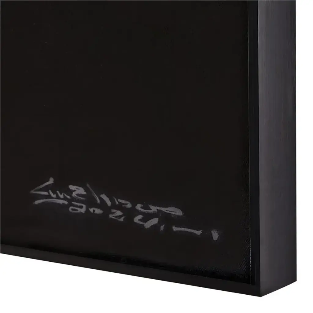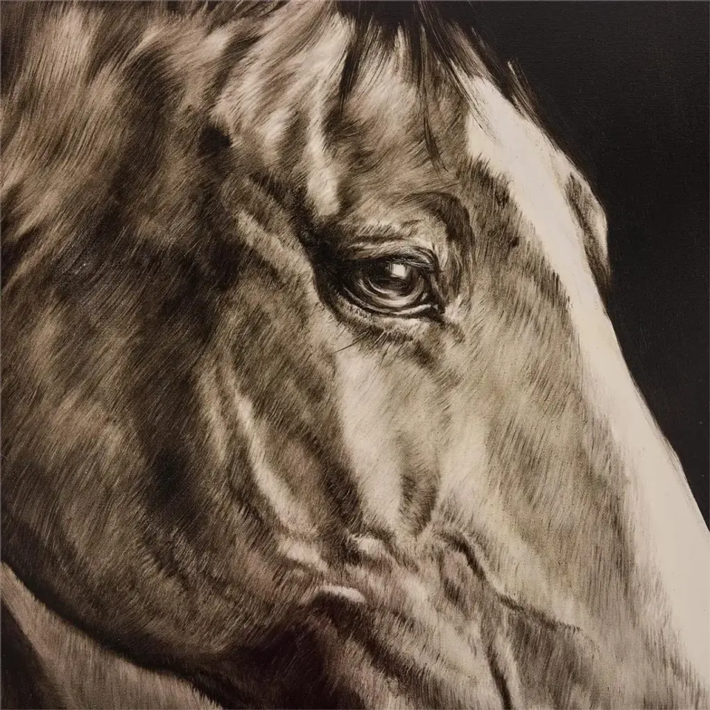 Noble Equine by artist LM Zhou is an impressive oil painting on canvas that celebrates one of nature’s most majestic creatures. Shown in grayscale, the painting depicts an intricately detailed horse in a proud pose. The piece is held within a black aluminum gallery frame and may only be displayed from a vertical orientation.