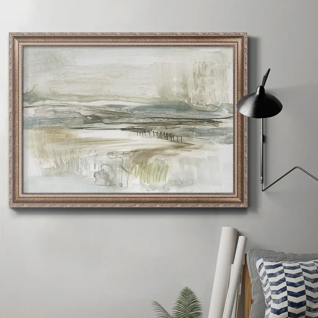 Sylvan Stroll by artist LM Zhou is a serene oil painting on canvas that depicts gorgeous trees in pastel tones below a gray sky. This soothing natural motif is displayed within a gold gallery frame.