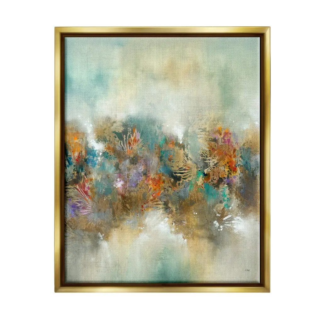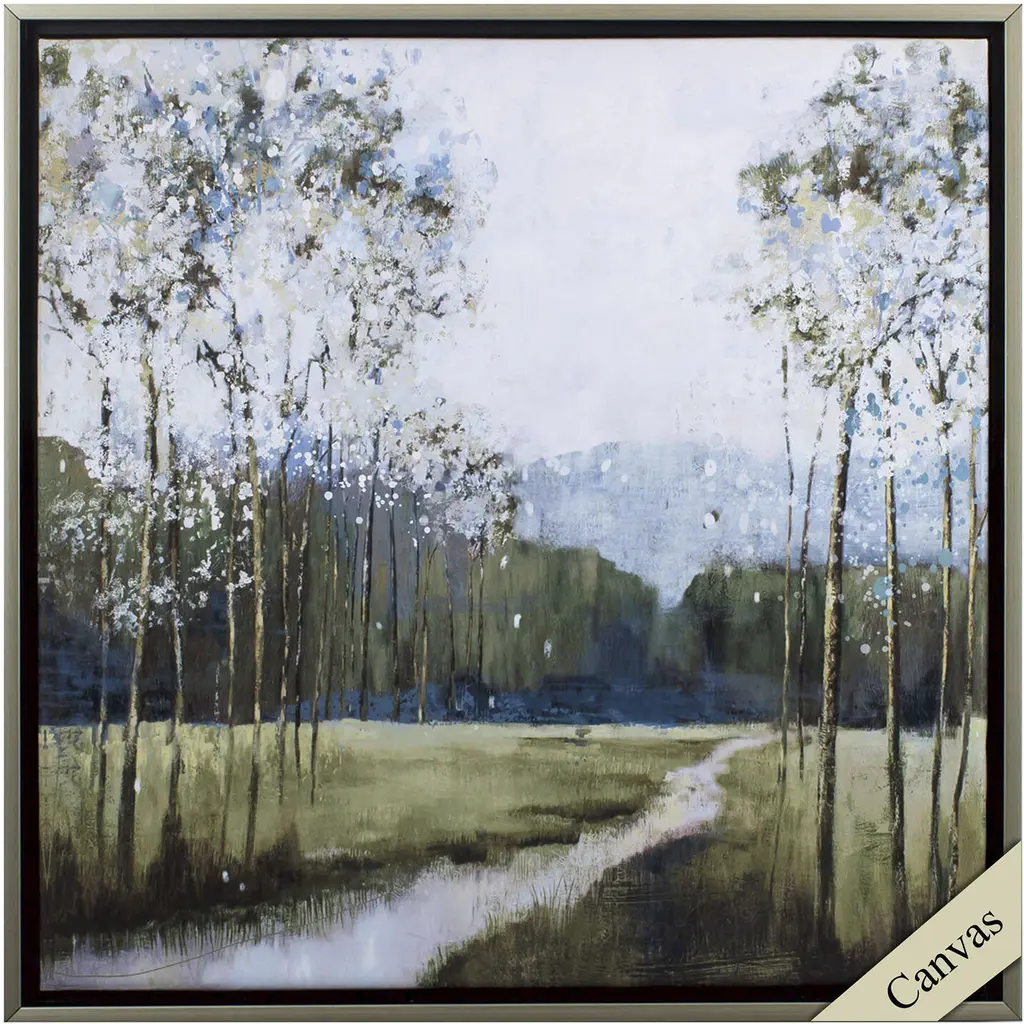 Sylvan Stroll by artist LM Zhou is a serene oil painting on canvas that depicts gorgeous trees in pastel tones below a gray sky. This soothing natural motif is displayed within a gold gallery frame.