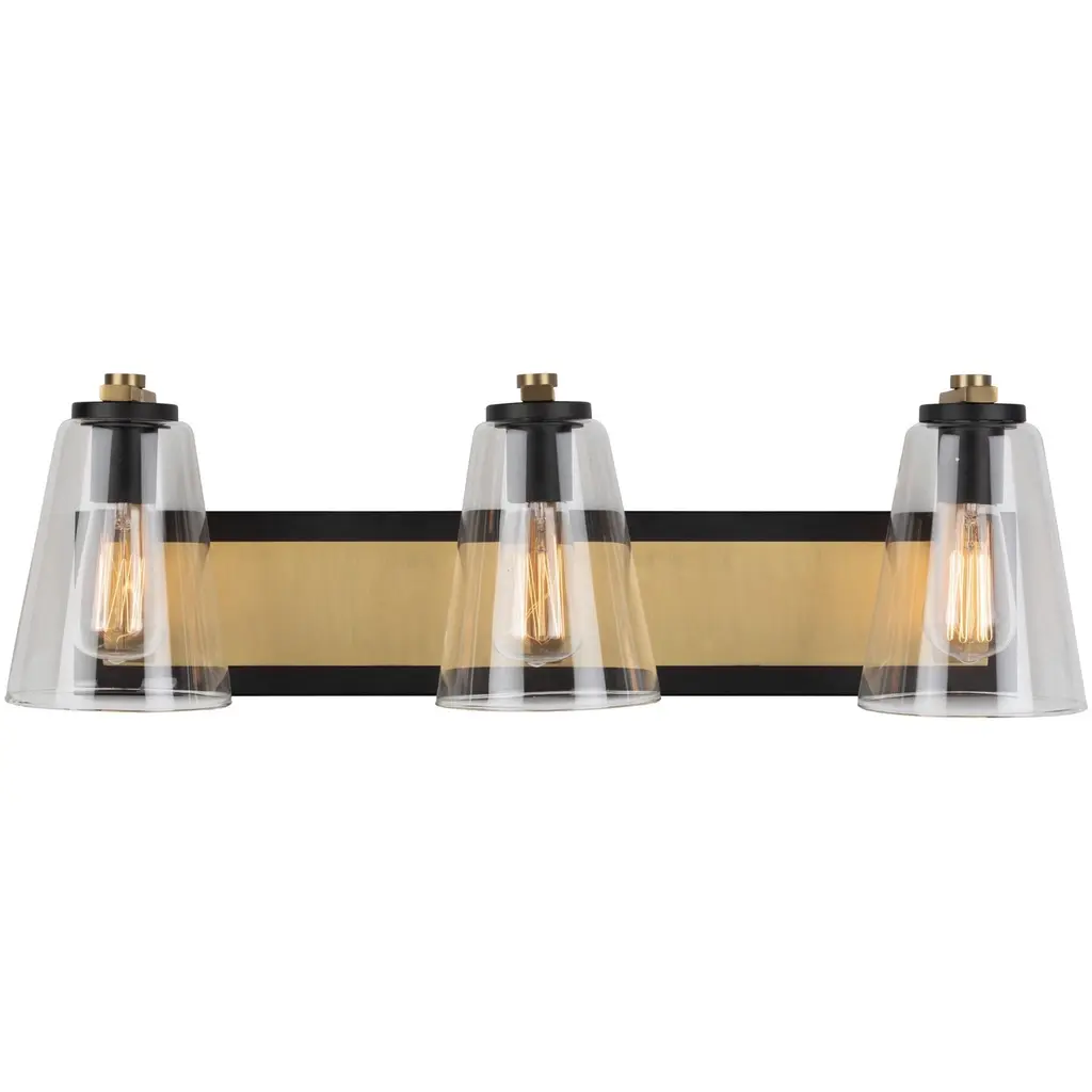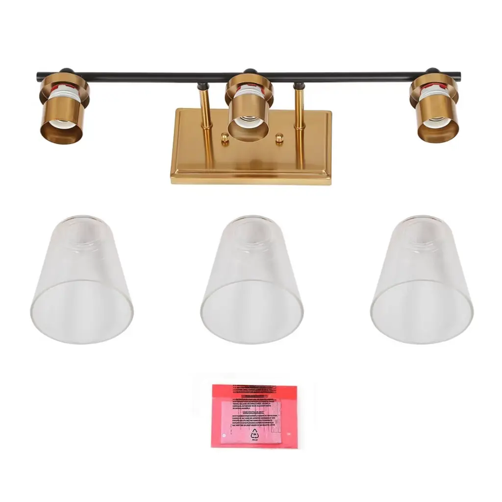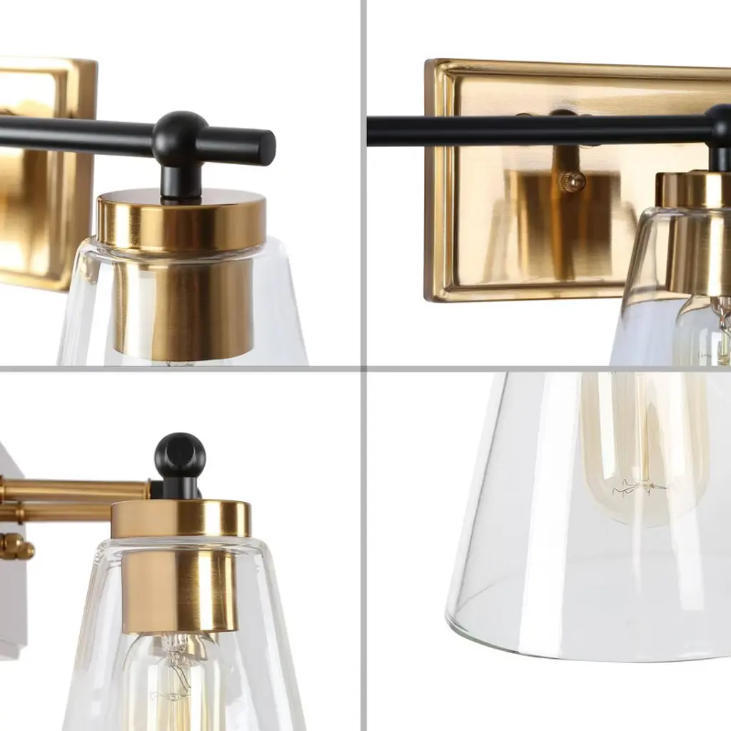 Bring classic charm and modern flair to your bathroom with this versatile vanity light set. Featuring a warm brass finish, black accents, and clear cone glass shades, this design blends seamlessly with both traditional and contemporary decor. Perfect for over-the-mirror illumination or as single sconces beside the vanity. Compatible with dimmable bulbs for tailored lighting.