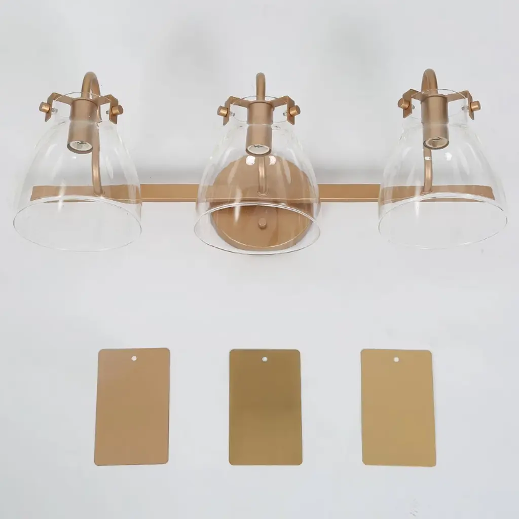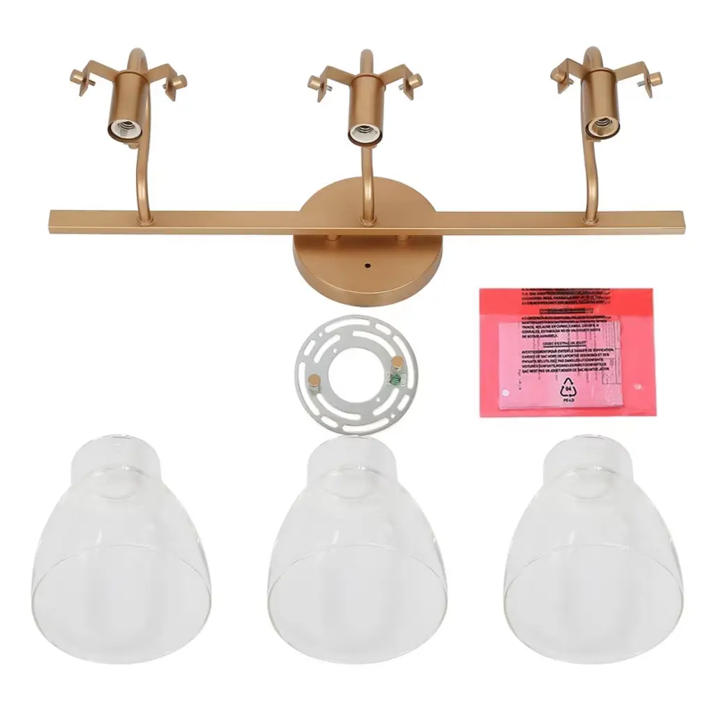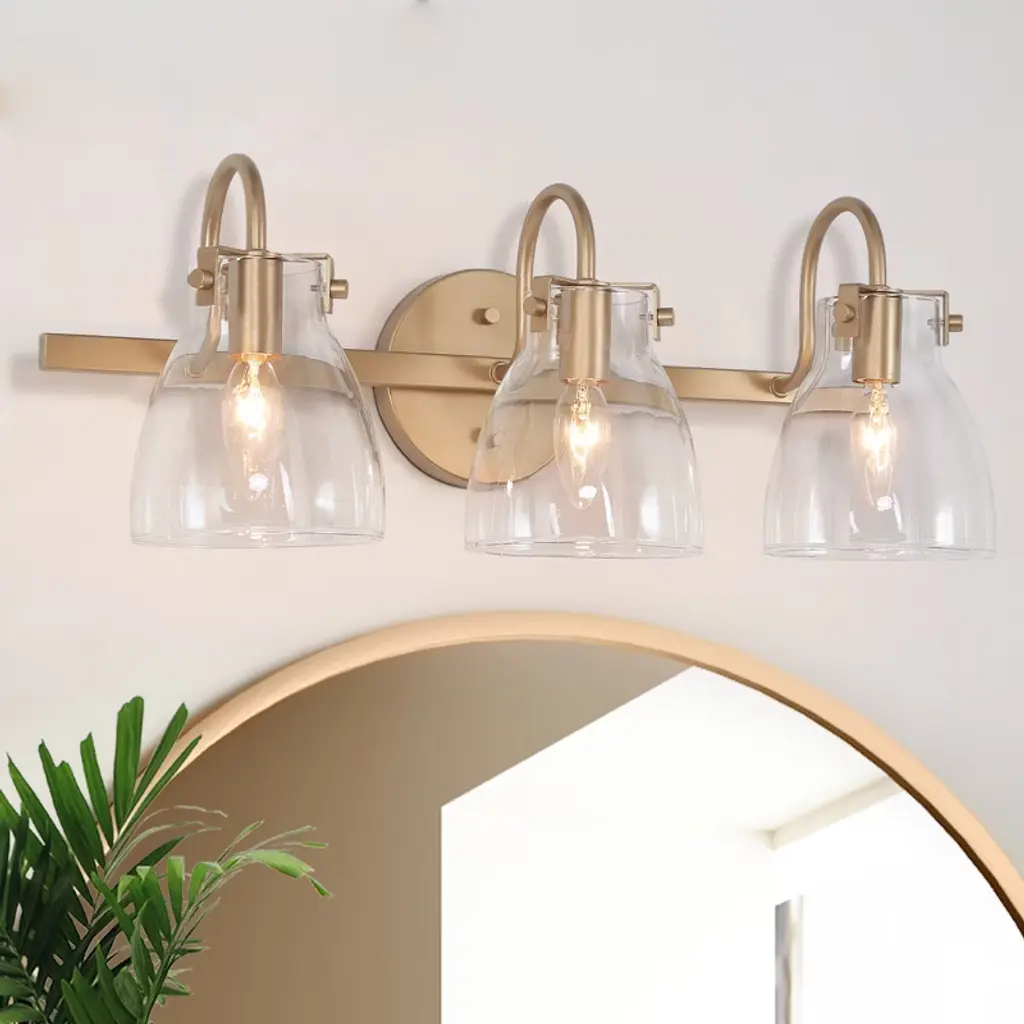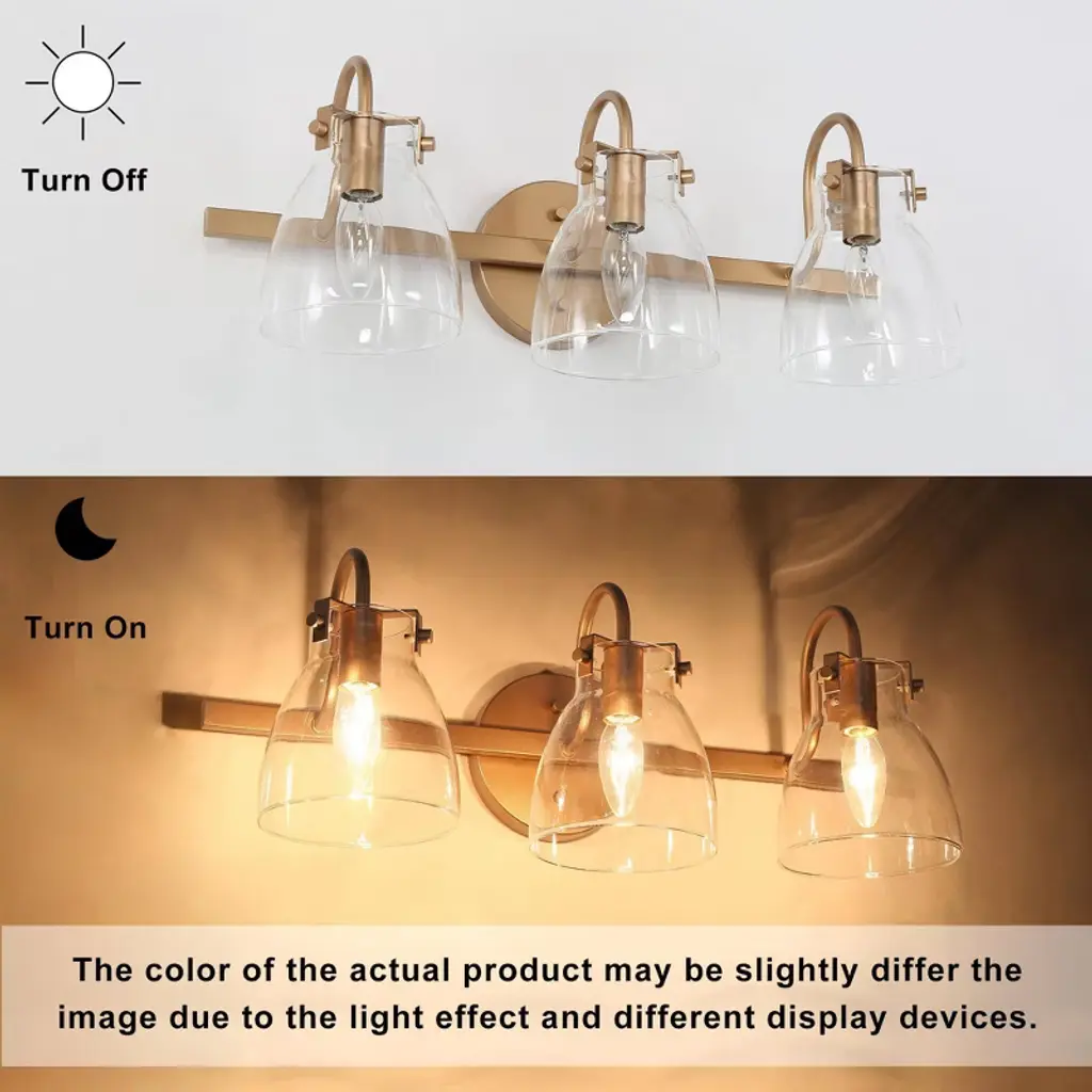 The LNC Charm 3-light modern vanity light bar exudes elegance with its lustrous gold finish and a trio of clear glass shades, each delicately balanced to cast a warm, welcoming glow. This gold bathroom vanity light combines contemporary and modern elements, making it a versatile addition to any decor style. The clear glass shades provide a clean, crisp look that contrasts elegantly with the gold base, creating a chic lighting fixture that fits seamlessly into luxurious, modern, and even transitional bathrooms. Perfect for bathrooms, powder rooms, or vanity areas, this light bar is designed to be mounted above a mirror or vanity, providing ample illumination for daily routines. The compact, wall-mounted design suits smaller spaces while adding a polished, modern touch, making it ideal for both residential and guest bathrooms alike.