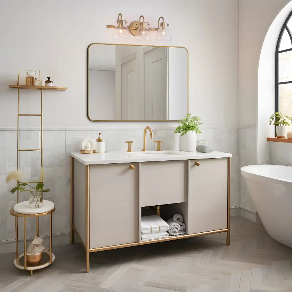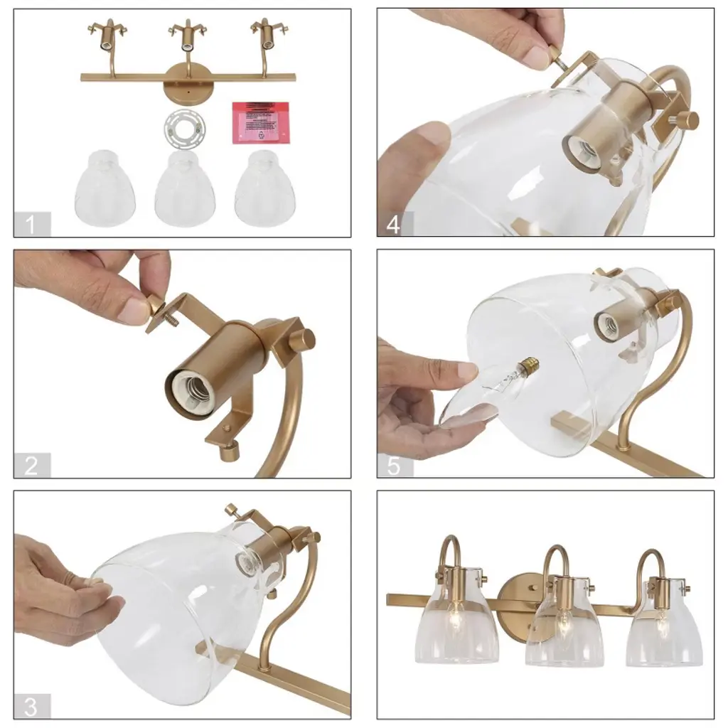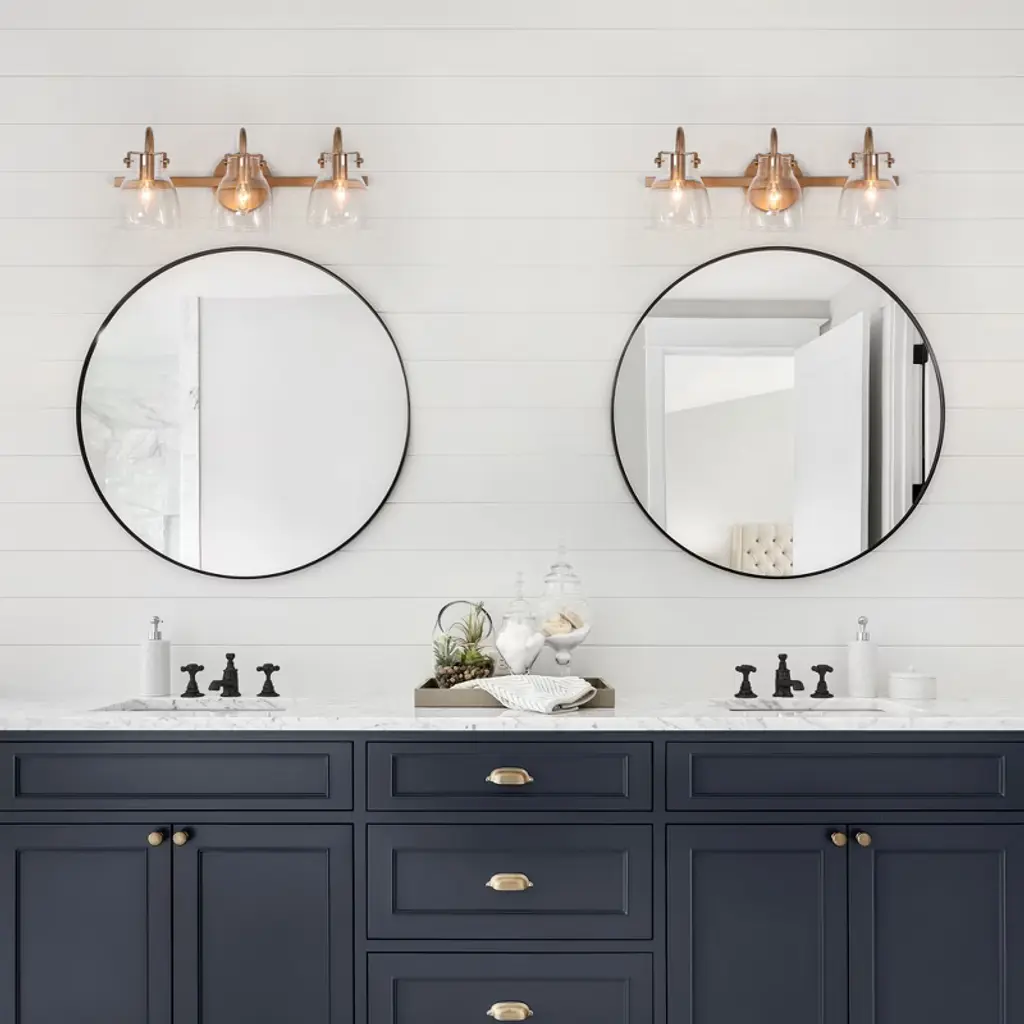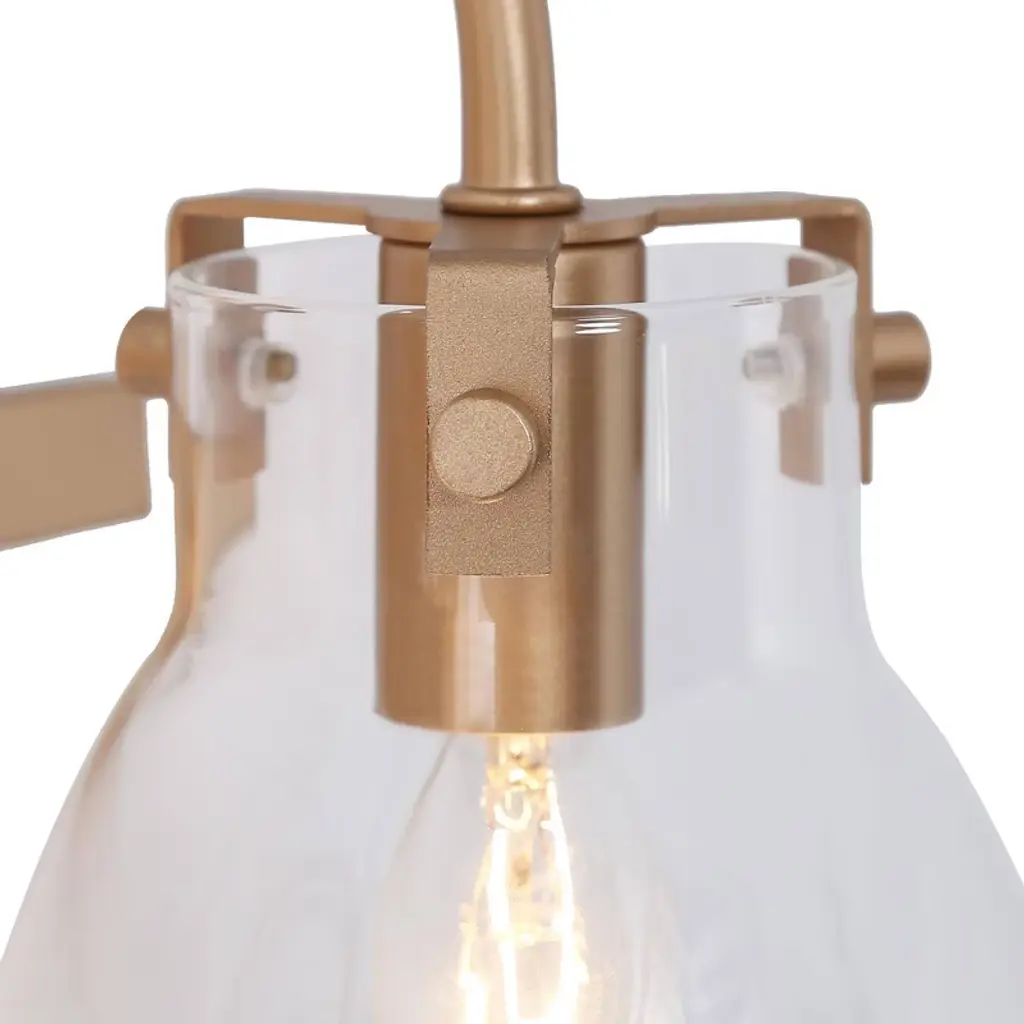 The LNC Charm 3-light modern vanity light bar exudes elegance with its lustrous gold finish and a trio of clear glass shades, each delicately balanced to cast a warm, welcoming glow. This gold bathroom vanity light combines contemporary and modern elements, making it a versatile addition to any decor style. The clear glass shades provide a clean, crisp look that contrasts elegantly with the gold base, creating a chic lighting fixture that fits seamlessly into luxurious, modern, and even transitional bathrooms. Perfect for bathrooms, powder rooms, or vanity areas, this light bar is designed to be mounted above a mirror or vanity, providing ample illumination for daily routines. The compact, wall-mounted design suits smaller spaces while adding a polished, modern touch, making it ideal for both residential and guest bathrooms alike.