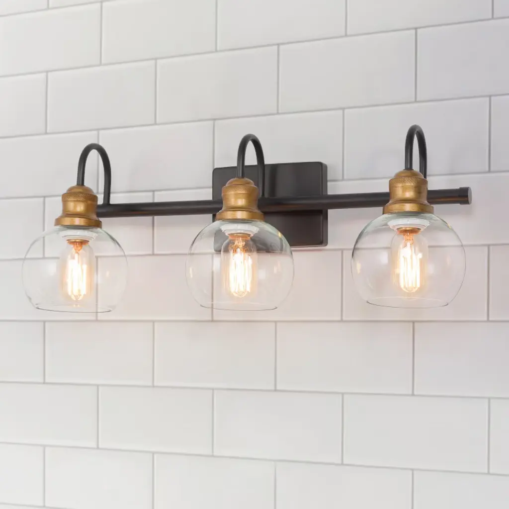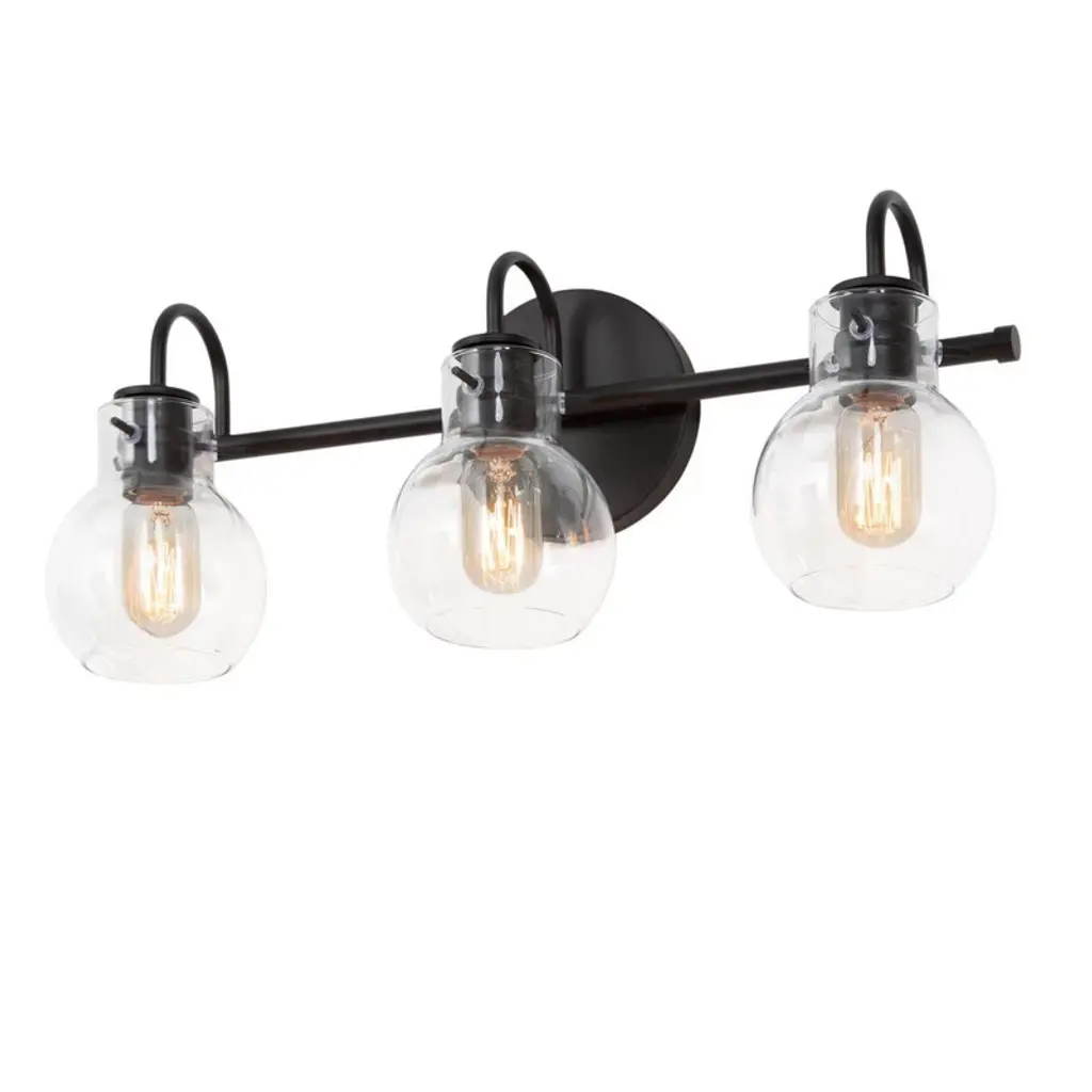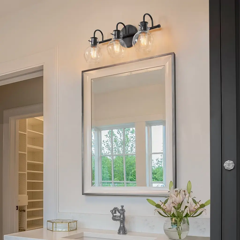 Elevate the style and functionality of your bathroom with the LNC Home Glass Black Vanity Light. This 3-light vanity lighting for bathroom features a sleek matte black finish and stunning clear glass kettle-like shades that gracefully encase three medium-base bulbs, providing ample, even illumination for vanity mirrors, countertops, and surrounding wall areas. The minimalist black backplate and elegantly curved arms offer a soft, modern touch, perfectly complementing the overall design. With our innovative outer-fixation design, installing and replacing bulbs is made effortless, ensuring a safe and user-friendly experience. Experience the perfect blend of style and functionality with this modern farmhouse wall vanity light.