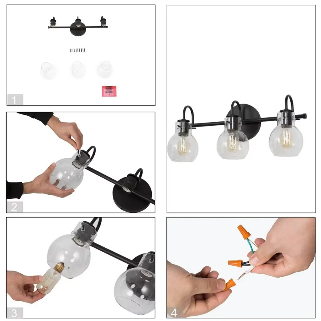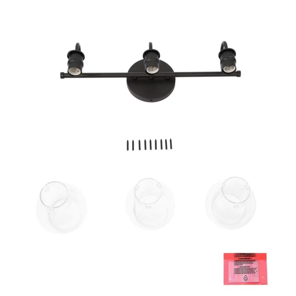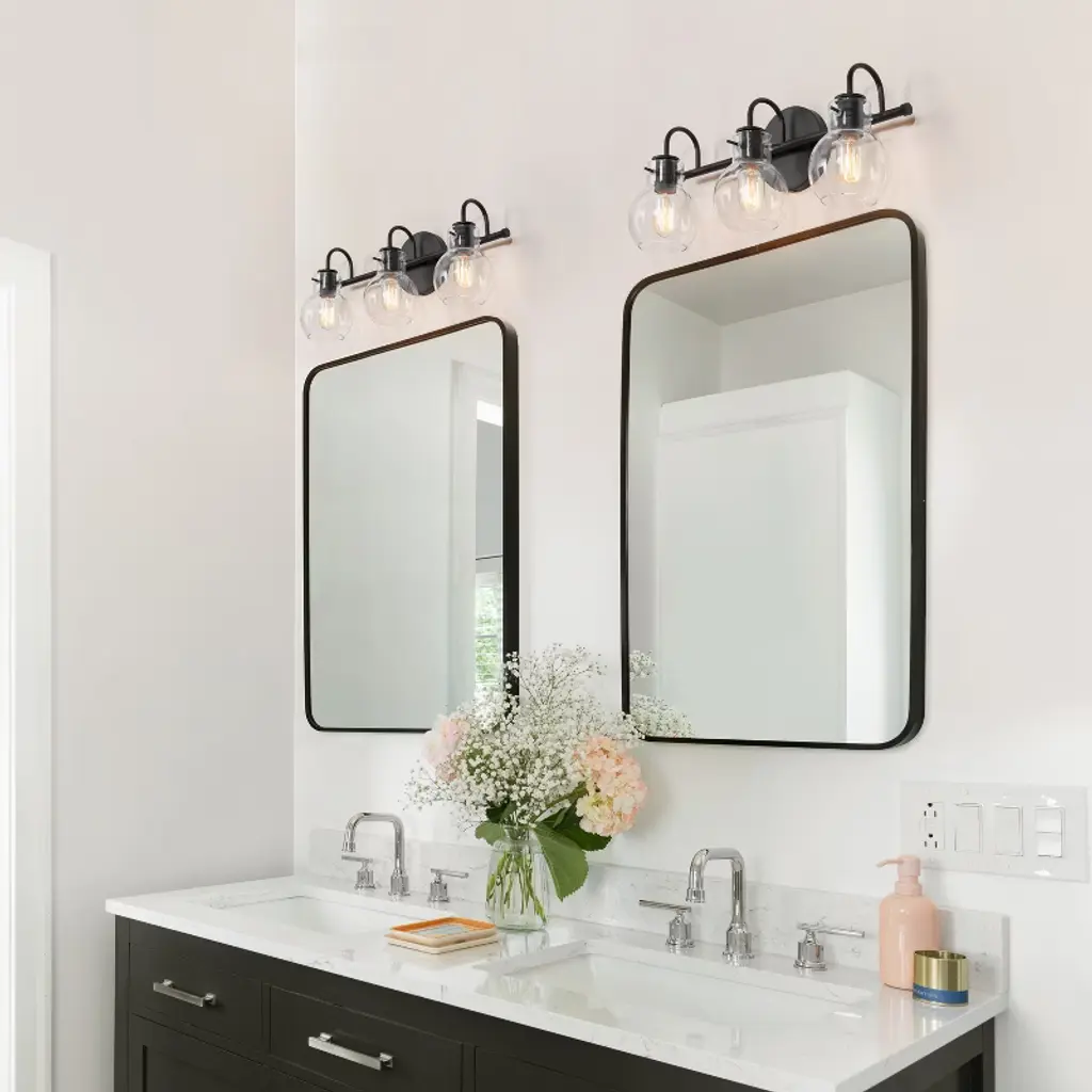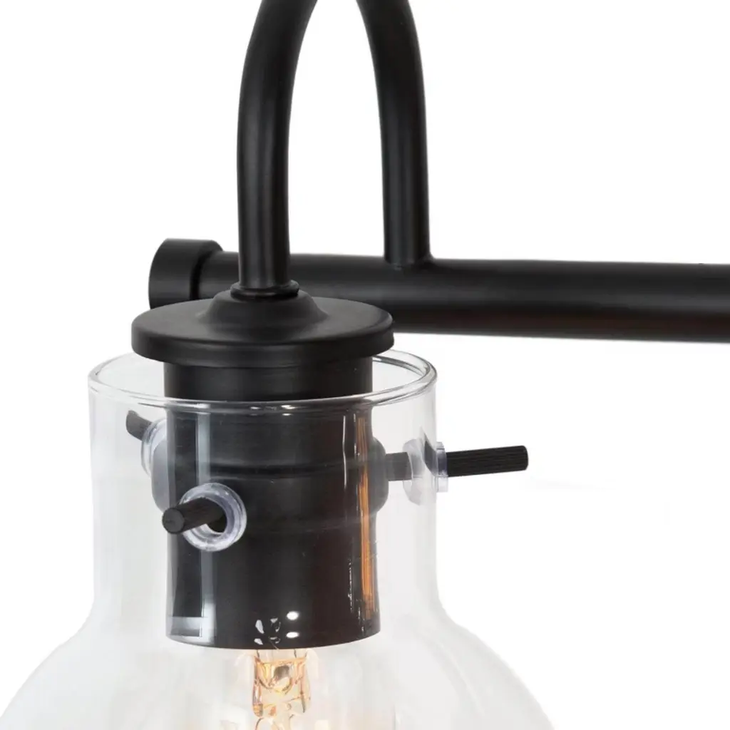 Elevate the style and functionality of your bathroom with the LNC Home Glass Black Vanity Light. This 3-light vanity lighting for bathroom features a sleek matte black finish and stunning clear glass kettle-like shades that gracefully encase three medium-base bulbs, providing ample, even illumination for vanity mirrors, countertops, and surrounding wall areas. The minimalist black backplate and elegantly curved arms offer a soft, modern touch, perfectly complementing the overall design. With our innovative outer-fixation design, installing and replacing bulbs is made effortless, ensuring a safe and user-friendly experience. Experience the perfect blend of style and functionality with this modern farmhouse wall vanity light.