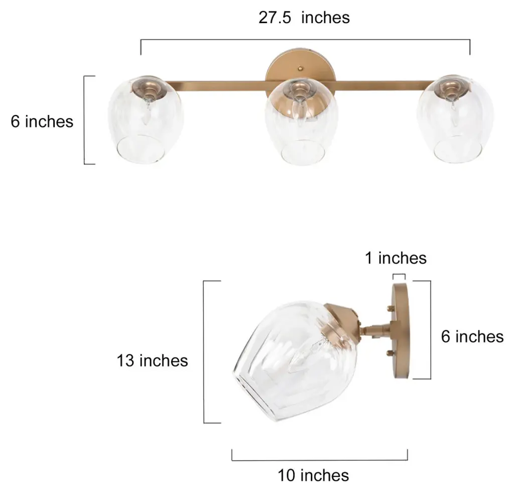 This modern 3-light gold bathroom vanity light is a must-have addition to your bathroom, whether you need a close shave or an extra dab of makeup. This piece has a round backplate and a sleek pipe-inspired rod in a gold finish for some glam style to your space. Hand-painted gold finishes brings a modern yet elegant style, adding more crafts charm to this bathroom vanity light.Mount the bath bracket facing up or down, around or over a bathroom mirror to banish shadows from your face while getting ready for the day or an evening out.Fixture dimensions: L27.5" • W10" • H13" Manufacturer Color/Finish:GoldStyle:ModernFixture Material:MetalNumber of Lights:3Bulb: 120V/TypeB,Max 40W, E12(Bulb not include)Additional Tools Required (Not Included):All Tools IncludedPower Source:HardwiredDimmable: YesWarranty: 2 years (Accessories Free Replacement )