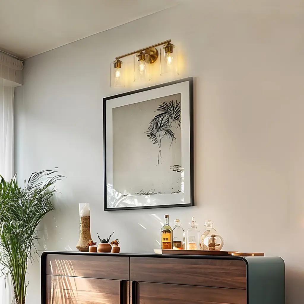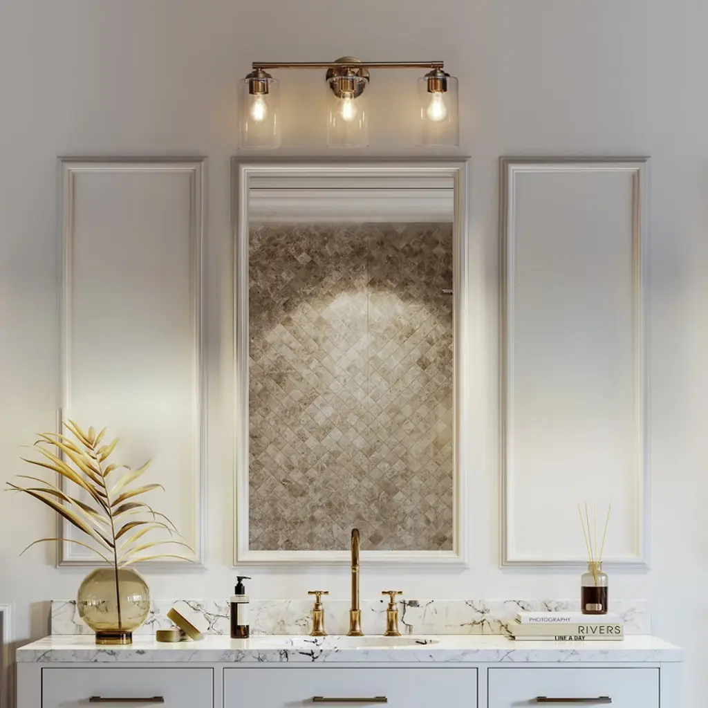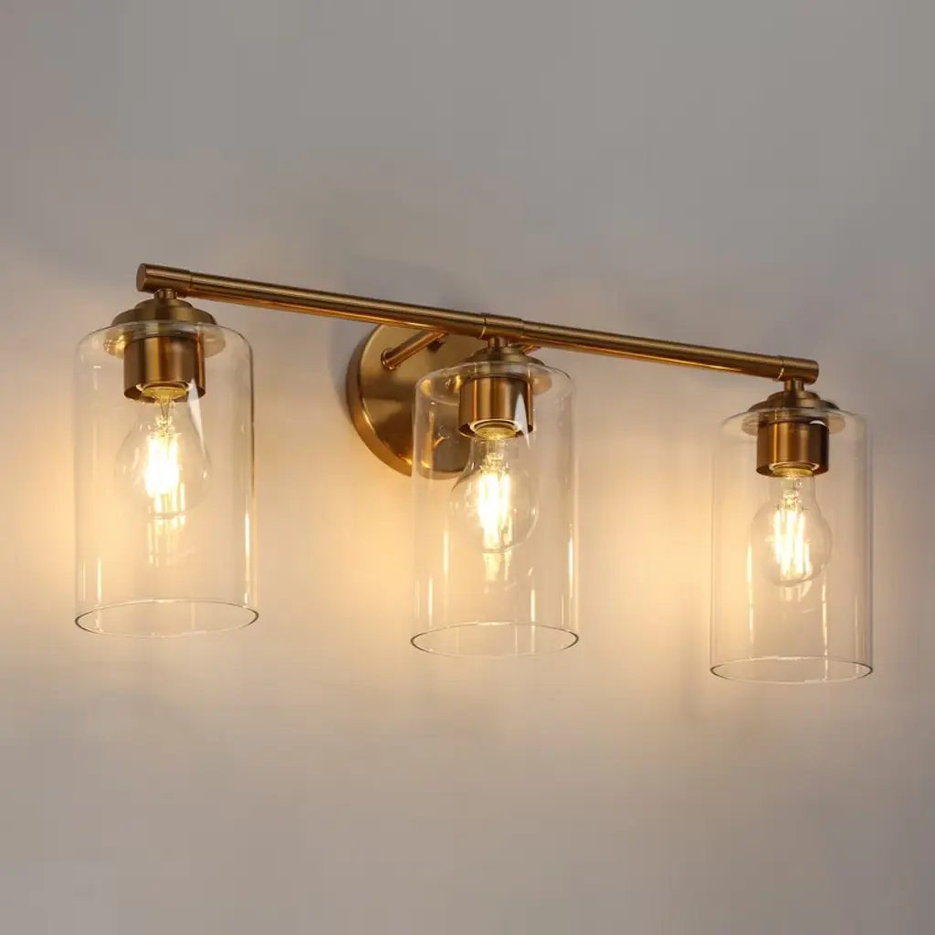 Introducing the LNC 3-Light Vanity Light, a sophisticated choice for elevating your bathroom decor. This vanity lamp boasts an exquisite polished gold finish and distinctive cylinder clear glass shades, which combine to create an engaging and unique lighting effect. This distinct design seamlessly blends functionality with aesthetics, ensuring an optimal lighting experience. With its practical and elegant design, this bathroom light simplifies your daily morning routine for a seamless and convenient experience.