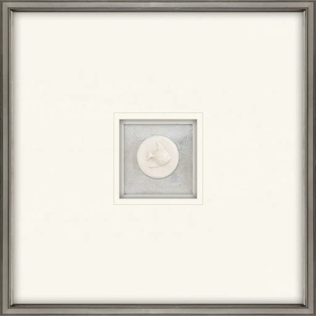 Traditional intaglios are matted in white and feature a hand applied silver leaf backdrop with waxing. Framed in a silver wood shadow box style frame.