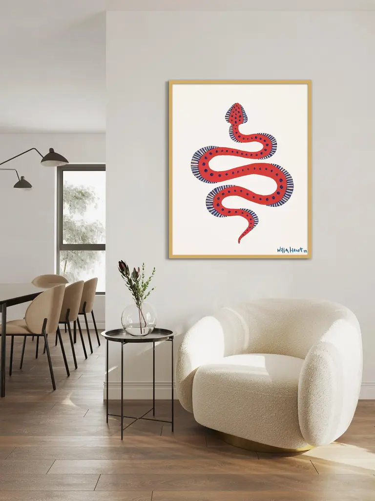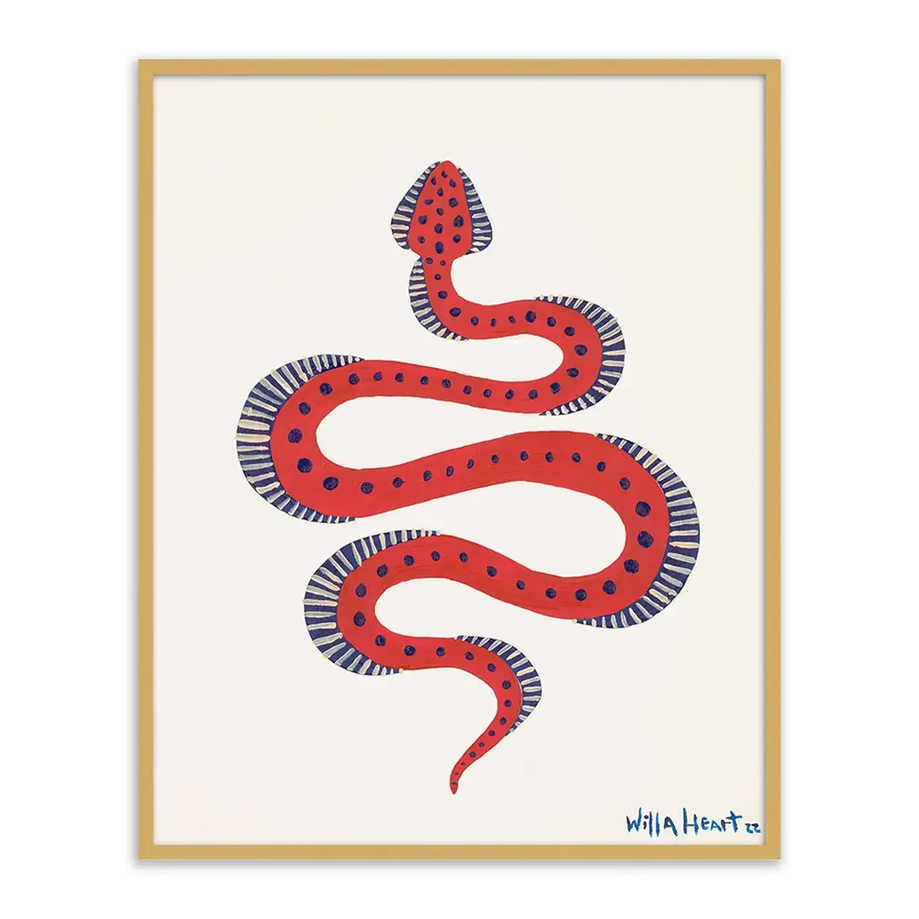 DESCRIPTION: Lobster the Snake by Willa Heart in Gold Frame, Large Art Print SPECIFICATIONS: Type: Giclée Art Print on Matte Paper. Overall Size (in): 32x40. Image Size (in): 31x39. Orientation: Vertical. Flush/Float/Matted: Flush. Frame Color: Gold. Hanging Hardware: Picture Perfect. FRAMING: Each art work arrives framed and ready to hang. We use handmade frames with a plexiglass glazing front, because it offers less glare than standard glass. At this time, we only offer framed prints. ARTIST BIO: Willa Heart is the brainchild of artist and designer Alyssa Jill Harris. Alyssa was born and raised in Boston, MA, and currently lives in Camden, SC. After being diagnosed at a young age as dyslexic, Alyssa’s mother (whose middle name is Willa) immersed her in the arts knowing her strengths would lie outside of the classroom. Alyssa credits her dyslexia for allowing her to see the world differently, which has made her extra creative. Alyssa has attended University of Hartford Art School, School of the Museum of Fine Arts Boston, North Bennet Street School, & Boca Raton Museum Art School.