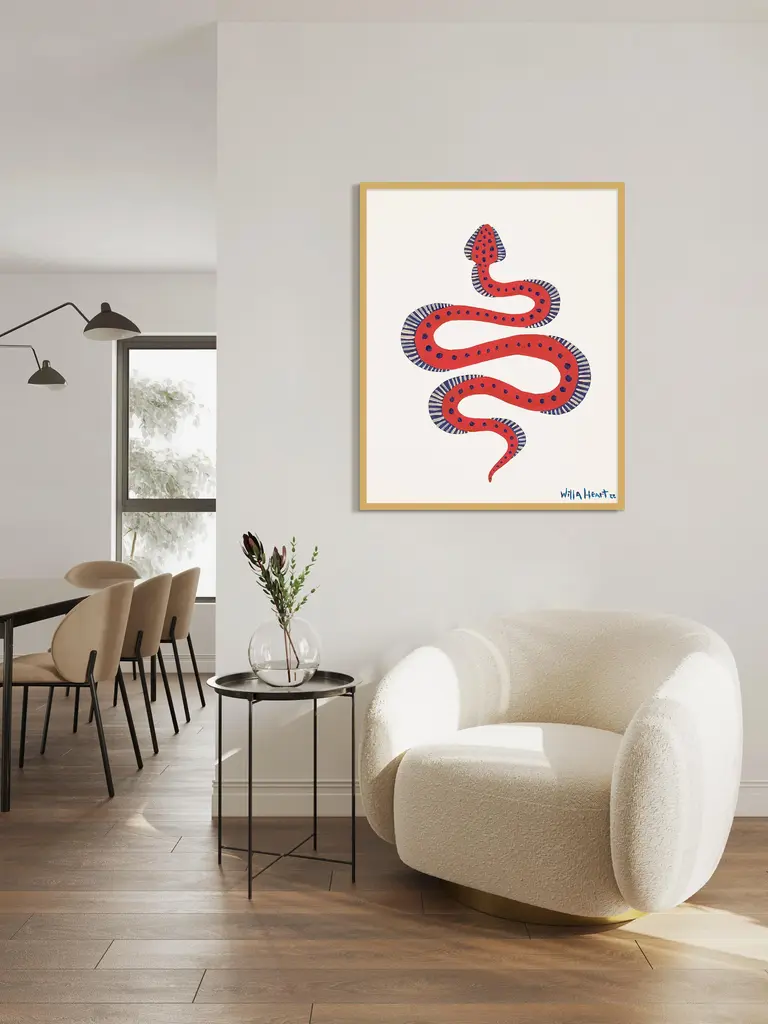 DESCRIPTION: Lobster the Snake by Willa Heart in Gold Frame, Medium Art Print SPECIFICATIONS: Type: Giclée Art Print on Matte Paper. Overall Size (in): 29x36. Image Size (in): 28x35. Orientation: Vertical. Flush/Float/Matted: Flush. Frame Color: Gold. Hanging Hardware: Picture Perfect. FRAMING: Each art work arrives framed and ready to hang. We use handmade frames with a plexiglass glazing front, because it offers less glare than standard glass. At this time, we only offer framed prints. ARTIST BIO: Willa Heart is the brainchild of artist and designer Alyssa Jill Harris. Alyssa was born and raised in Boston, MA, and currently lives in Camden, SC. After being diagnosed at a young age as dyslexic, Alyssa’s mother (whose middle name is Willa) immersed her in the arts knowing her strengths would lie outside of the classroom. Alyssa credits her dyslexia for allowing her to see the world differently, which has made her extra creative. Alyssa has attended University of Hartford Art School, School of the Museum of Fine Arts Boston, North Bennet Street School, & Boca Raton Museum Art School.