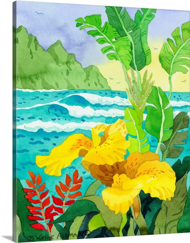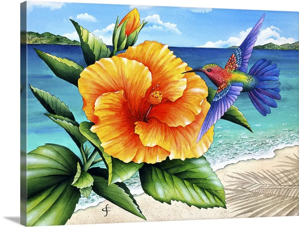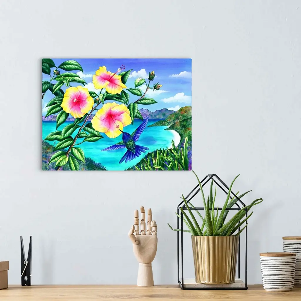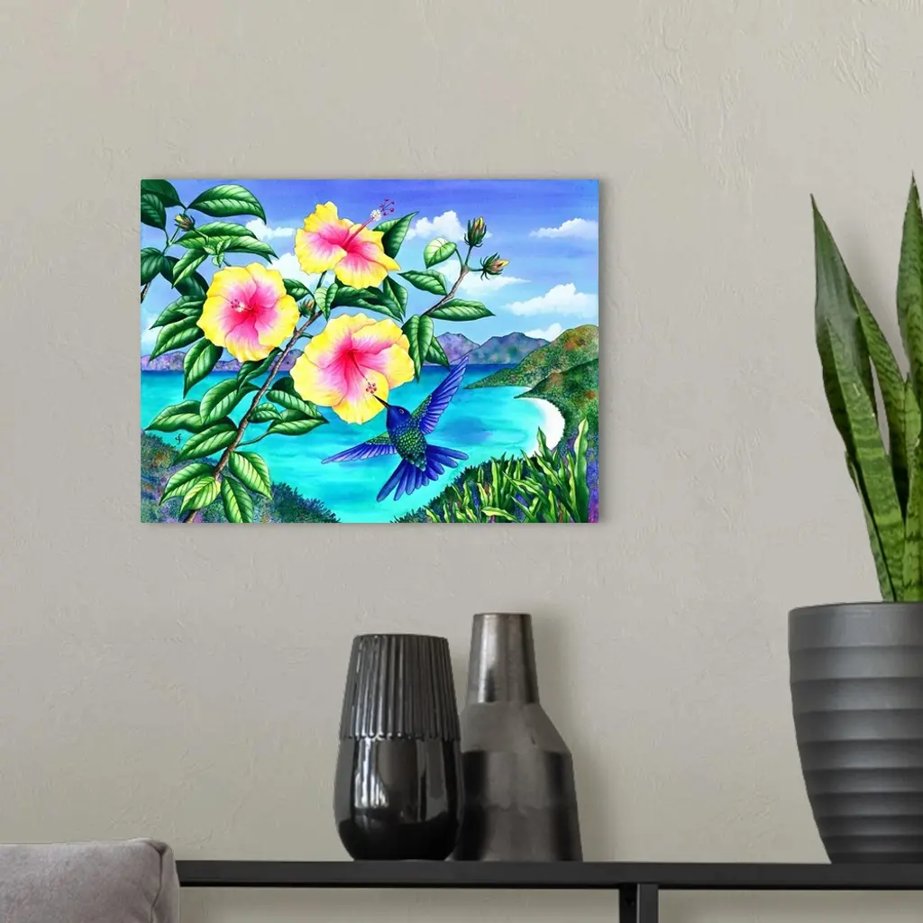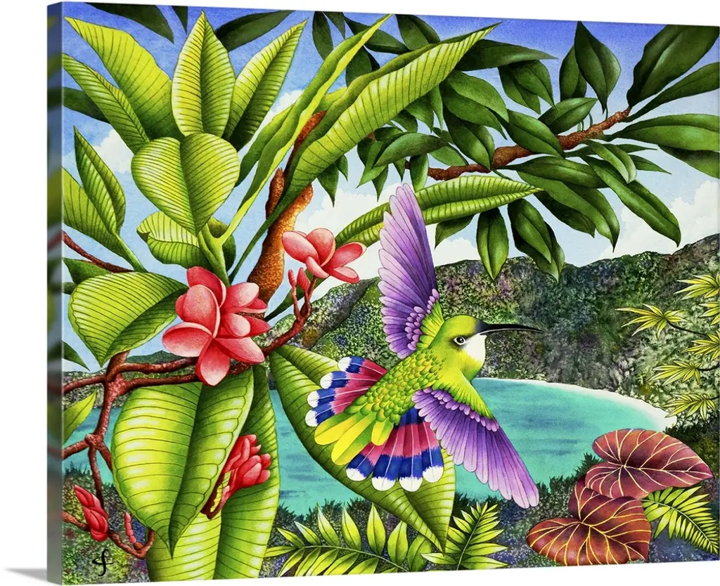 Tropical themed artwork using bright vivid colors to depict the flowers and animals of the environment.