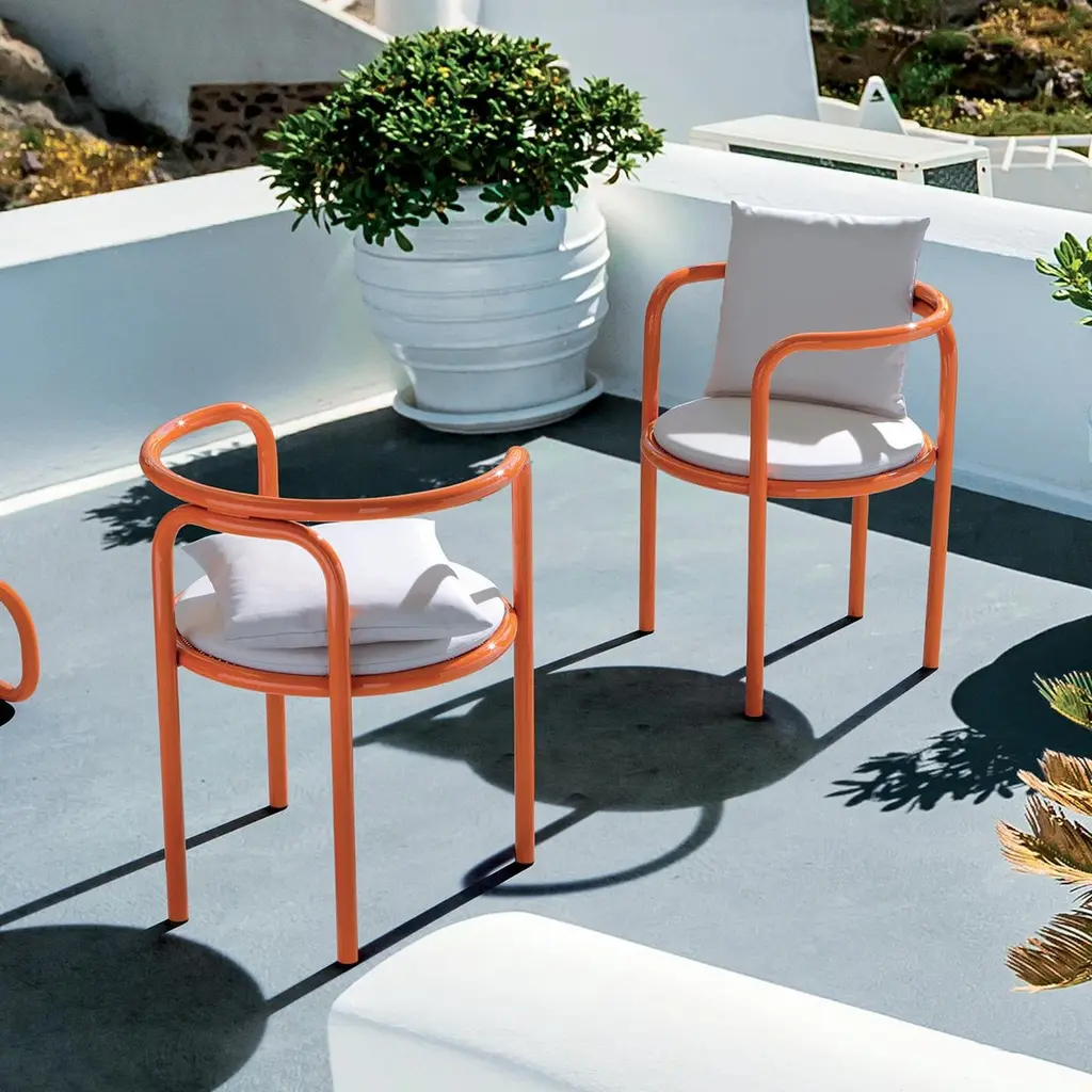 The perfect piece to add color and personality to a patio, garden or pool area, this chair of the Locus Solus collection merges functional design with a unique aesthetic. Originally designed in 1964 by Italian architect Gae Aulenti and re-edited in 2016 by Exteta, the bright orange frame is composed of two steel rods, one forming front legs, armrests, and backrest in one continuous line, and the other creating the back legs. The round padded seat features a removable fabric cover printed with the exclusive Locus Solus artwork and is available also in all Exteta catalog fabric on request.