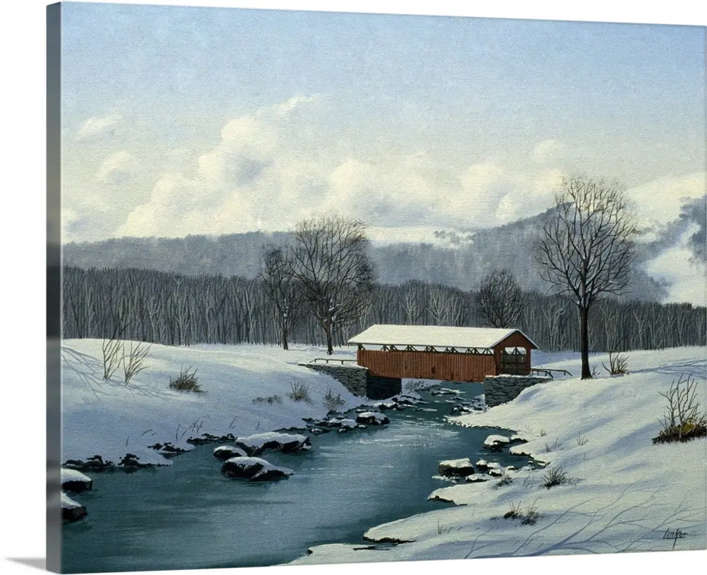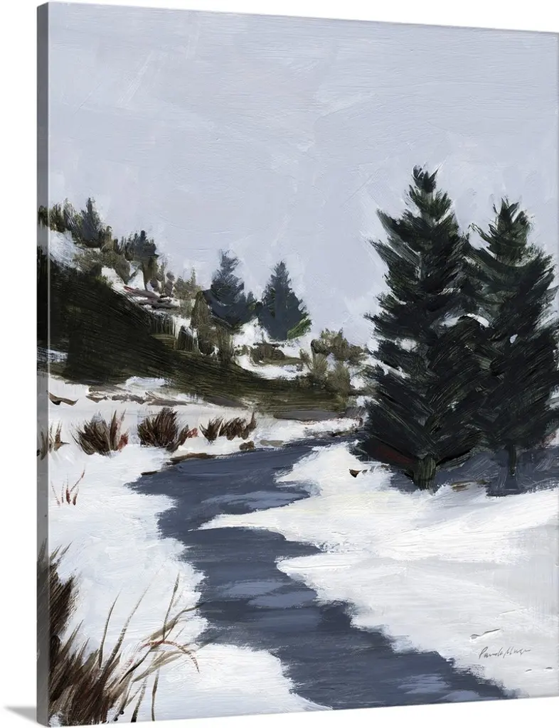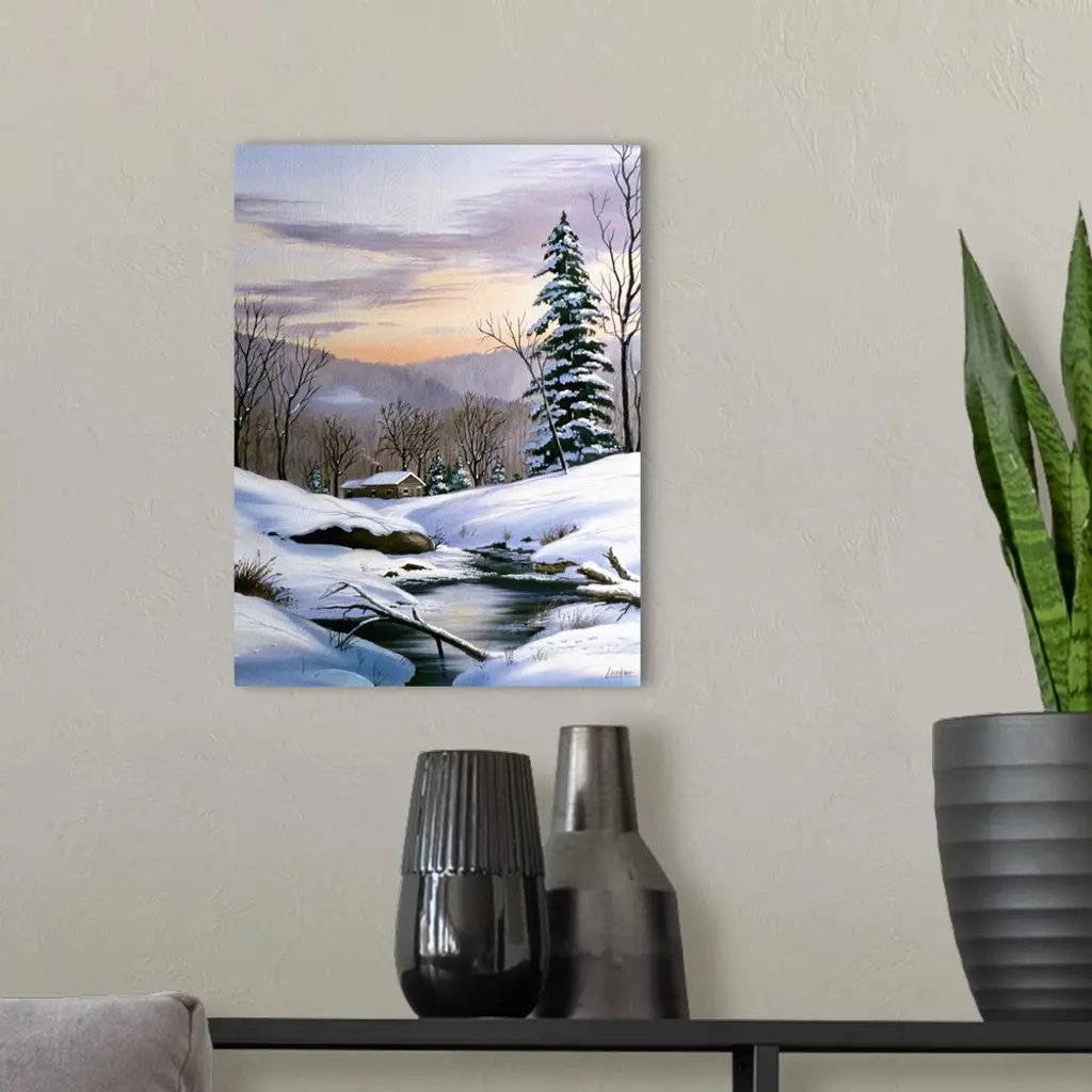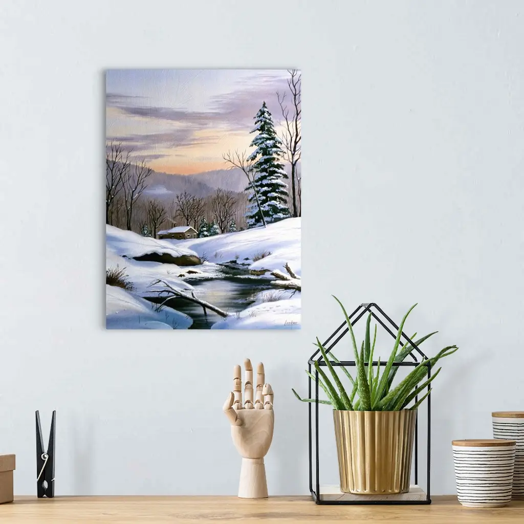 Contemporary painting of a cabin in the woods by a stream after a heavy snowfall.