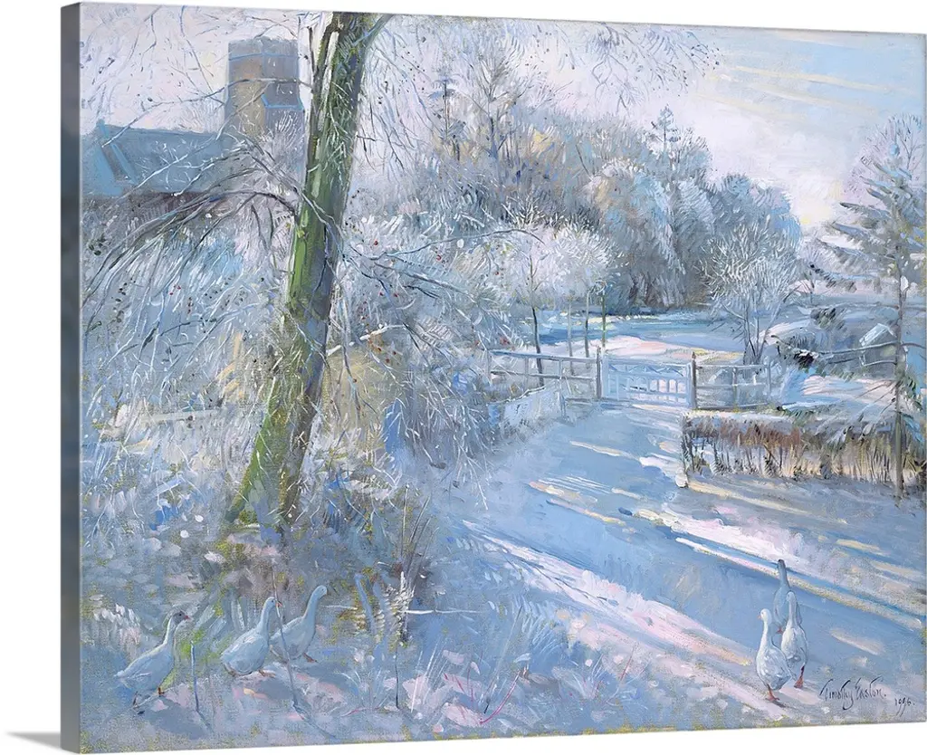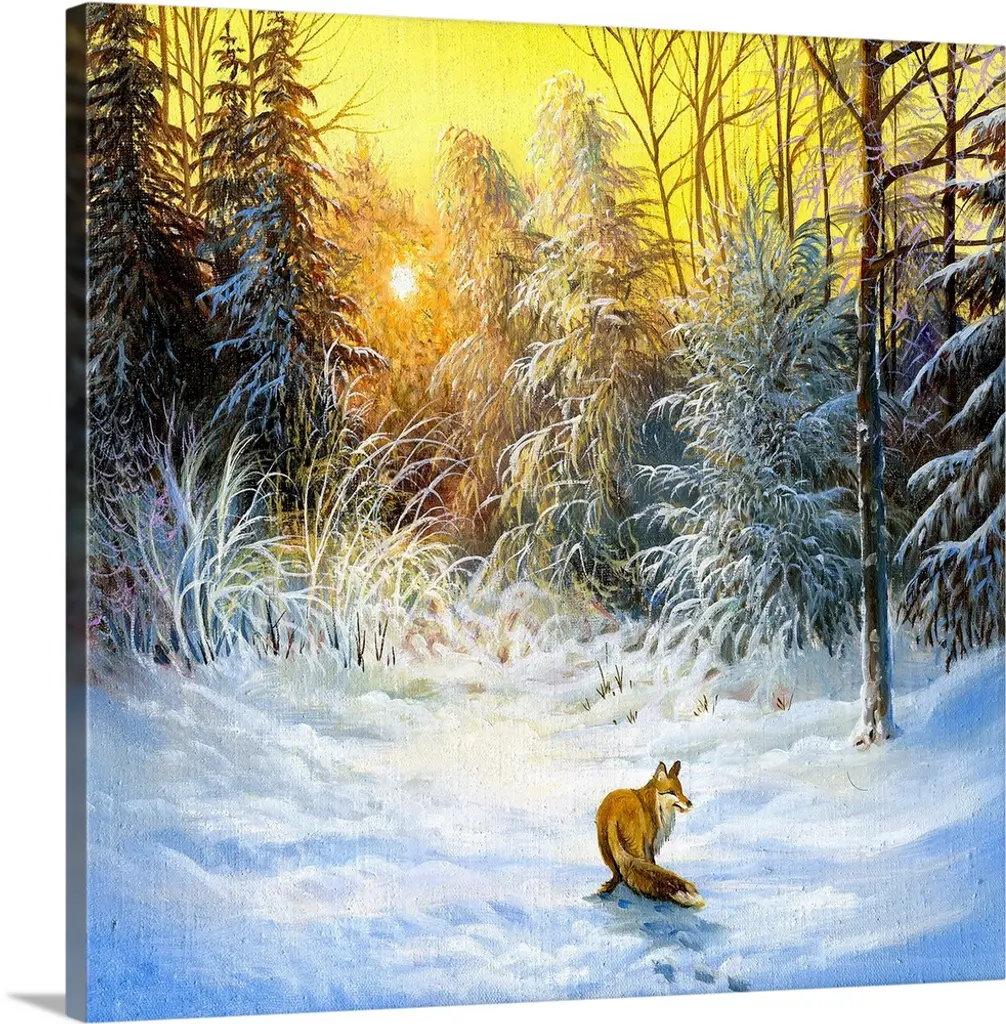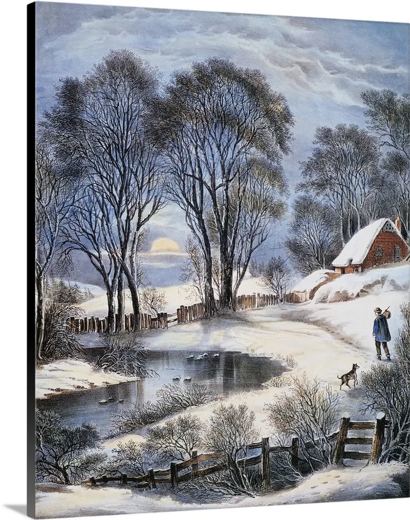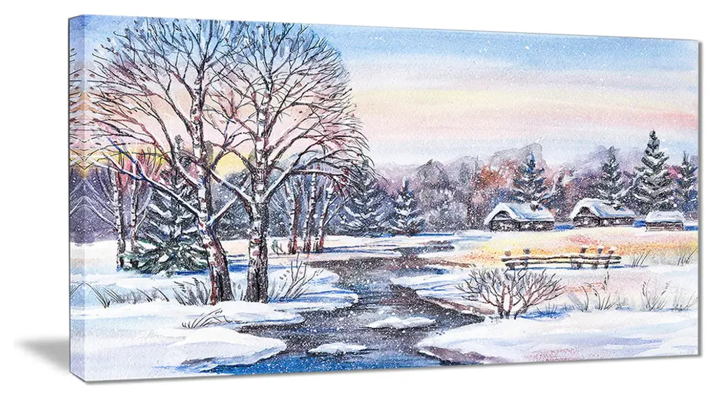 Contemporary painting of a cabin in the woods by a stream after a heavy snowfall.